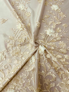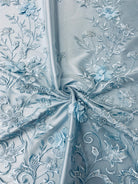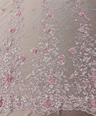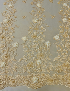 Embroidery and 3D flowers on transparent mesh 54" wide with slight vertical two way stretch.