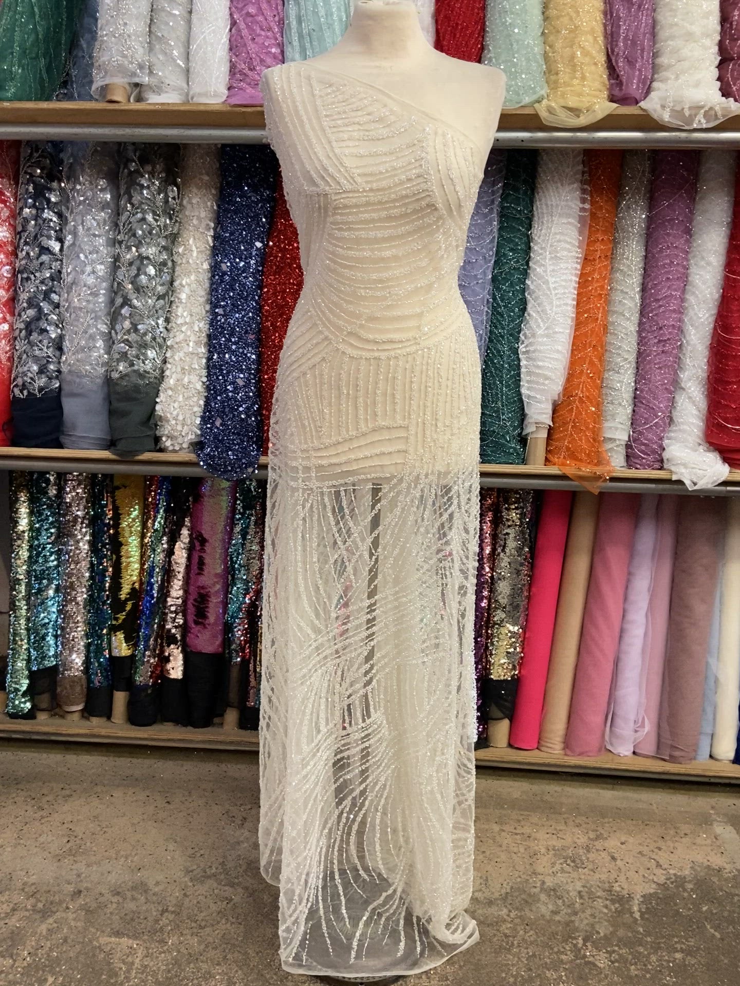 Hand beaded mesh with slight vertical two way stretch 54" wide