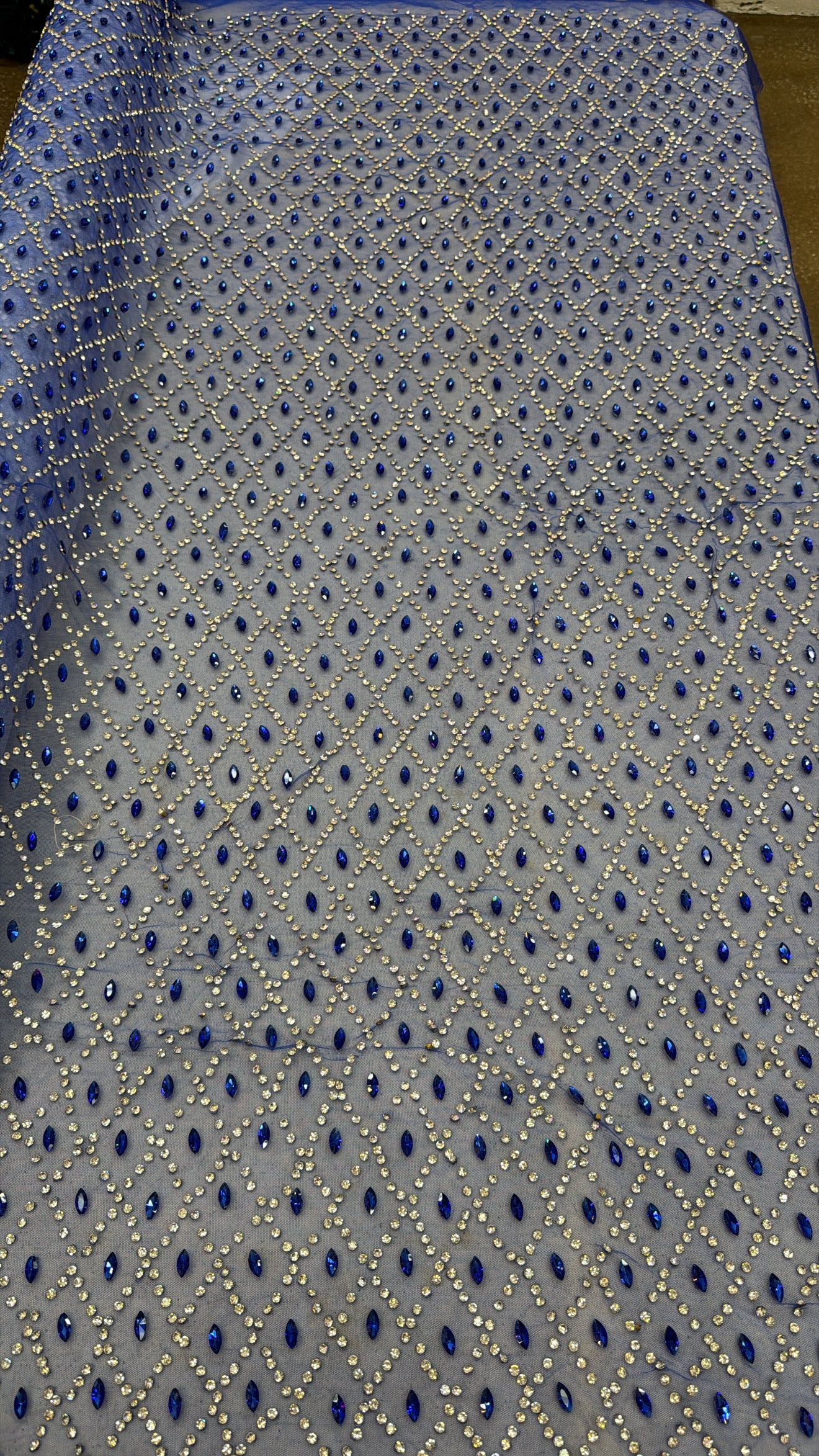 Intricate stones and deep blue lace, crafted to captivate every gaze.
