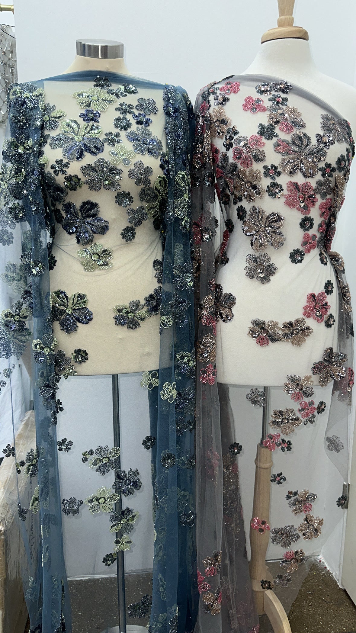 "Delicate floral embroidery cascades across soft tulle in a breathtaking interplay of color and texture, perfect for ethereal gowns and romantic creations."
