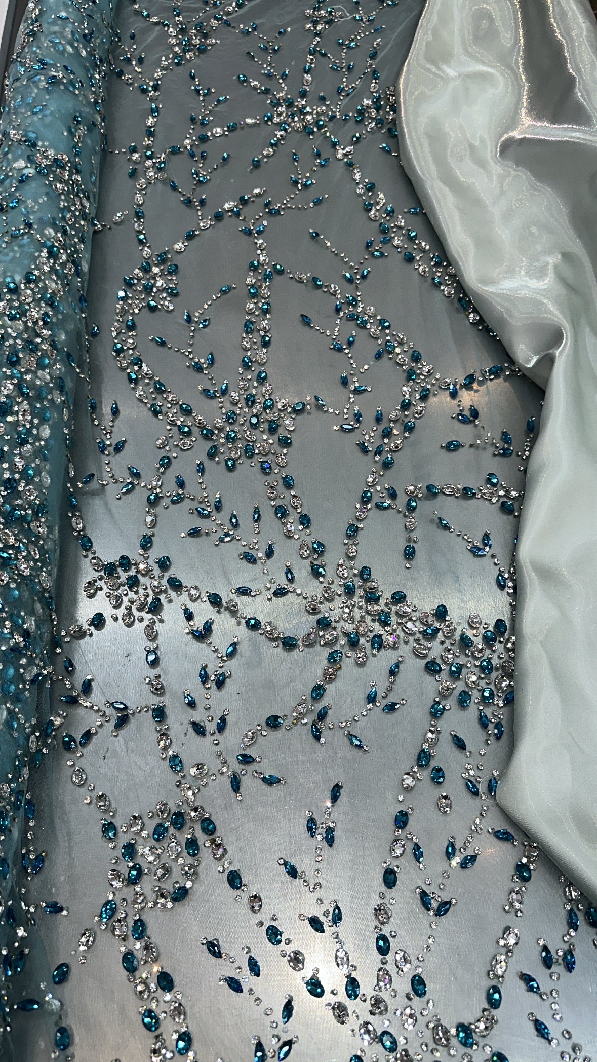 Dazzle with elegance in this exquisite stone beaded lace, featuring intricate patterns and shimmering embellishments, perfect for creating statement outfits.
