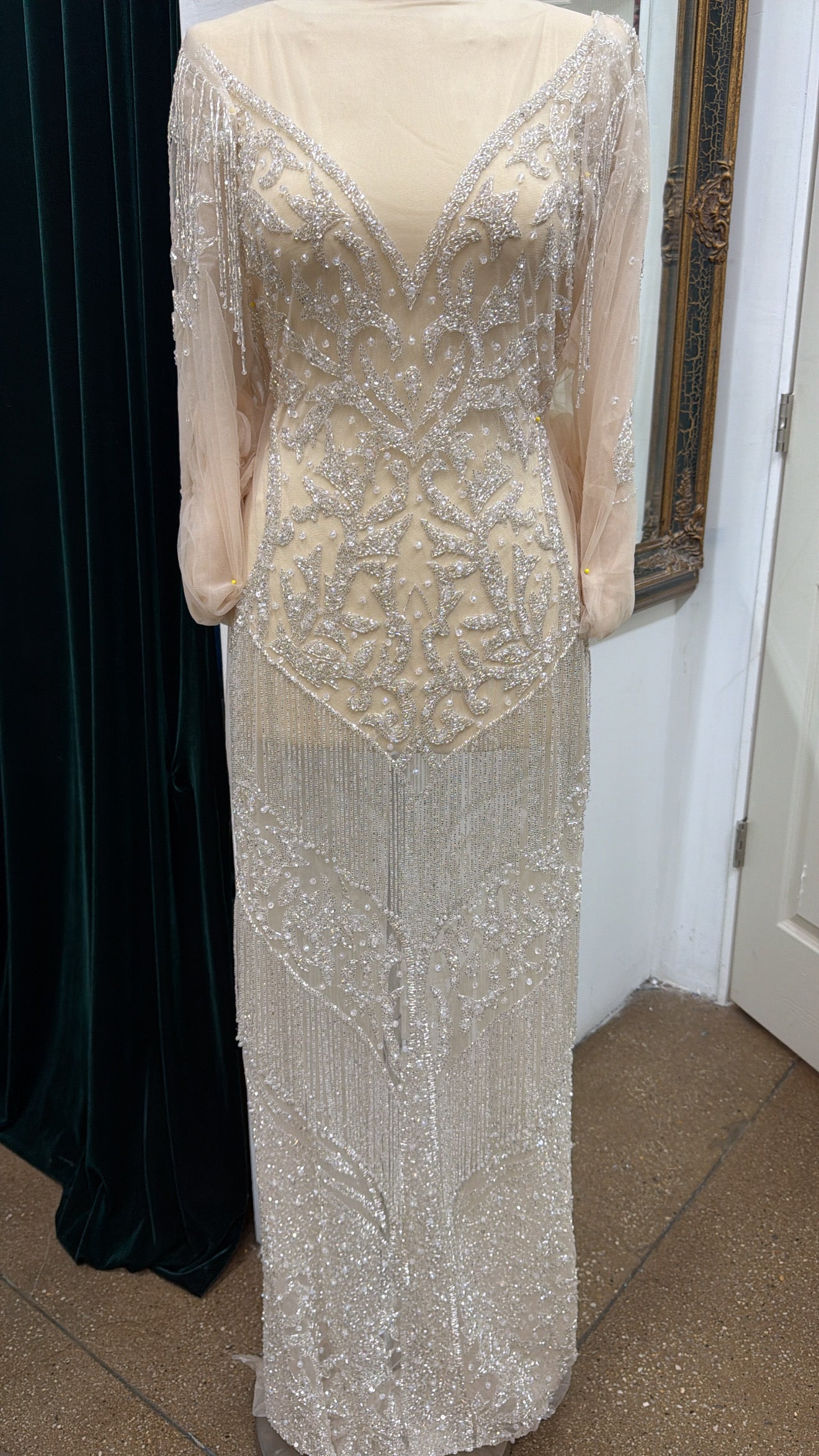 A soft blush panel adorned with fluid fringe detailing, creating graceful movement with every step. Feminine, luminous, and effortlessly elegant, it captures the beauty of modern couture with a touch of golden allure.