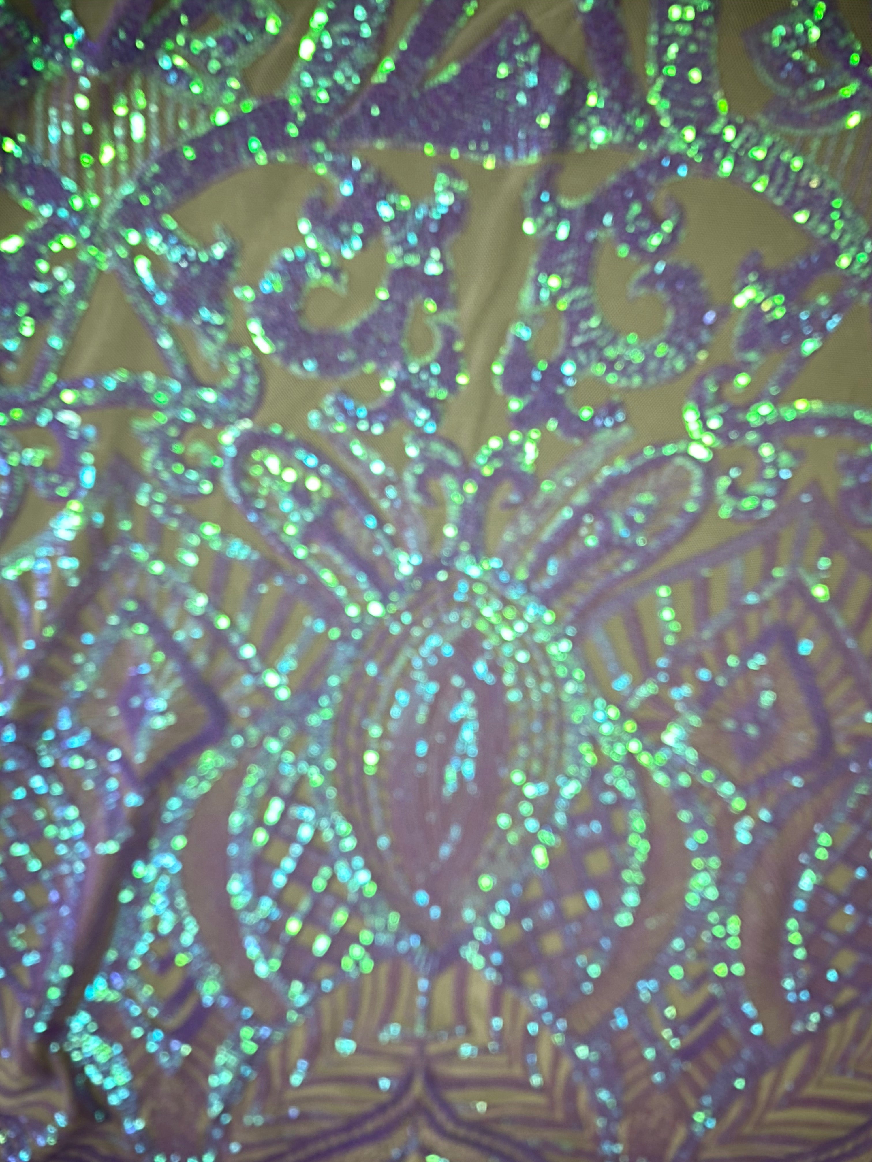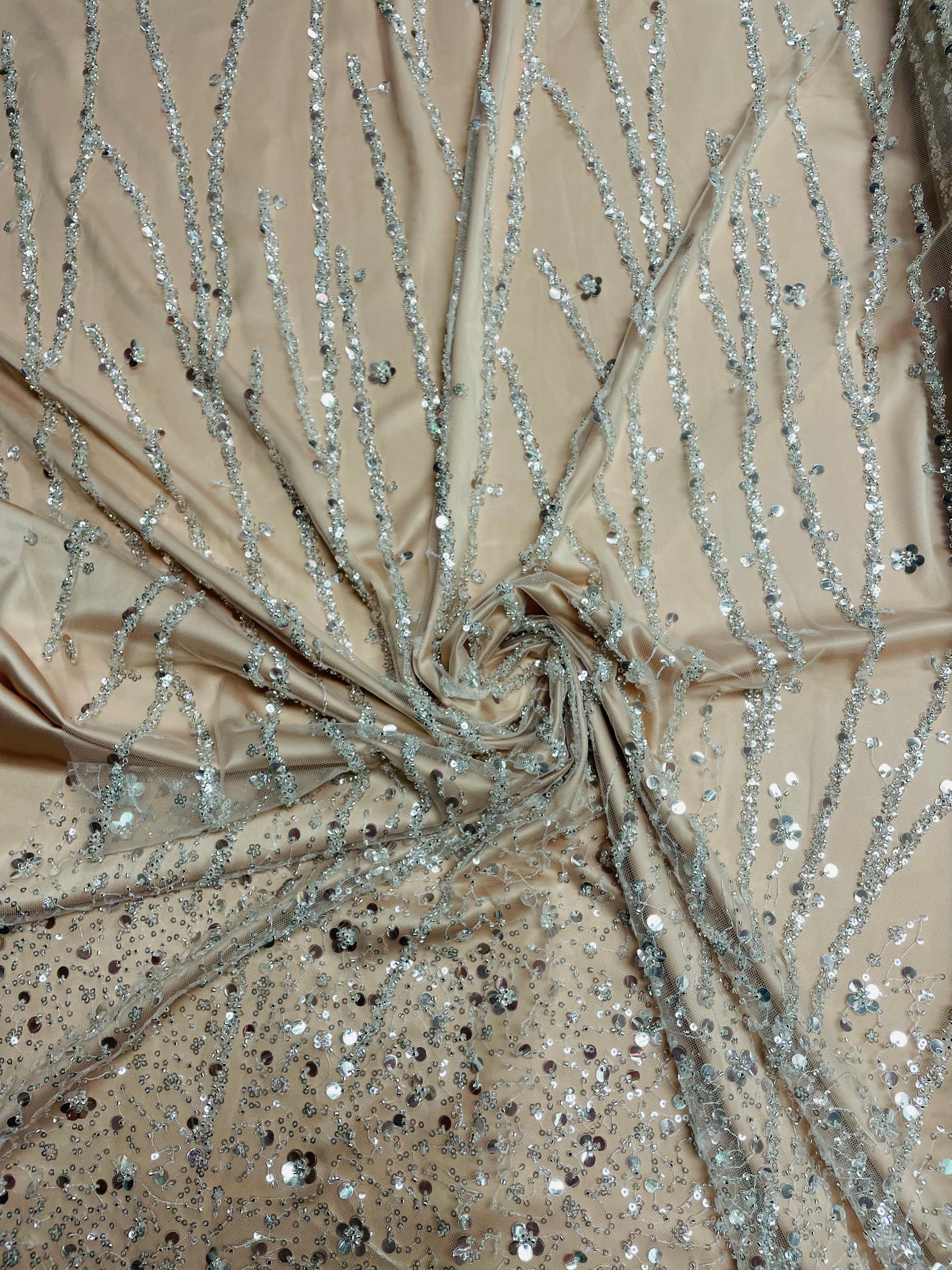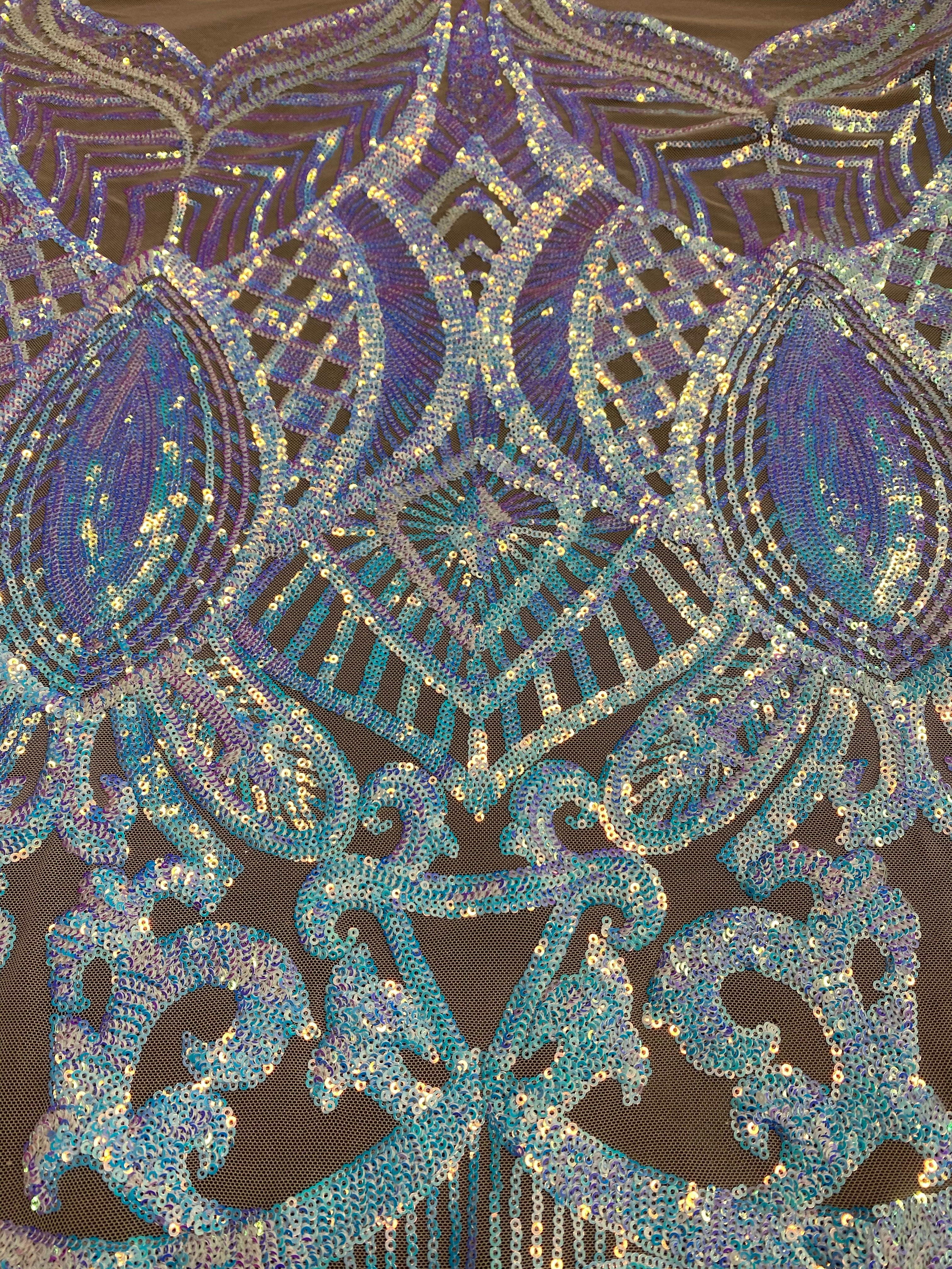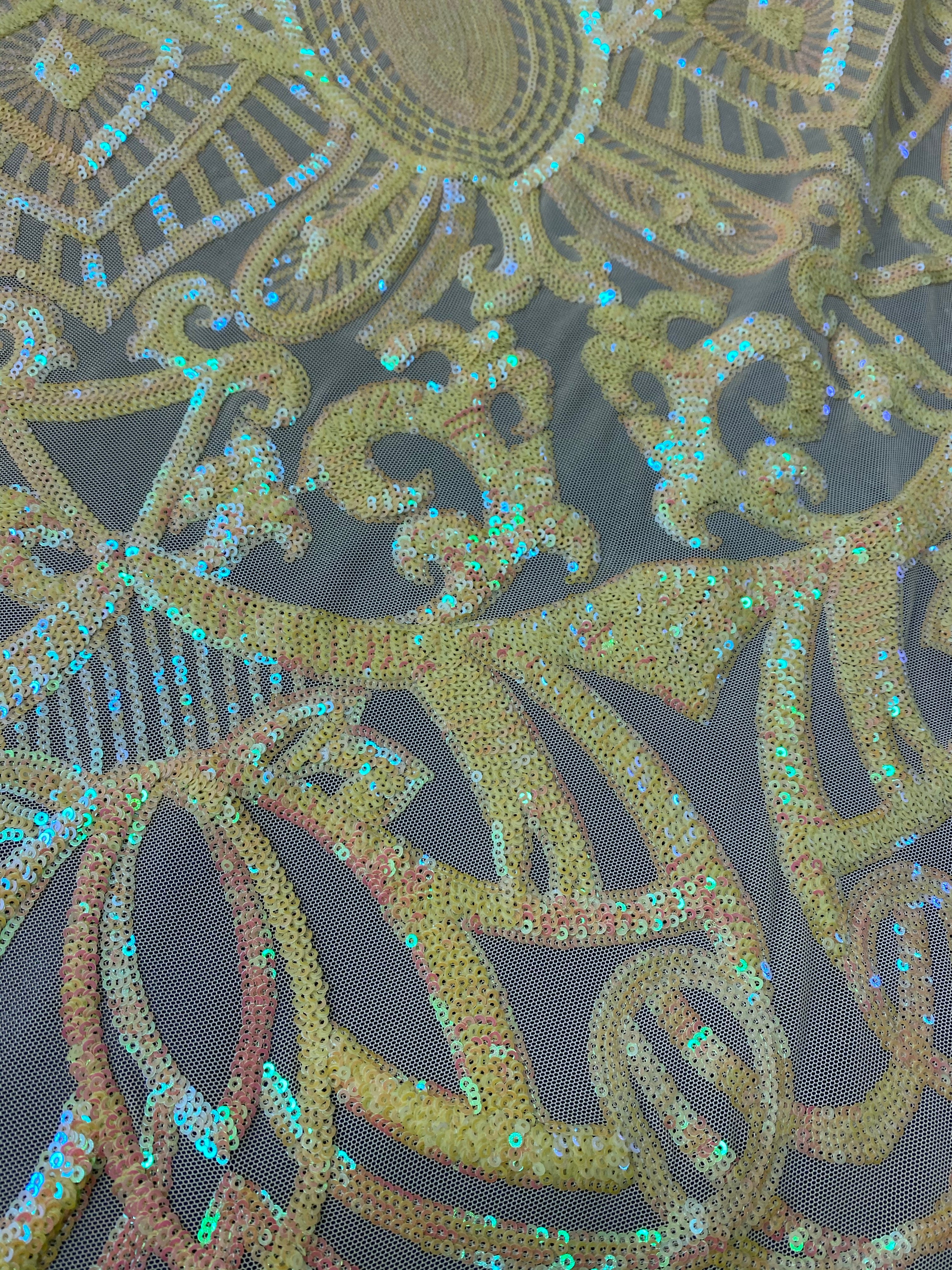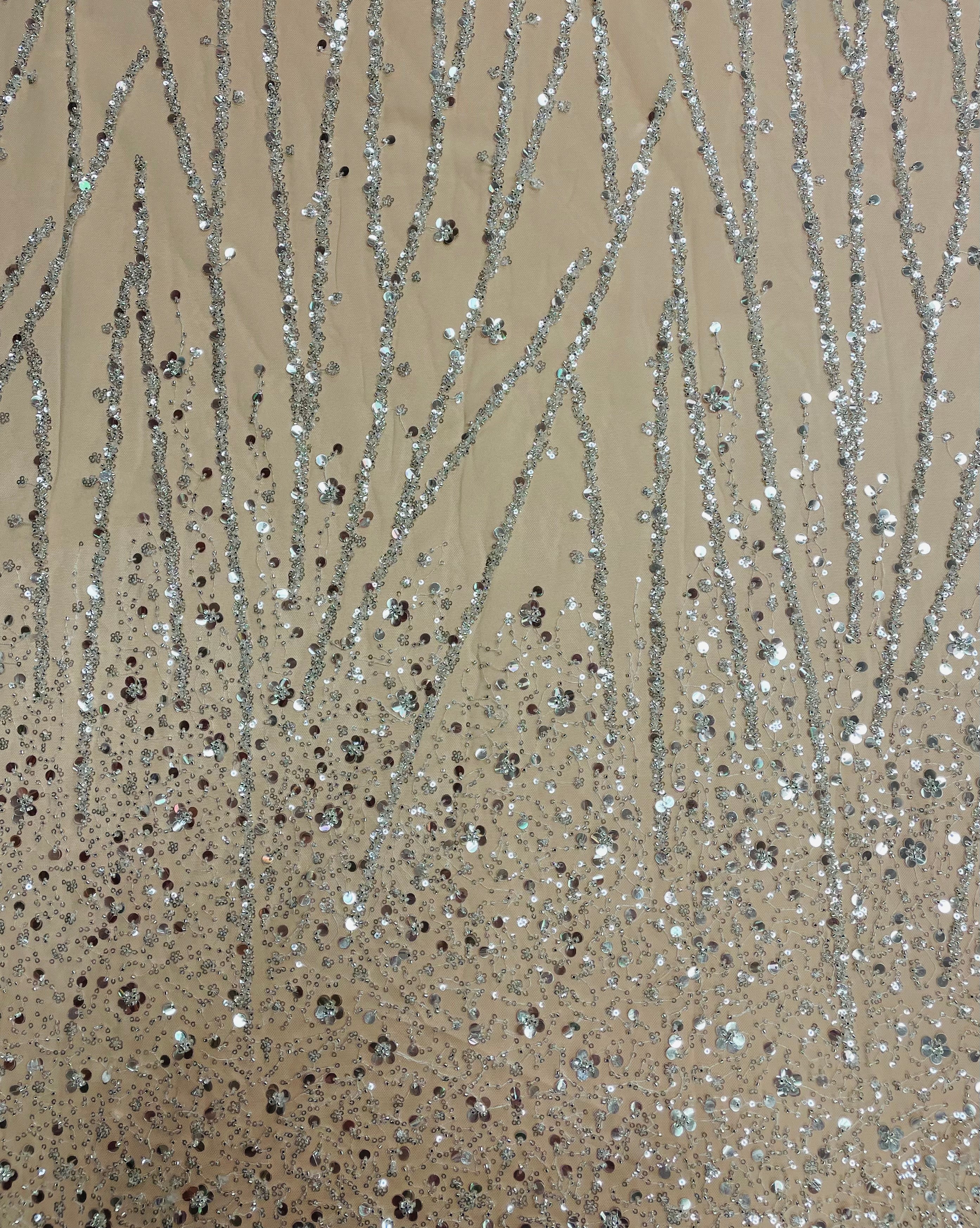 Firecracker Holographic Sequin Appliques on Nude Illusion mesh- 2 way stretch and 60" wide