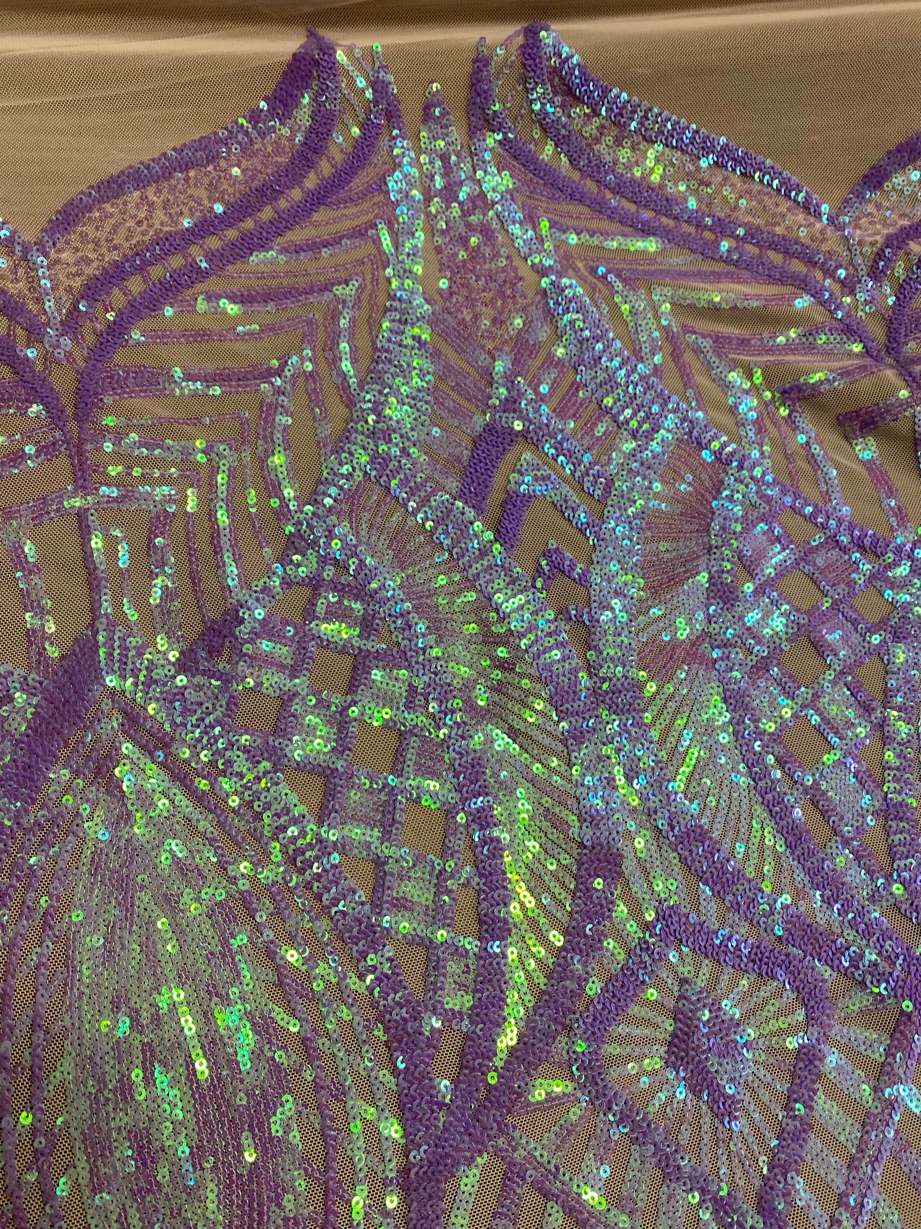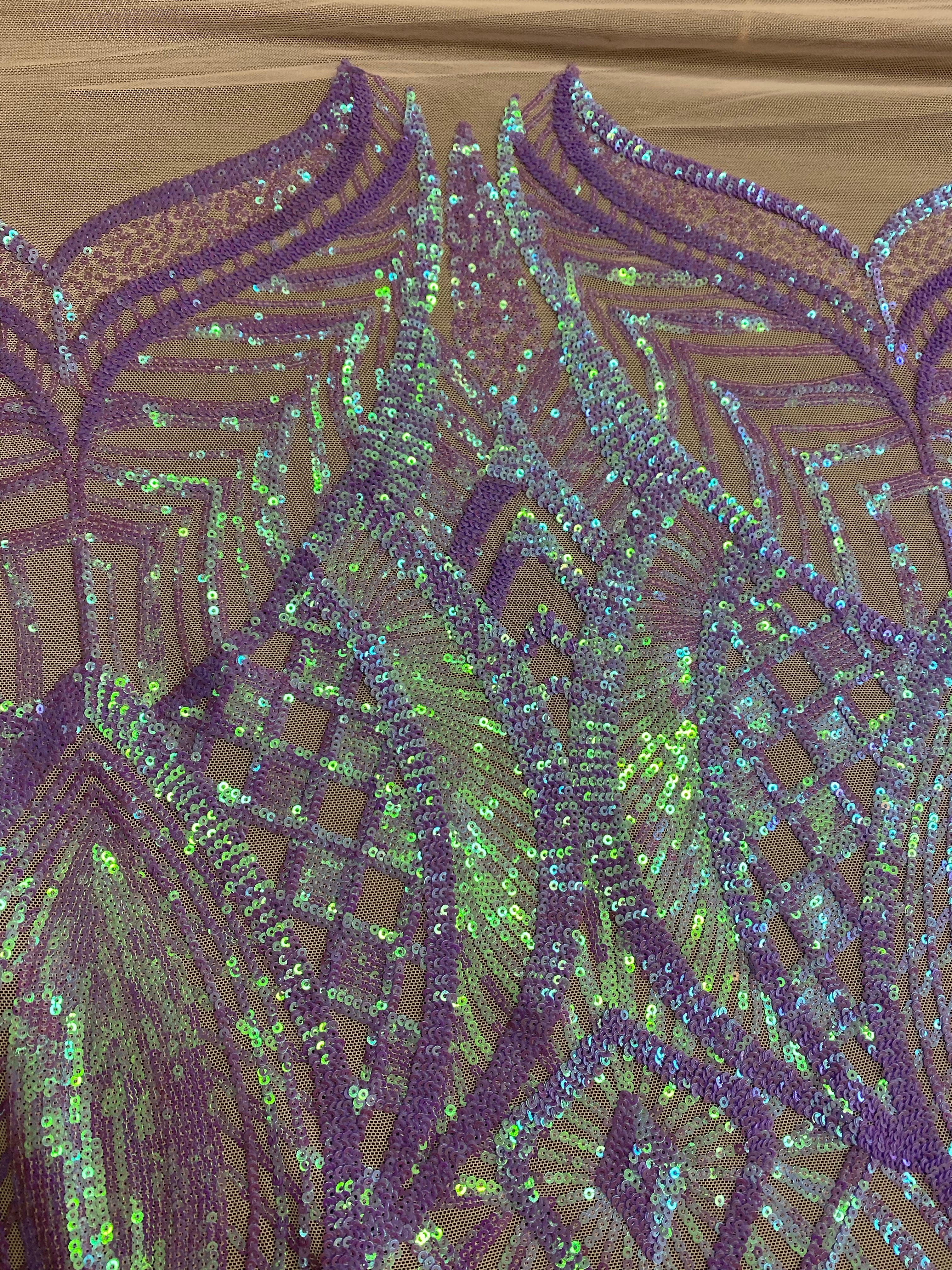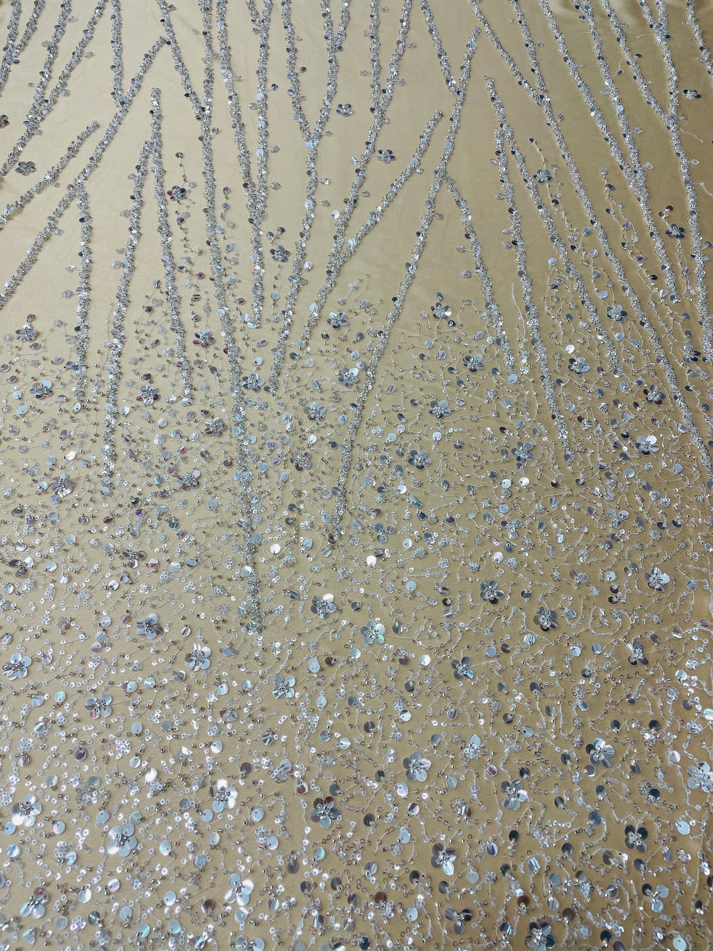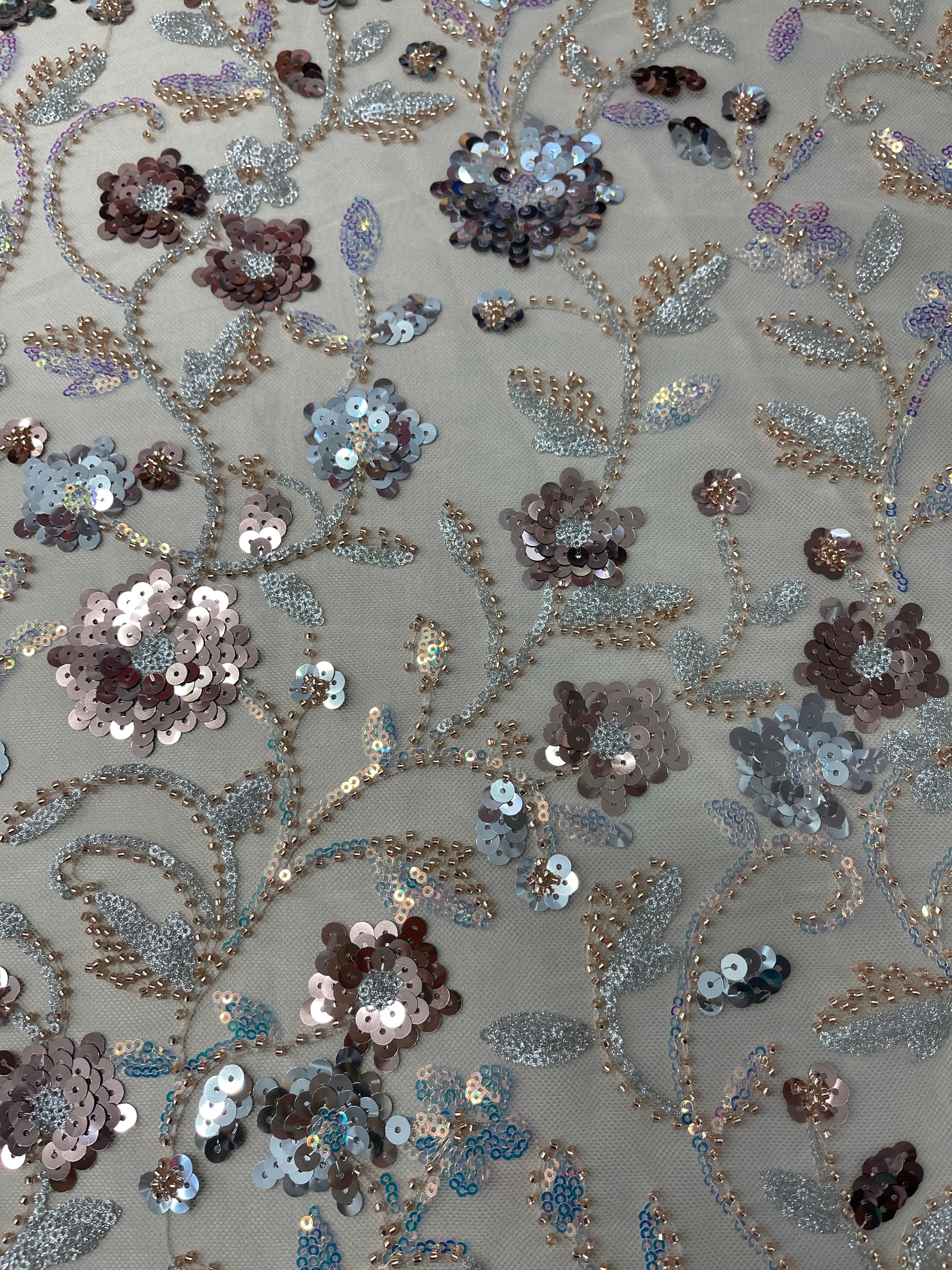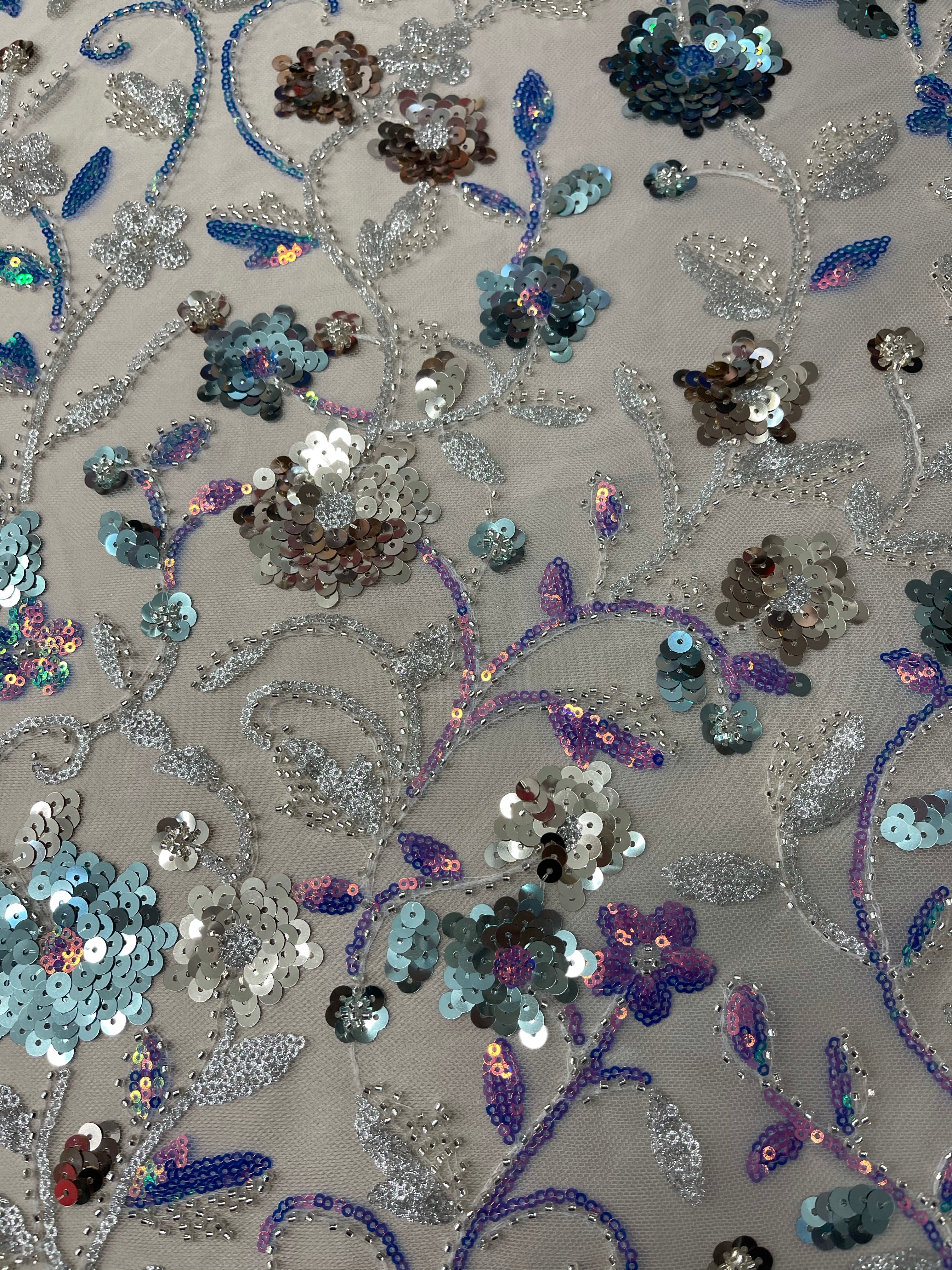 Firecracker Holographic Sequin Appliques on Nude Illusion mesh- 2 way stretch and 60" wide