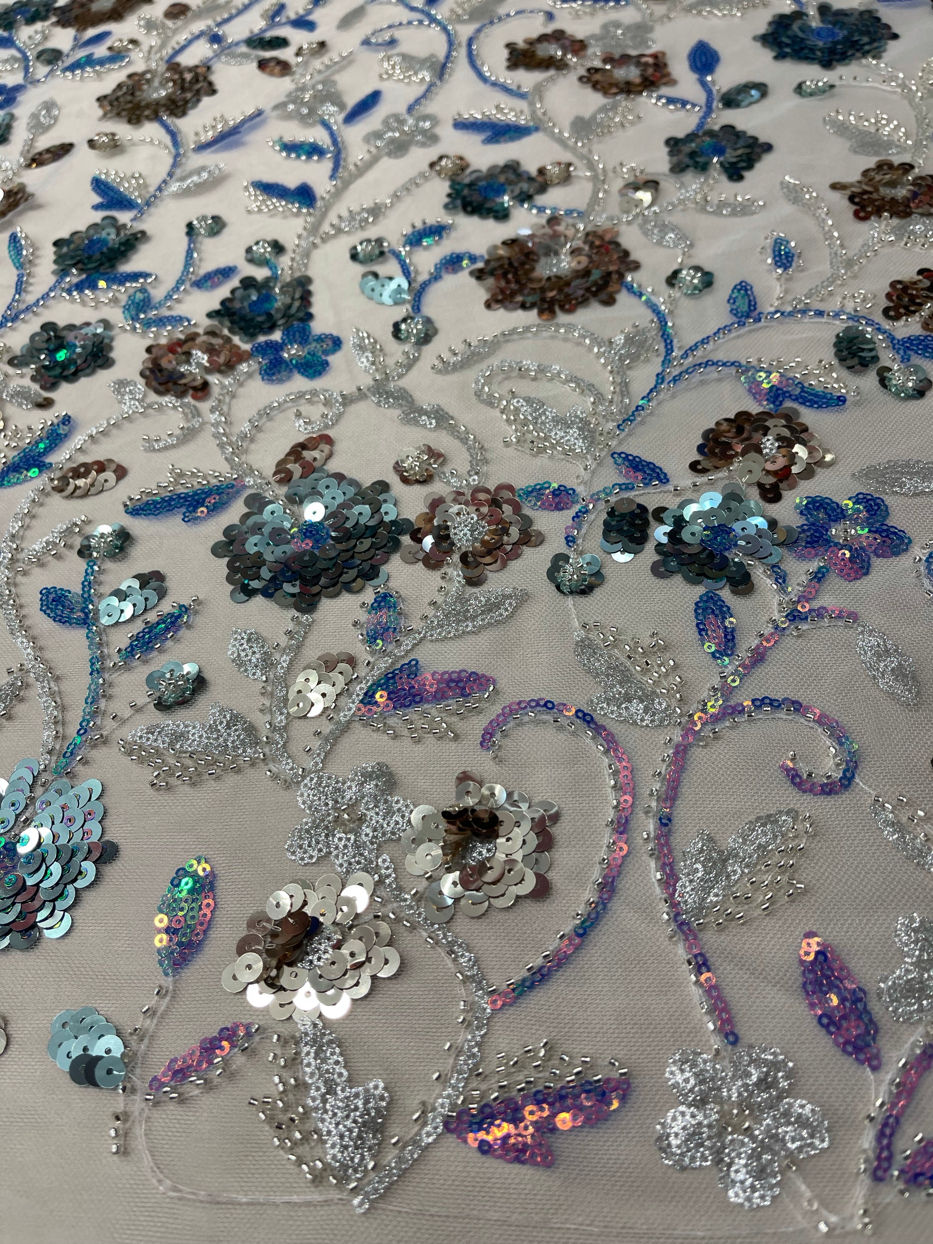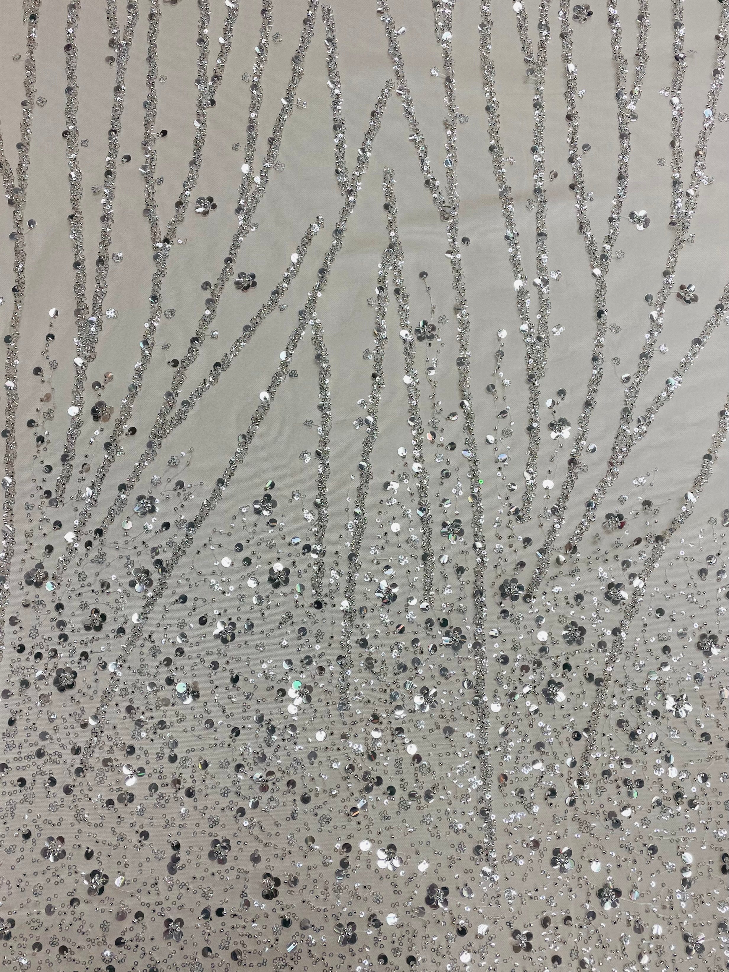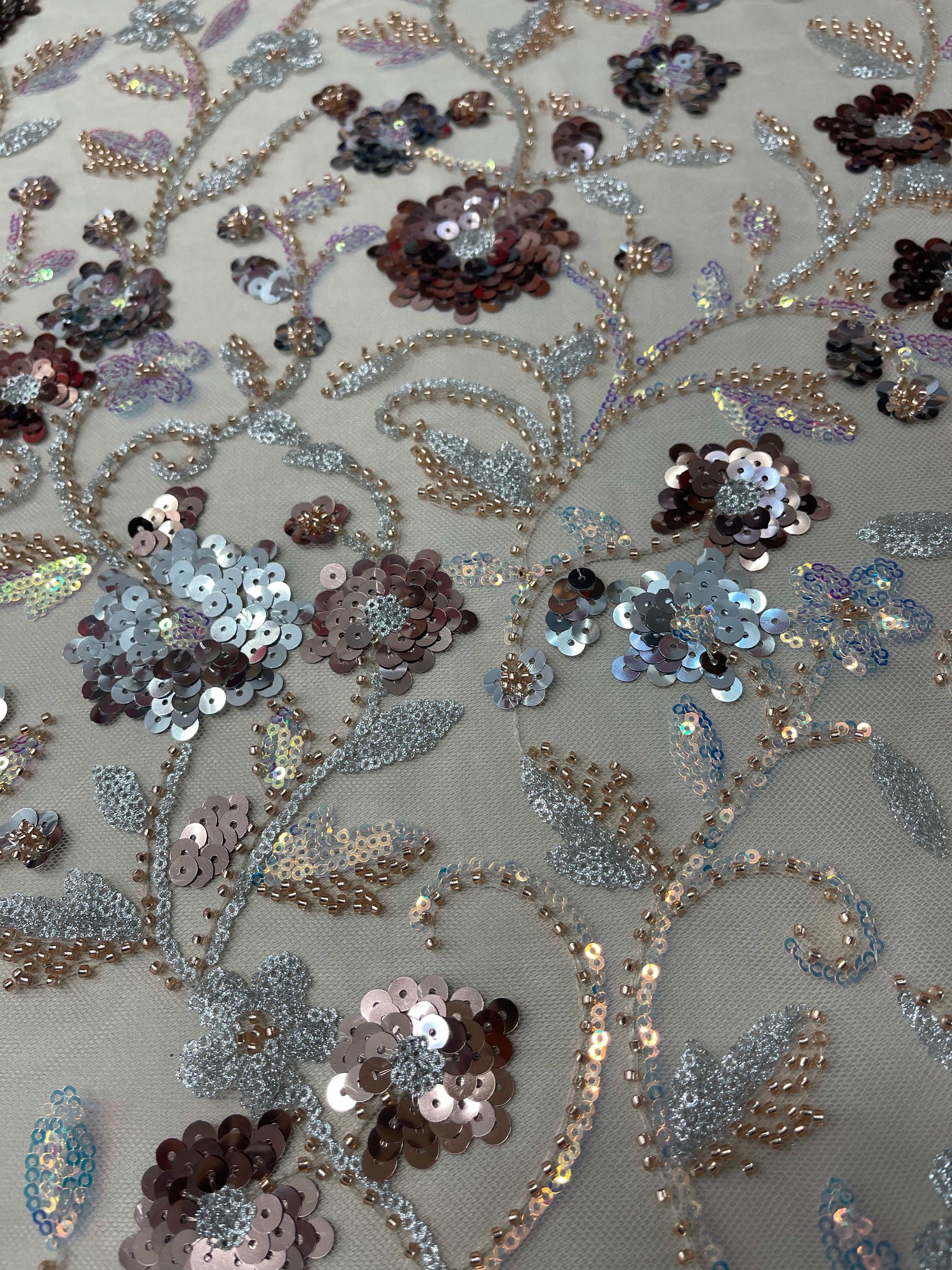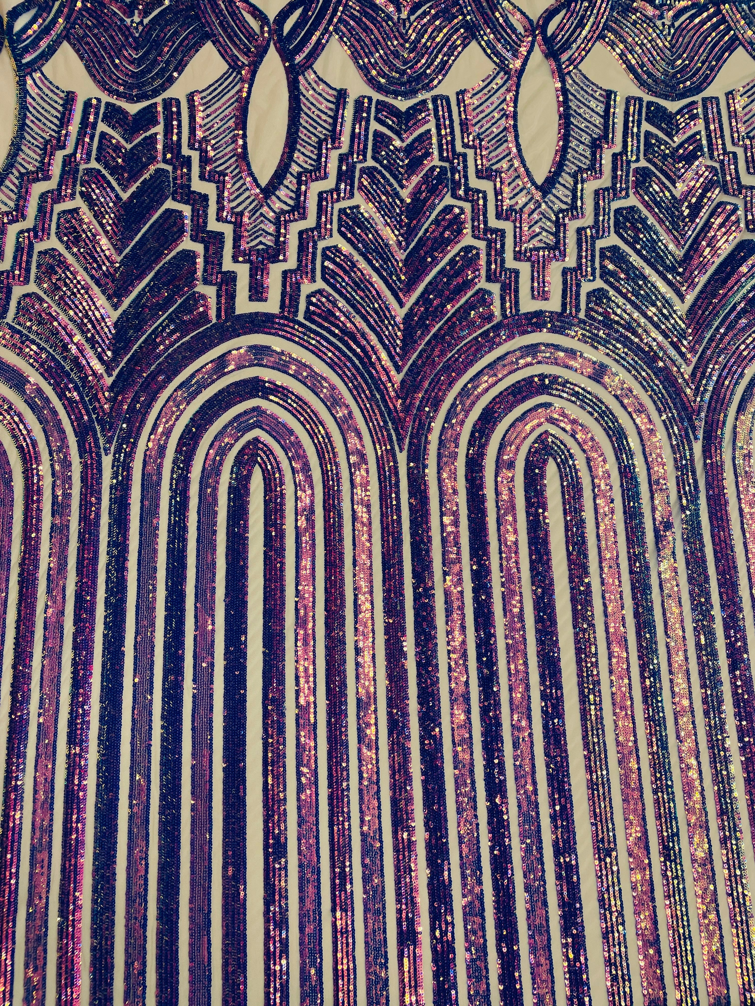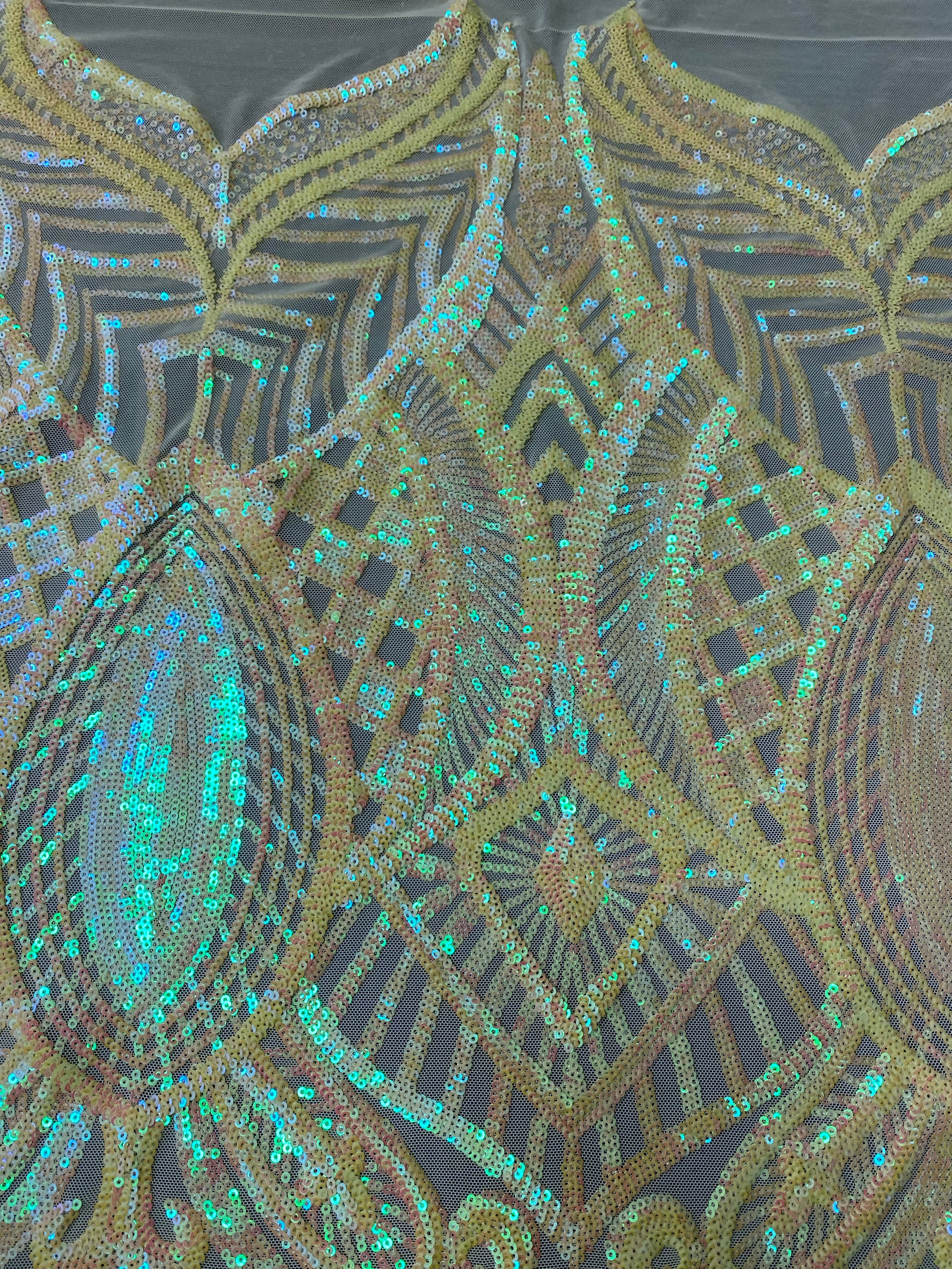 Firecracker Holographic Sequin Appliques on Nude Illusion mesh- 2 way stretch and 60" wide