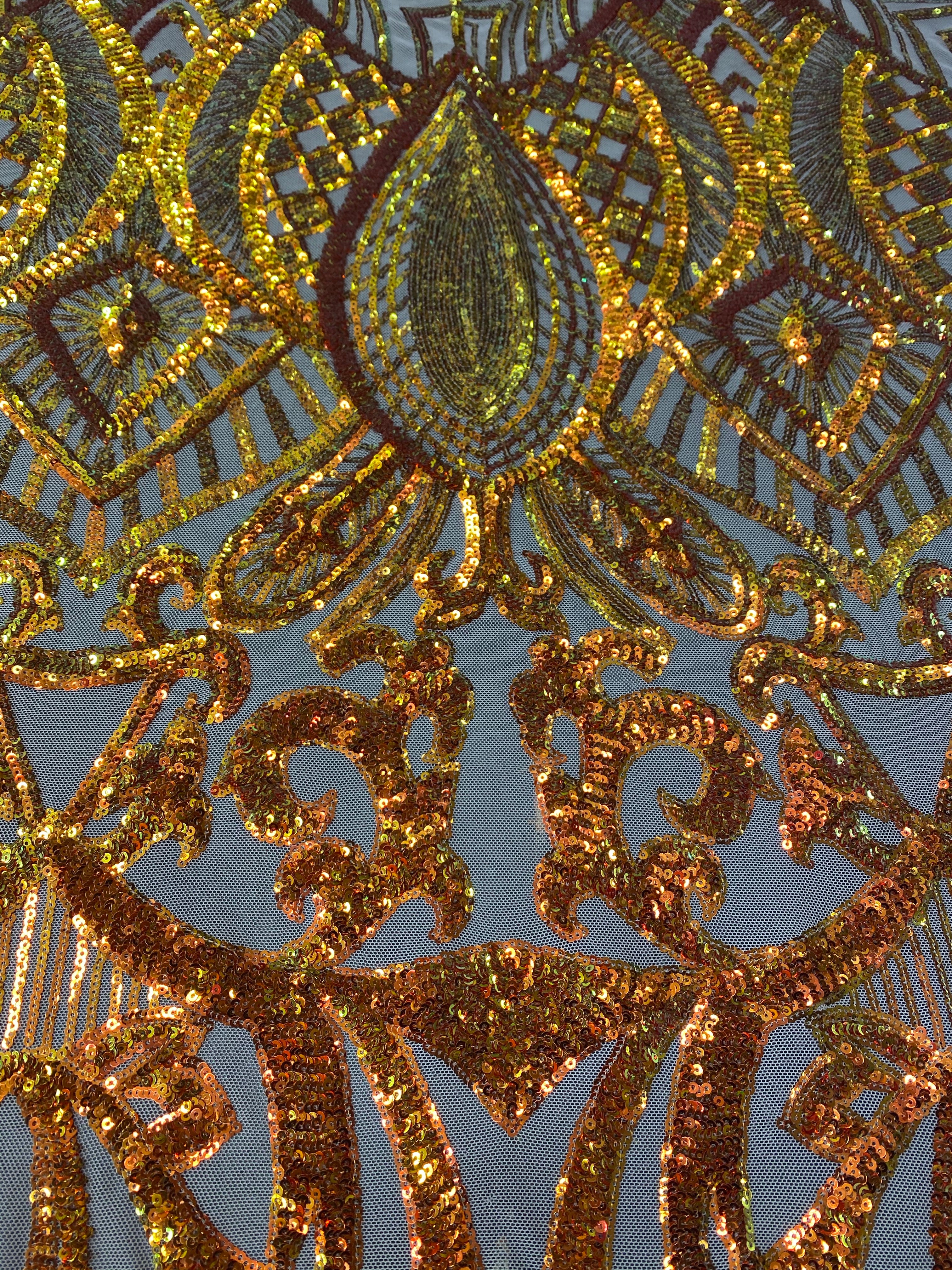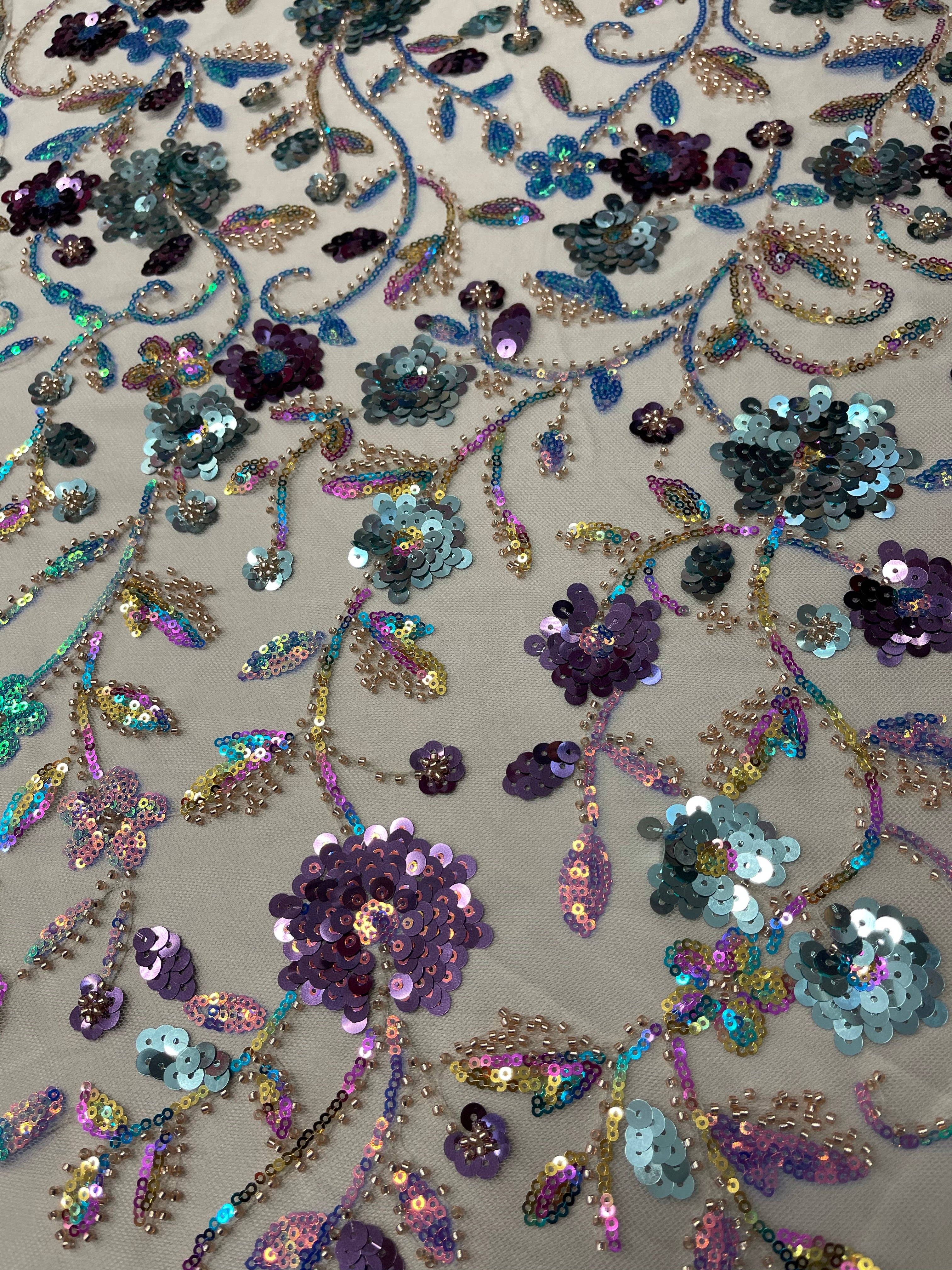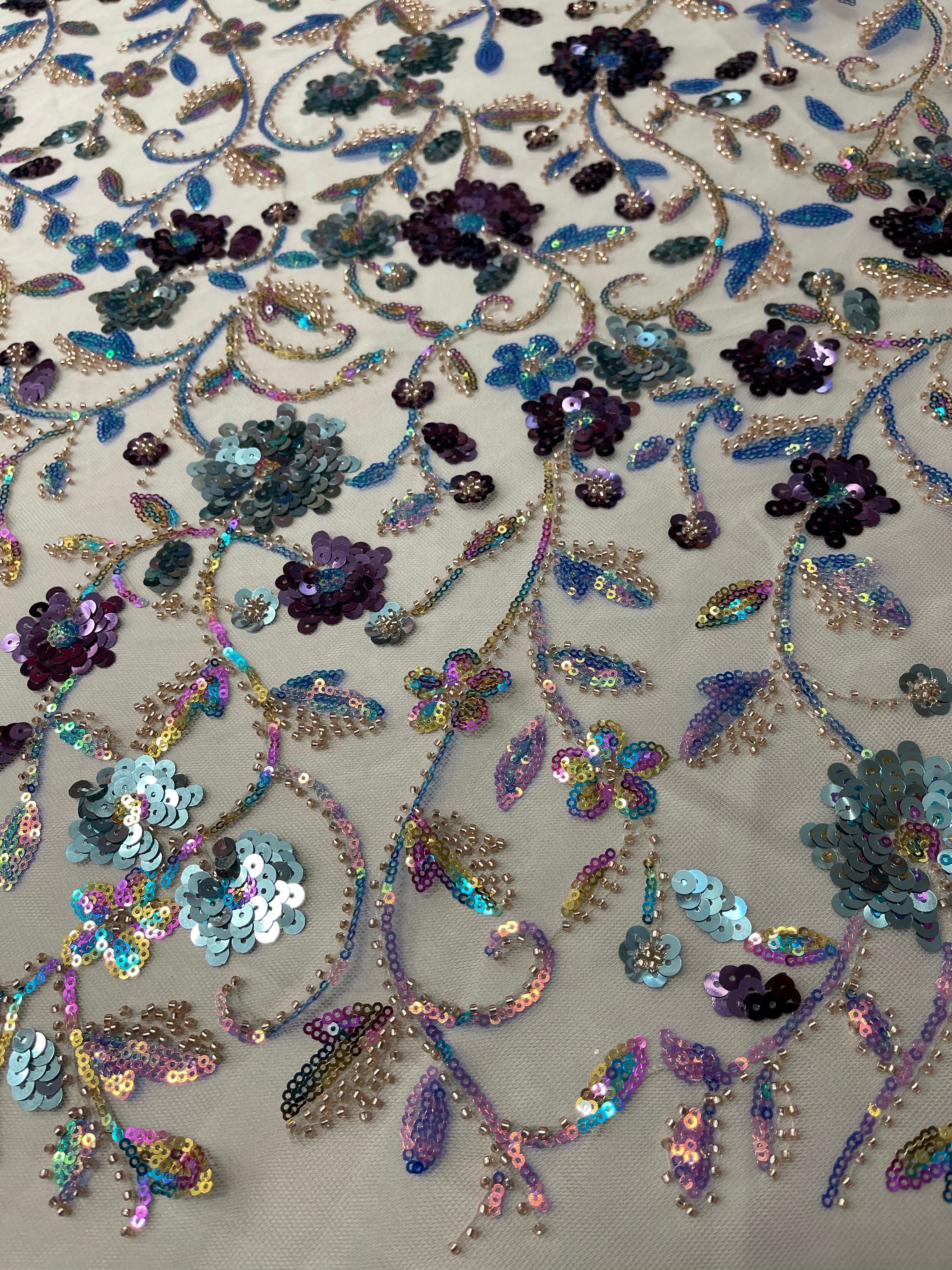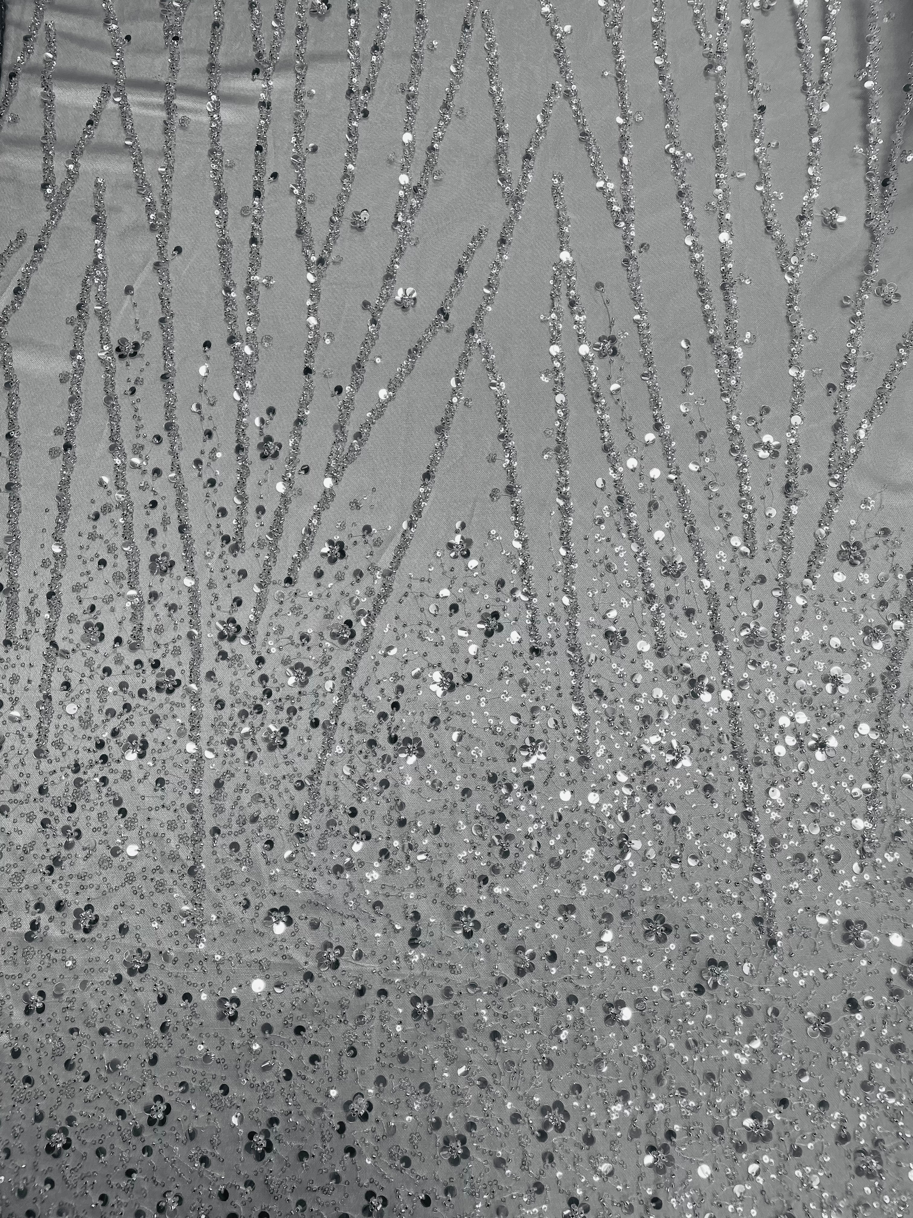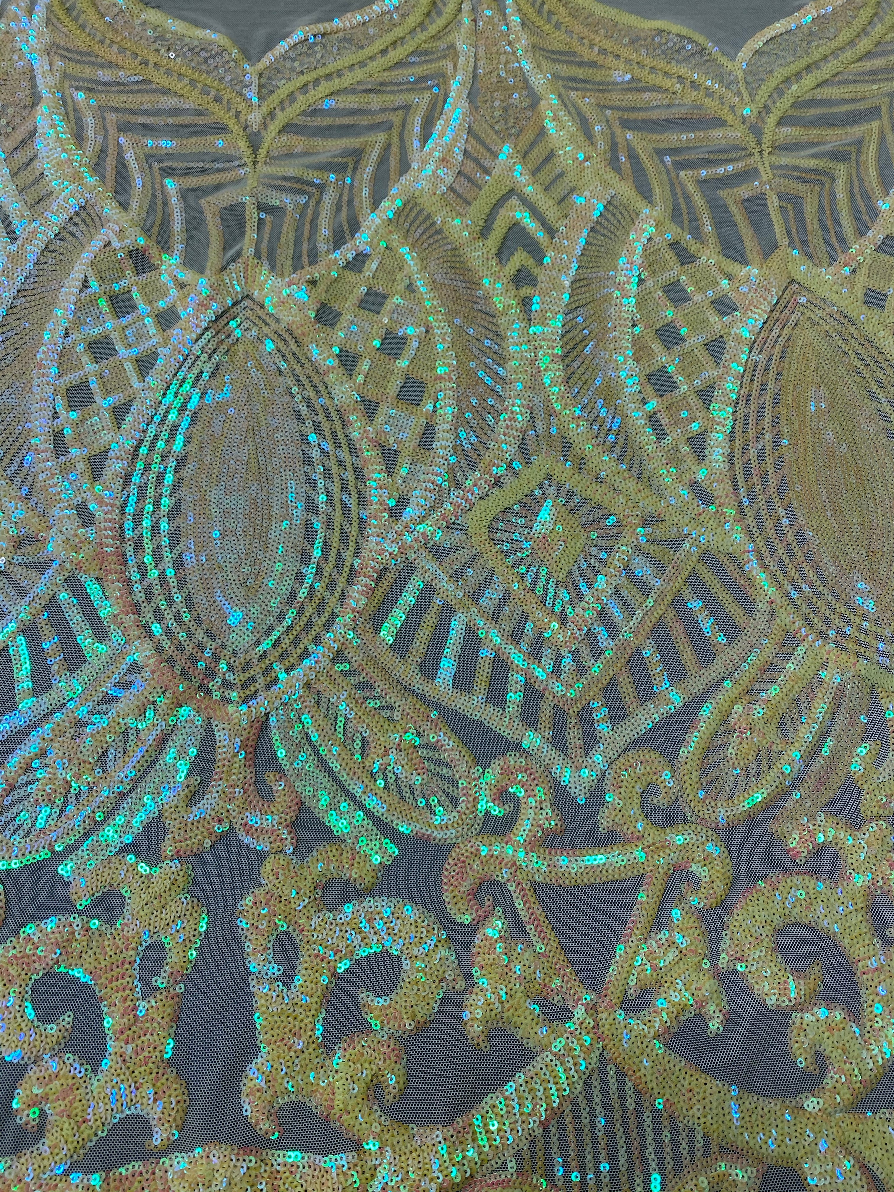 Firecracker Holographic Sequin Appliques on Nude Illusion mesh- 2 way stretch and 60" wide