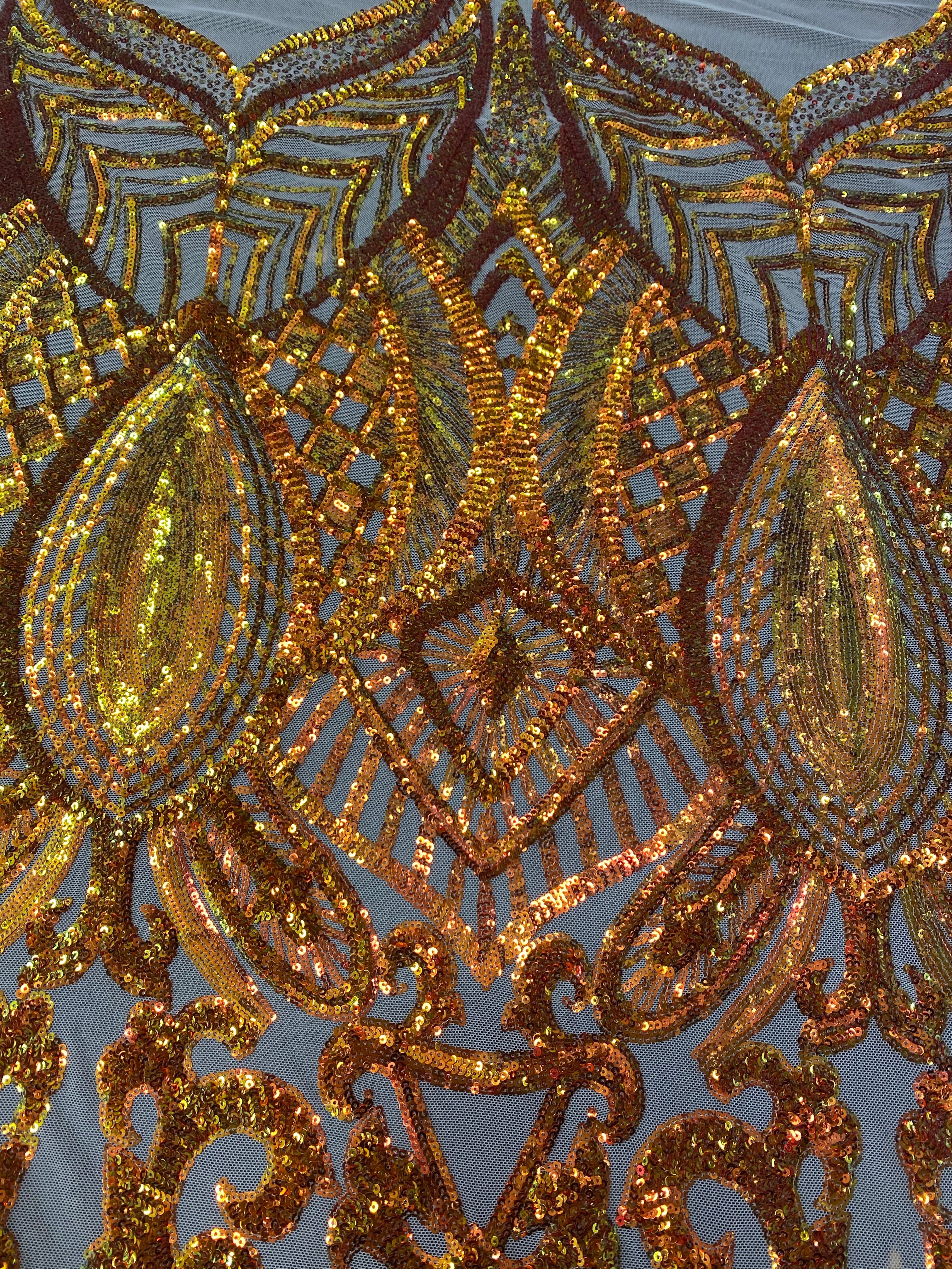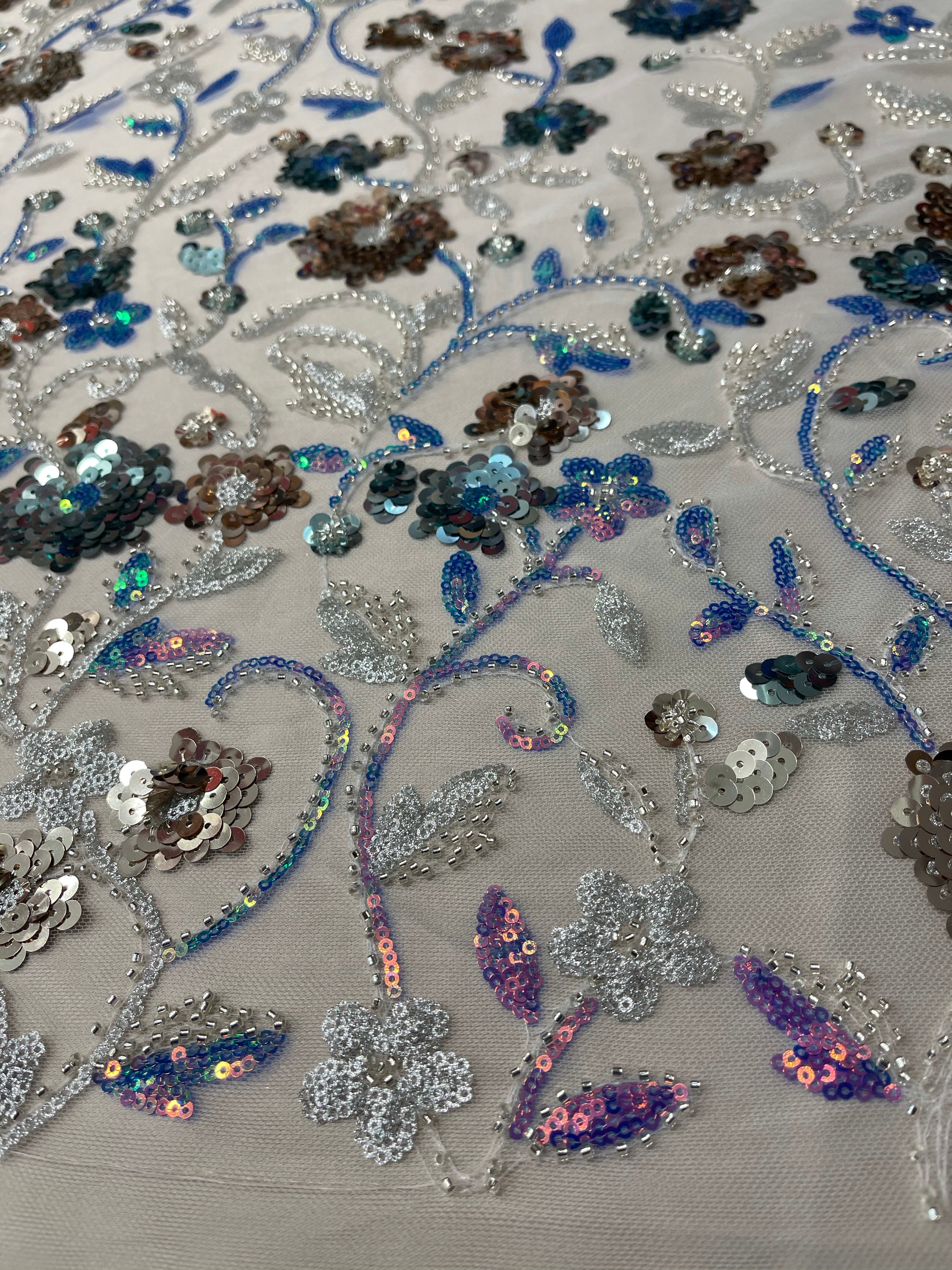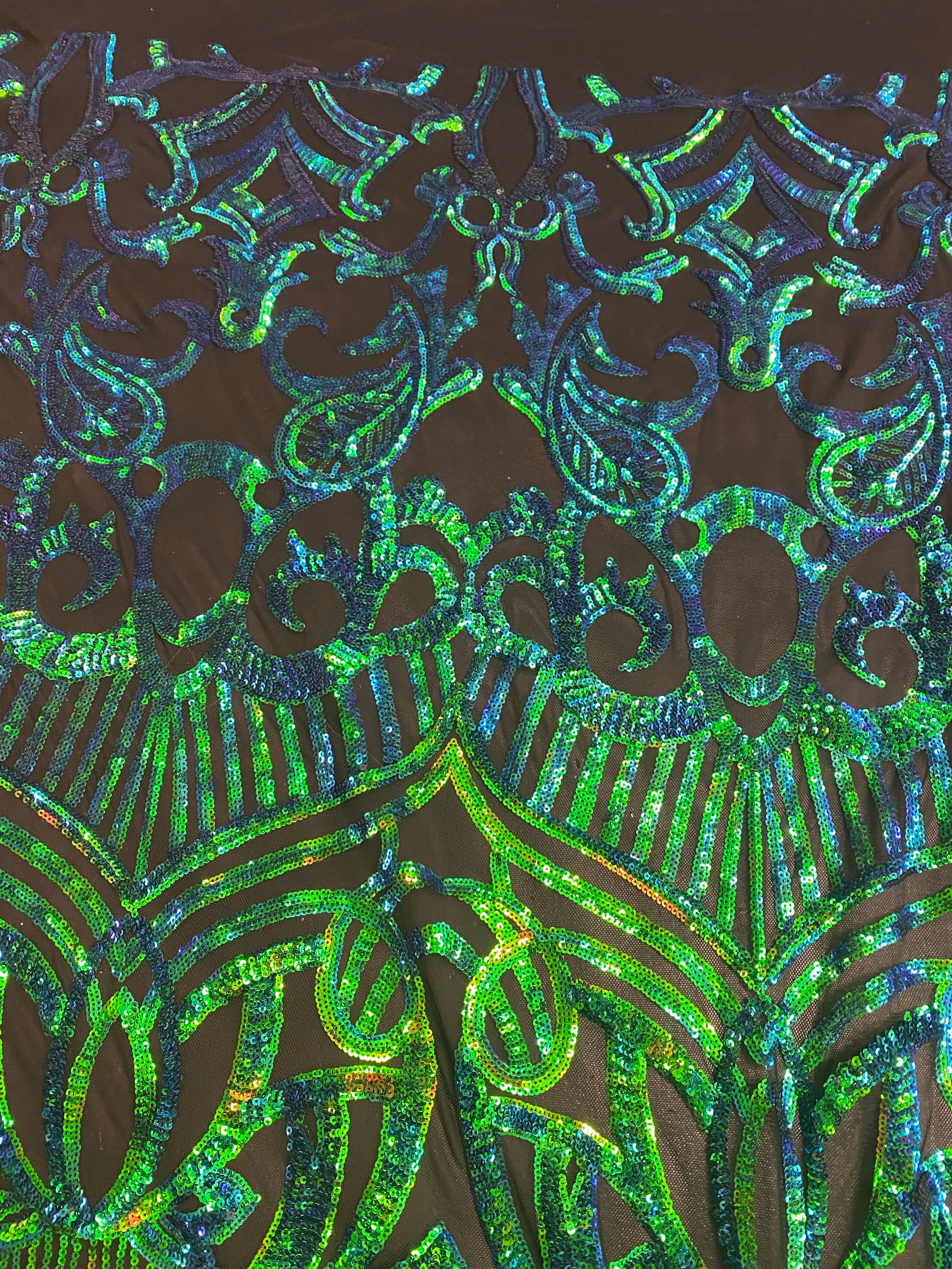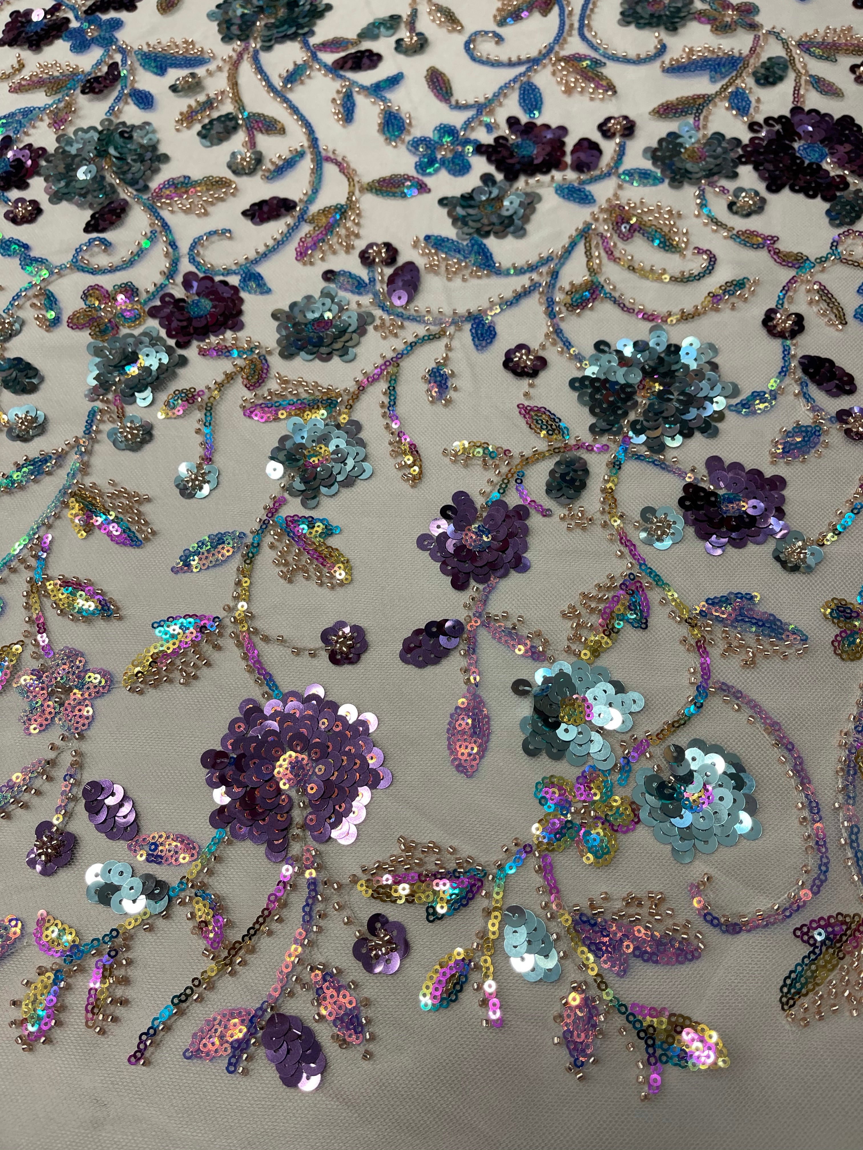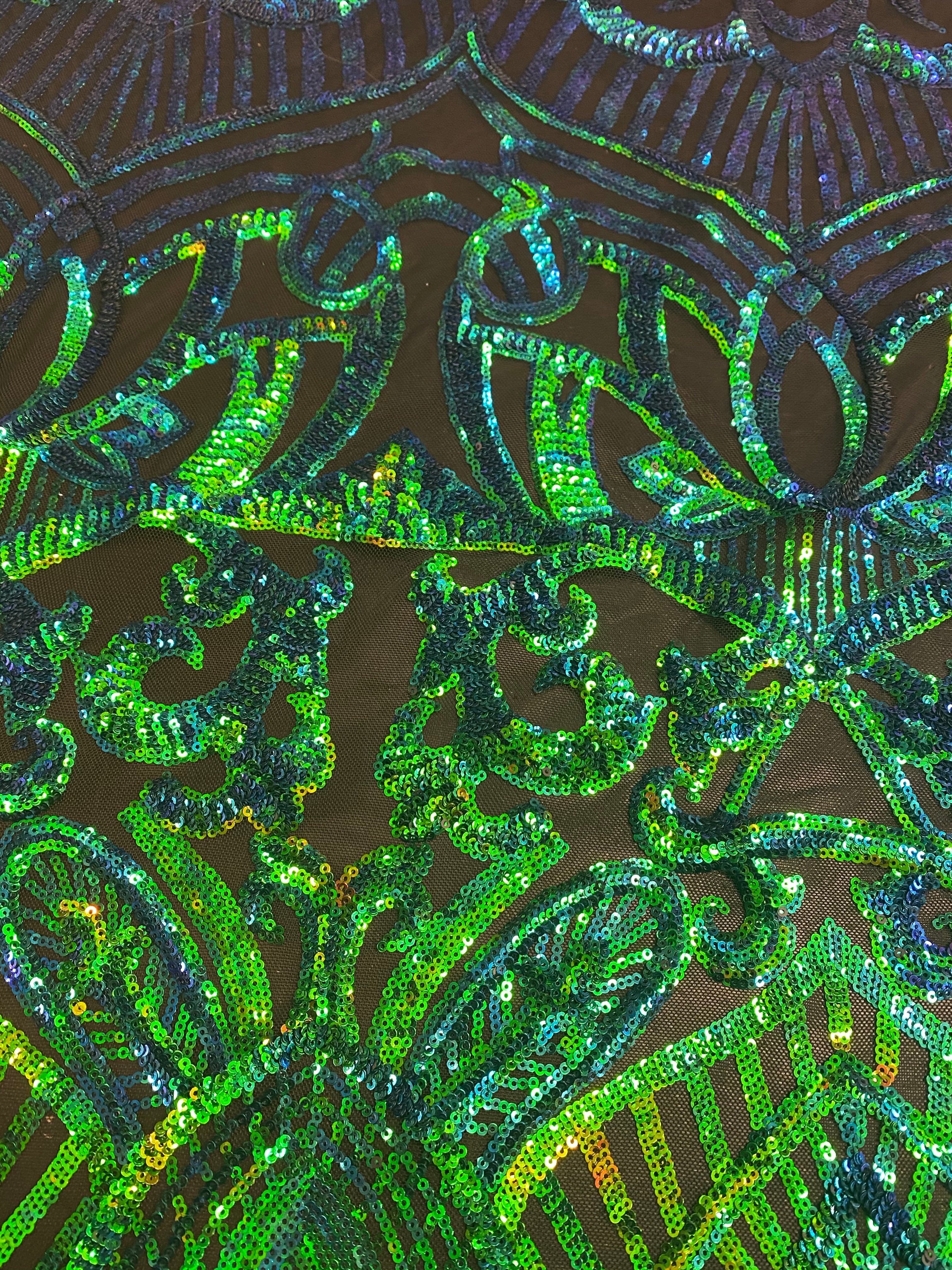 Firecracker Holographic Sequin Appliques on Nude Illusion mesh- 2 way stretch and 60" wide