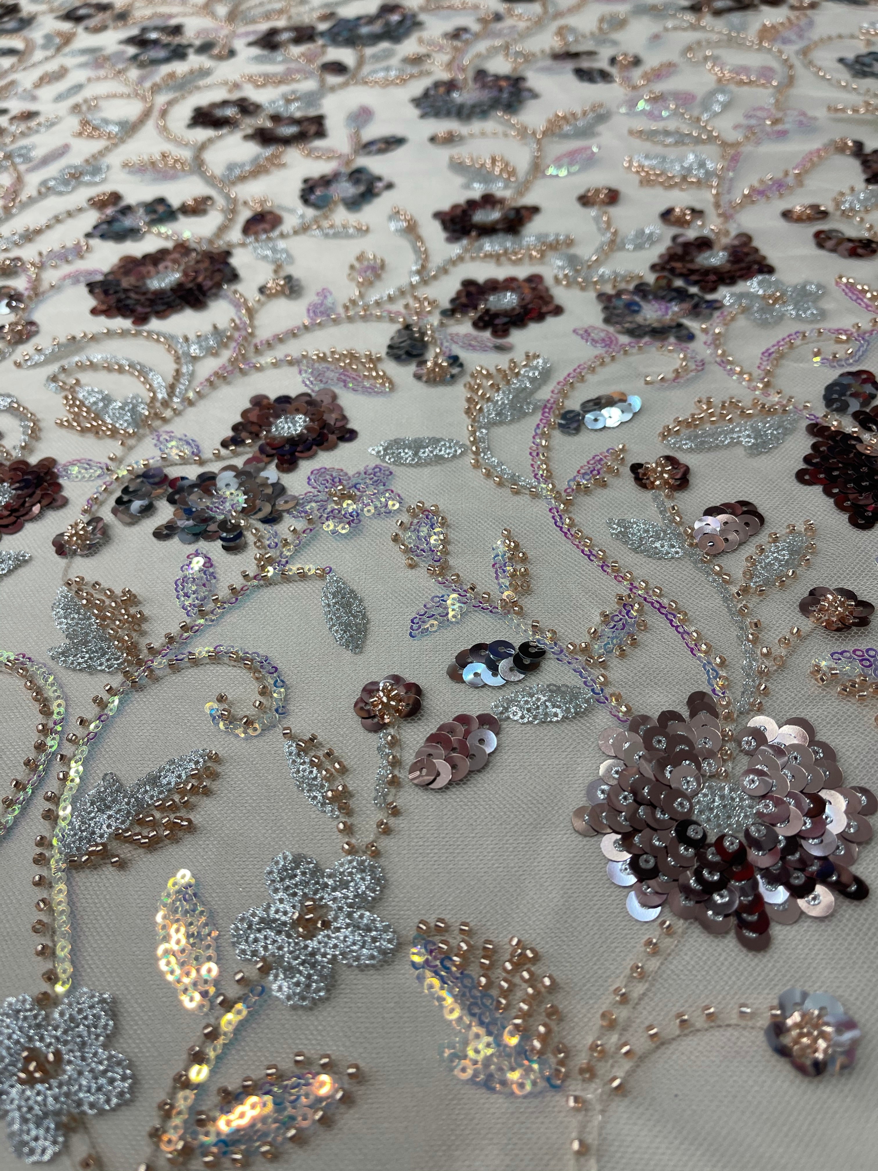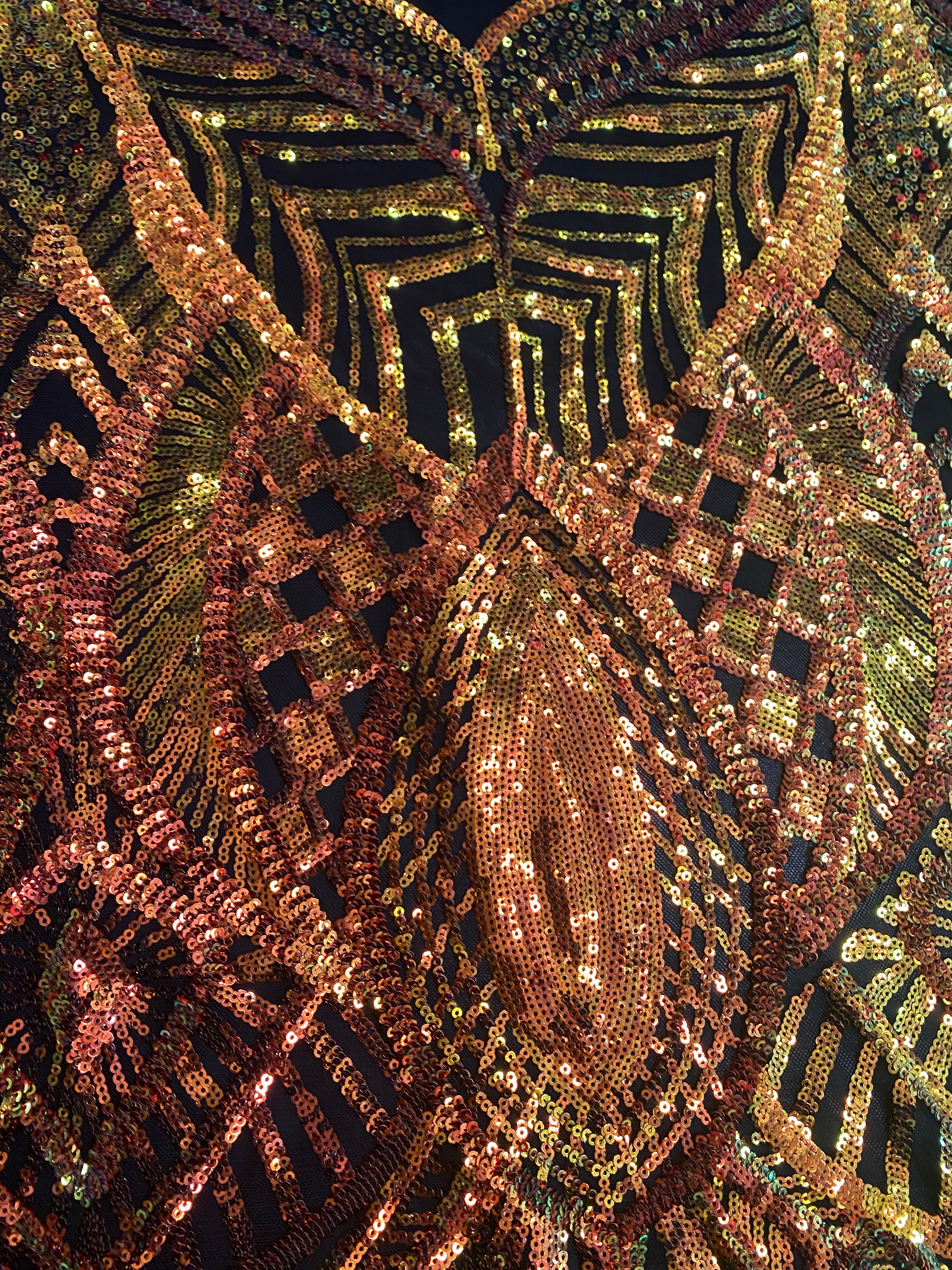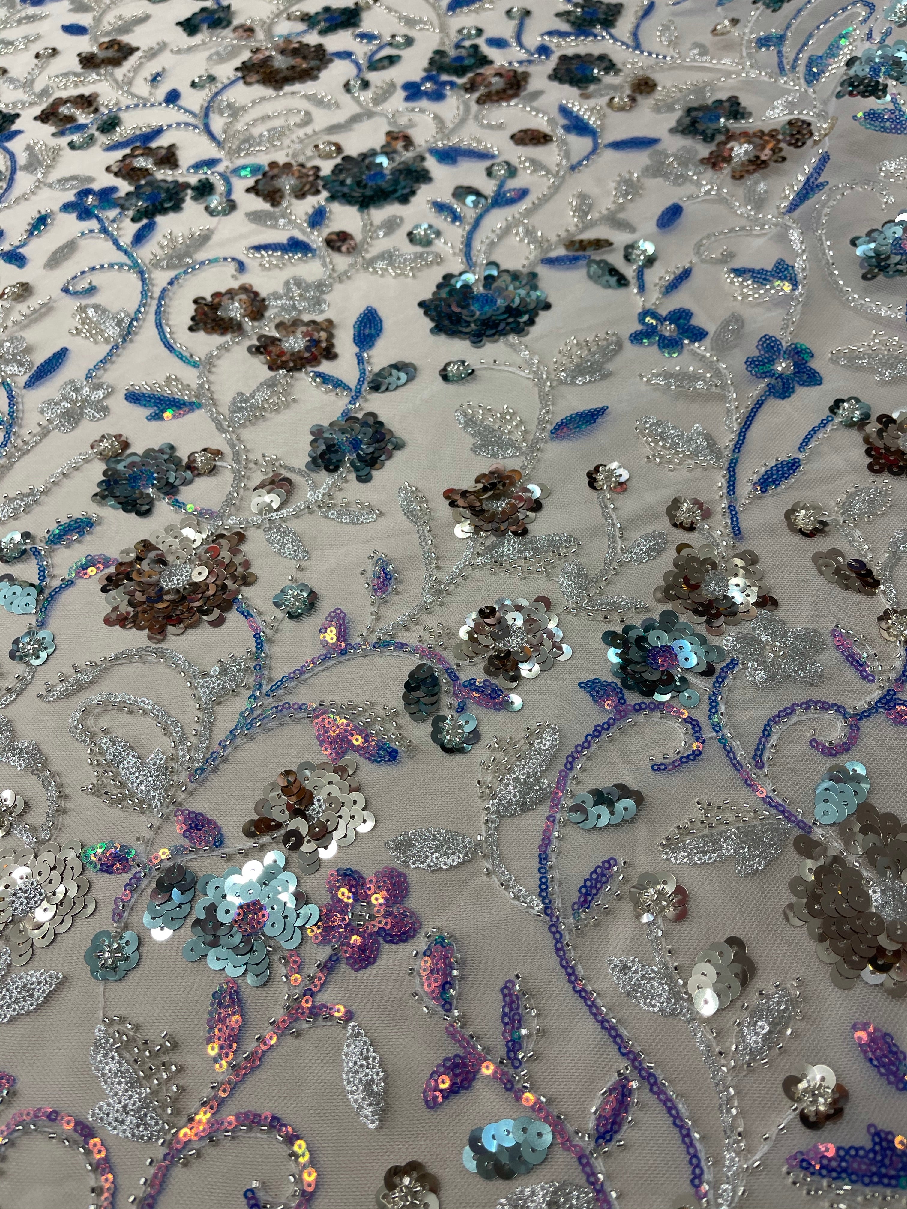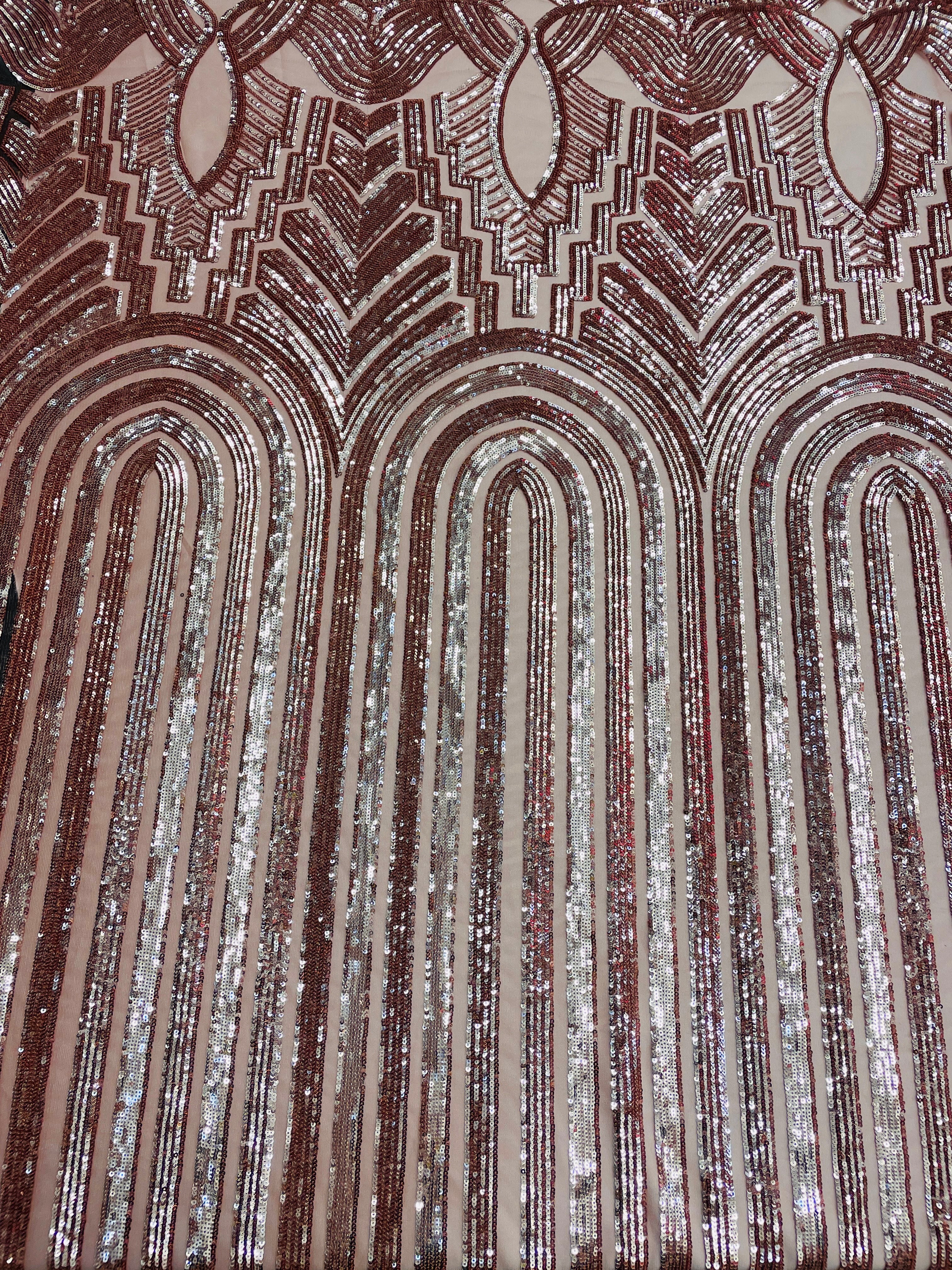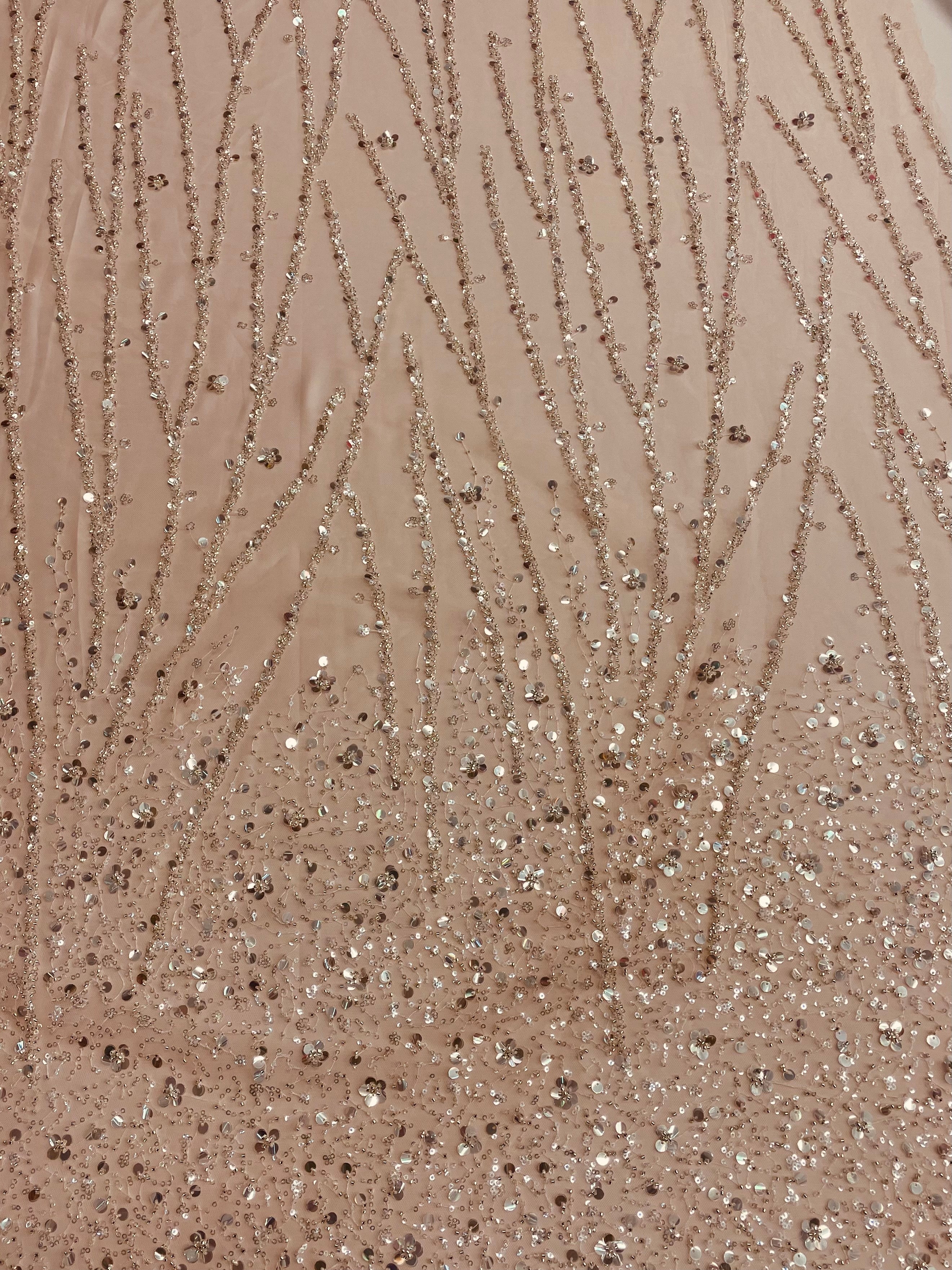 Firecracker Holographic Sequin Appliques on Nude Illusion mesh- 2 way stretch and 60" wide