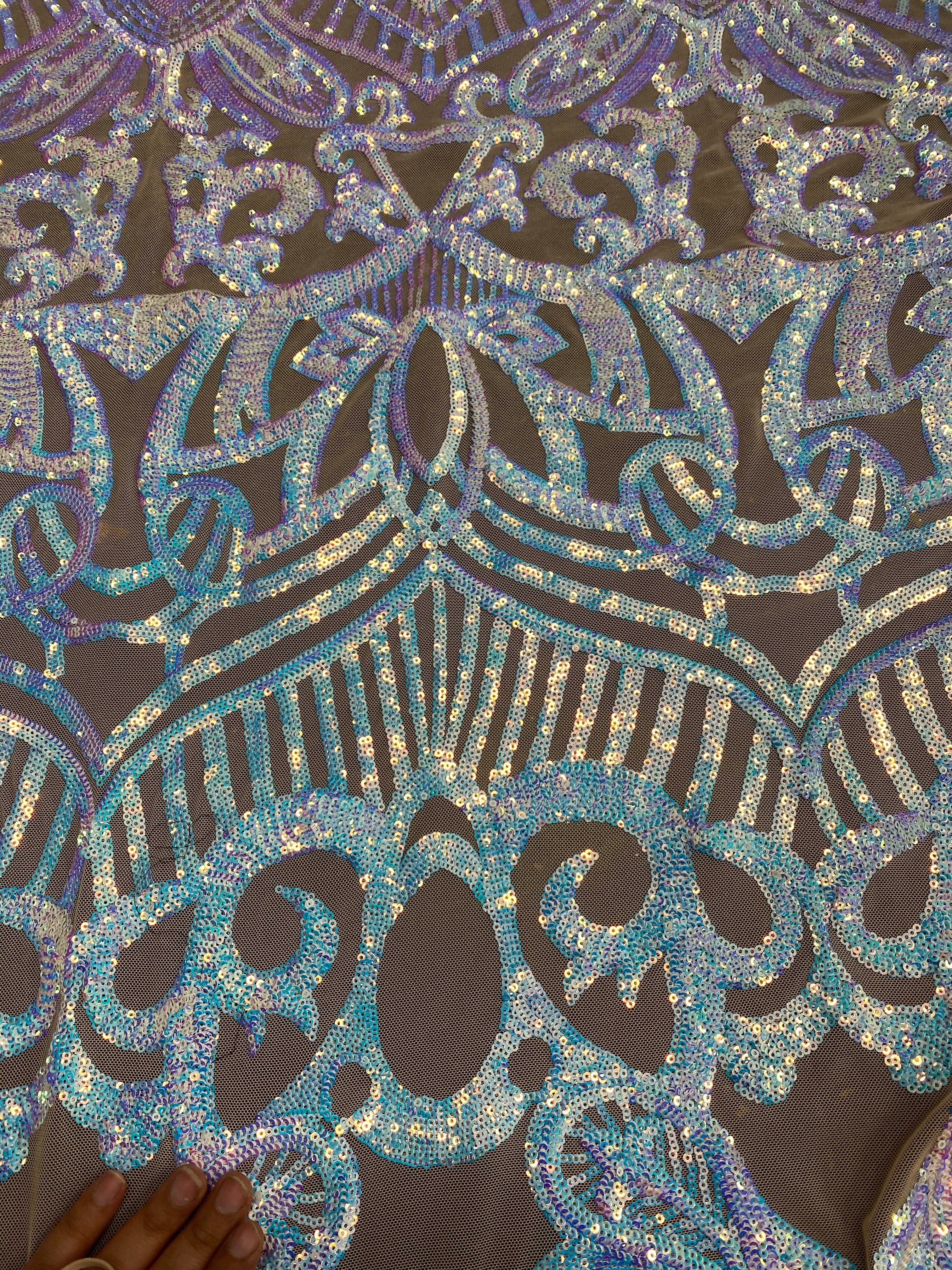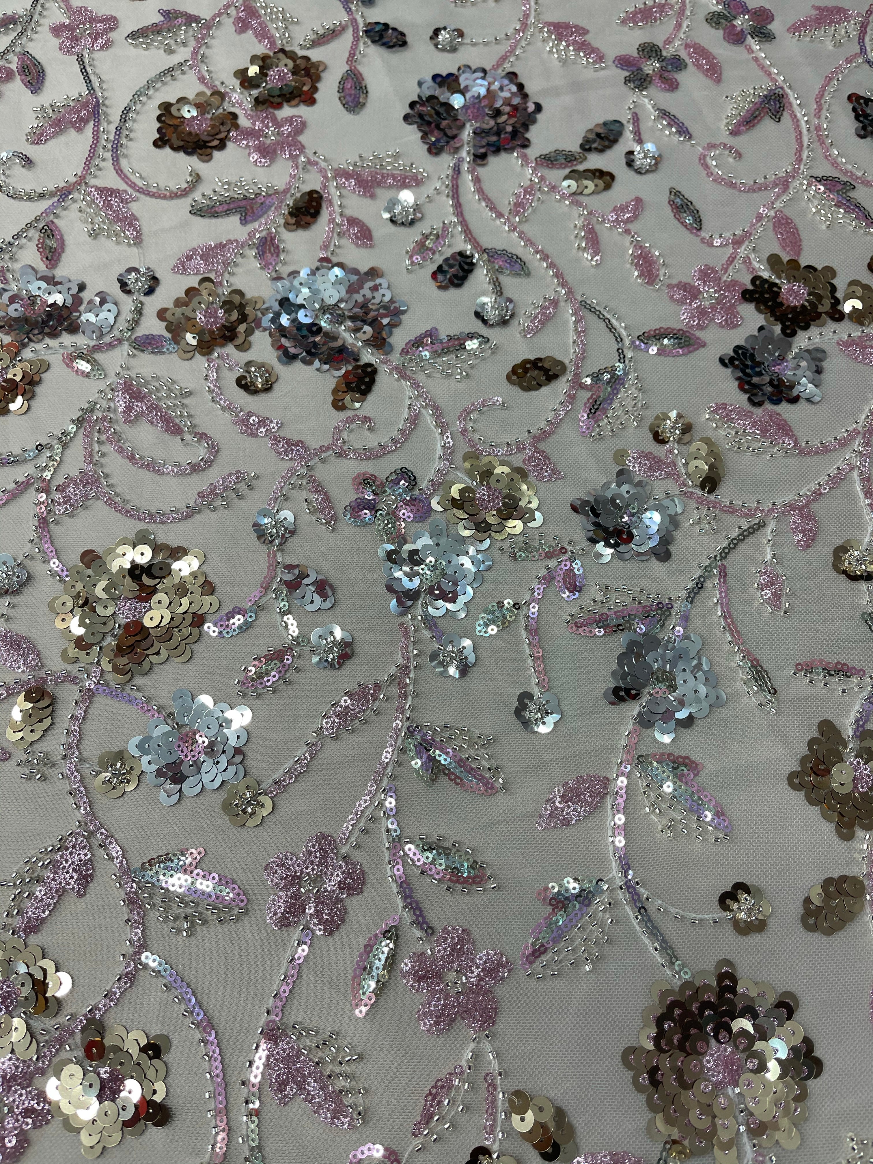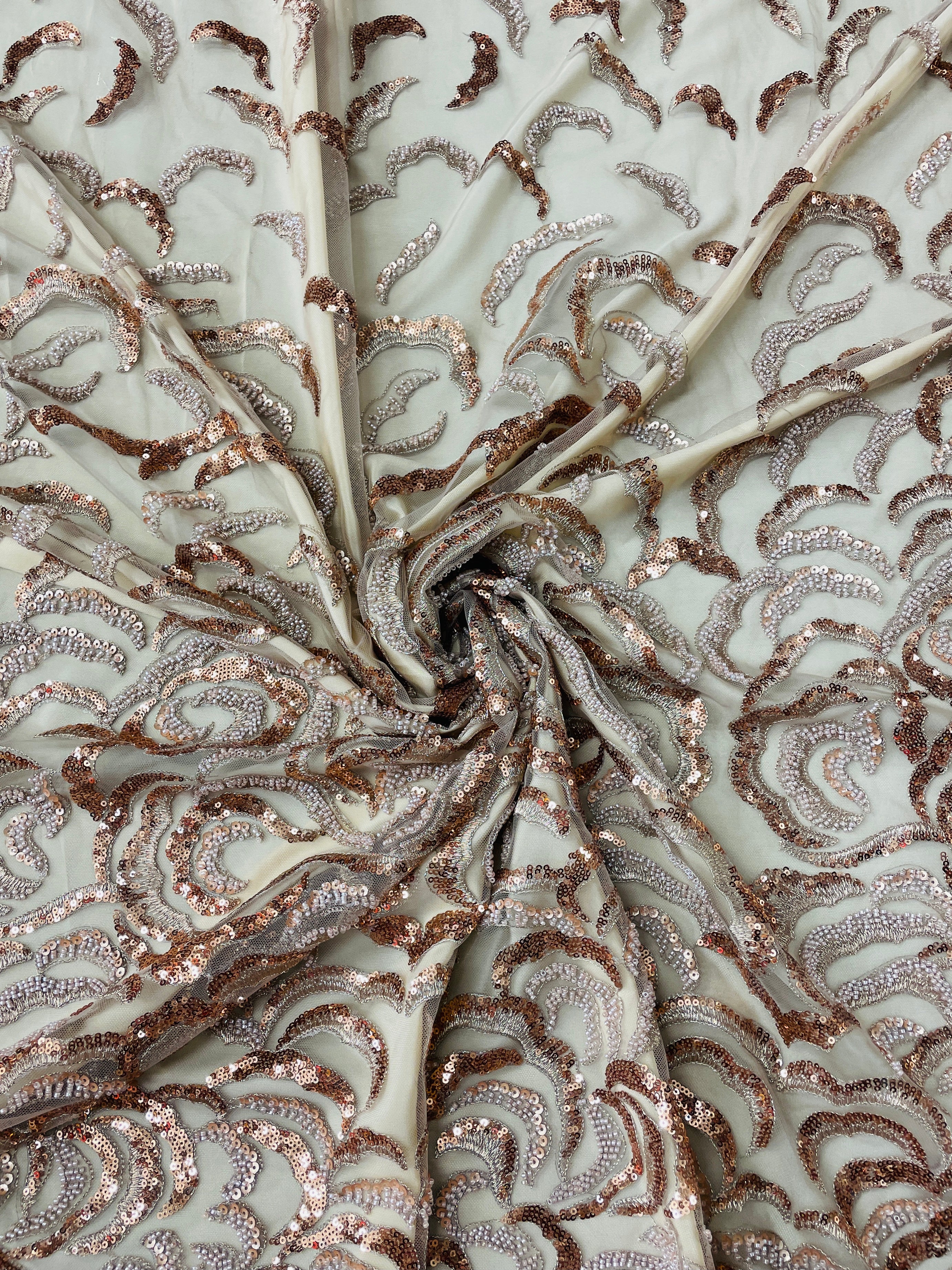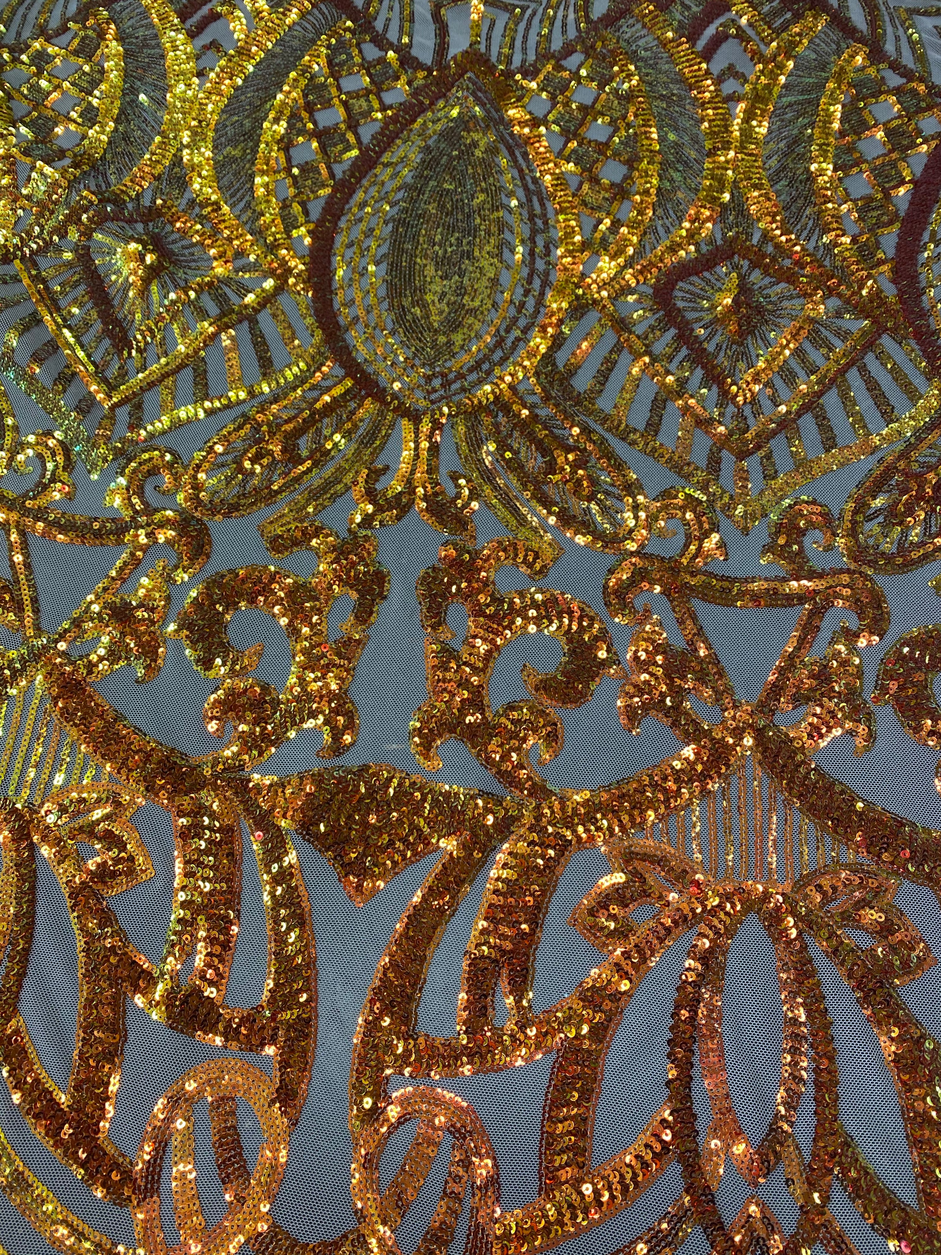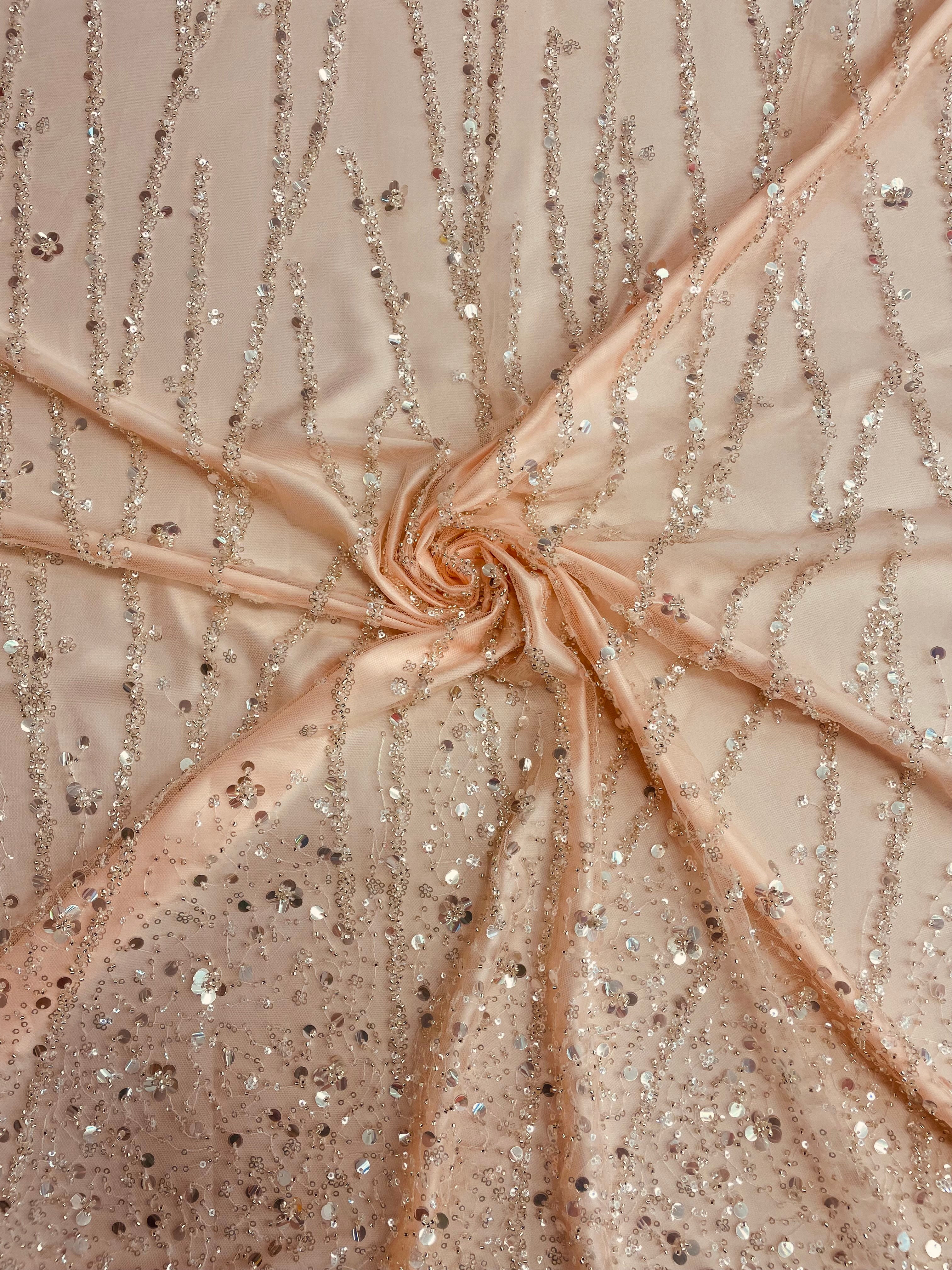 Firecracker Holographic Sequin Appliques on Nude Illusion mesh- 2 way stretch and 60" wide