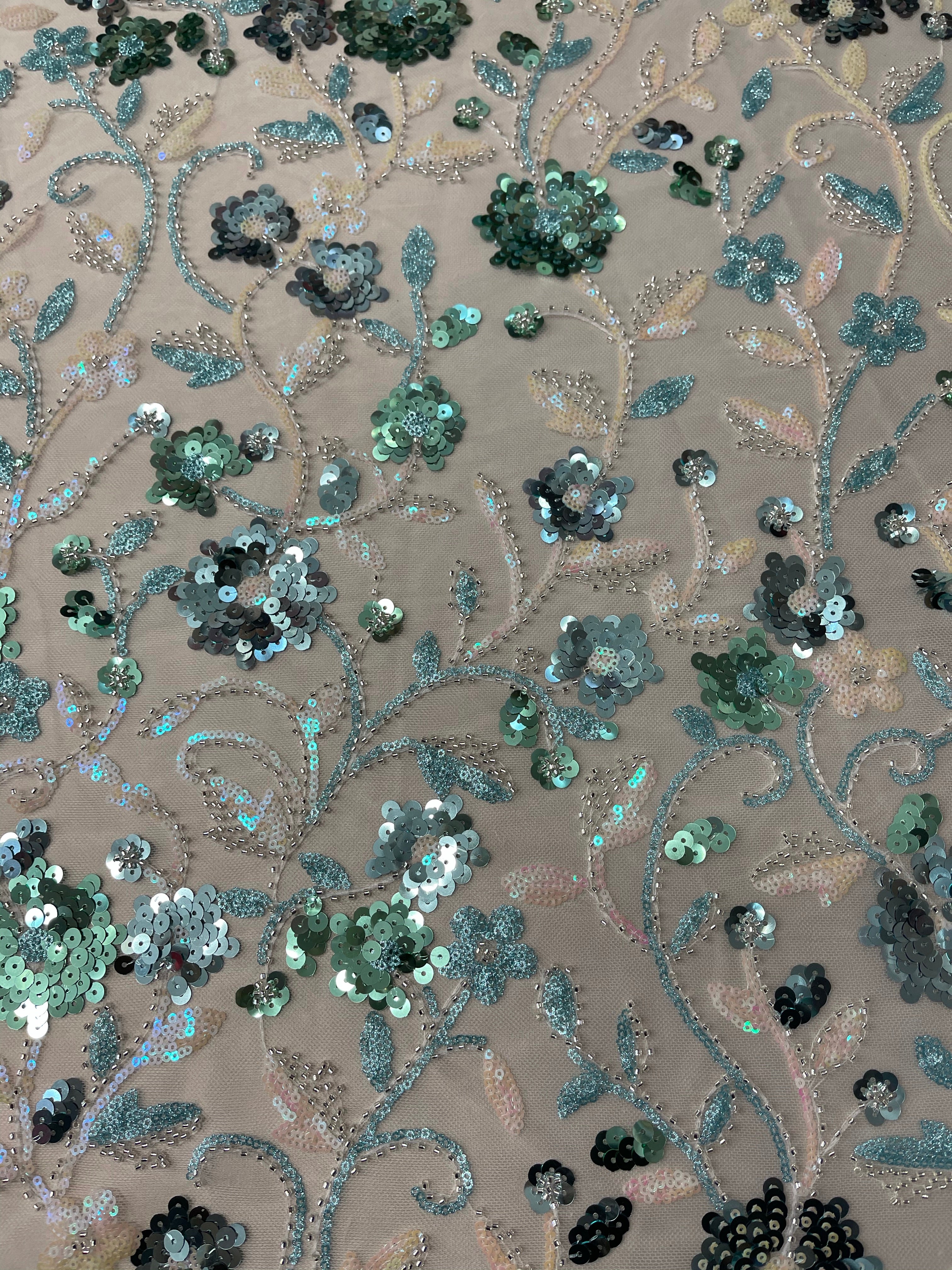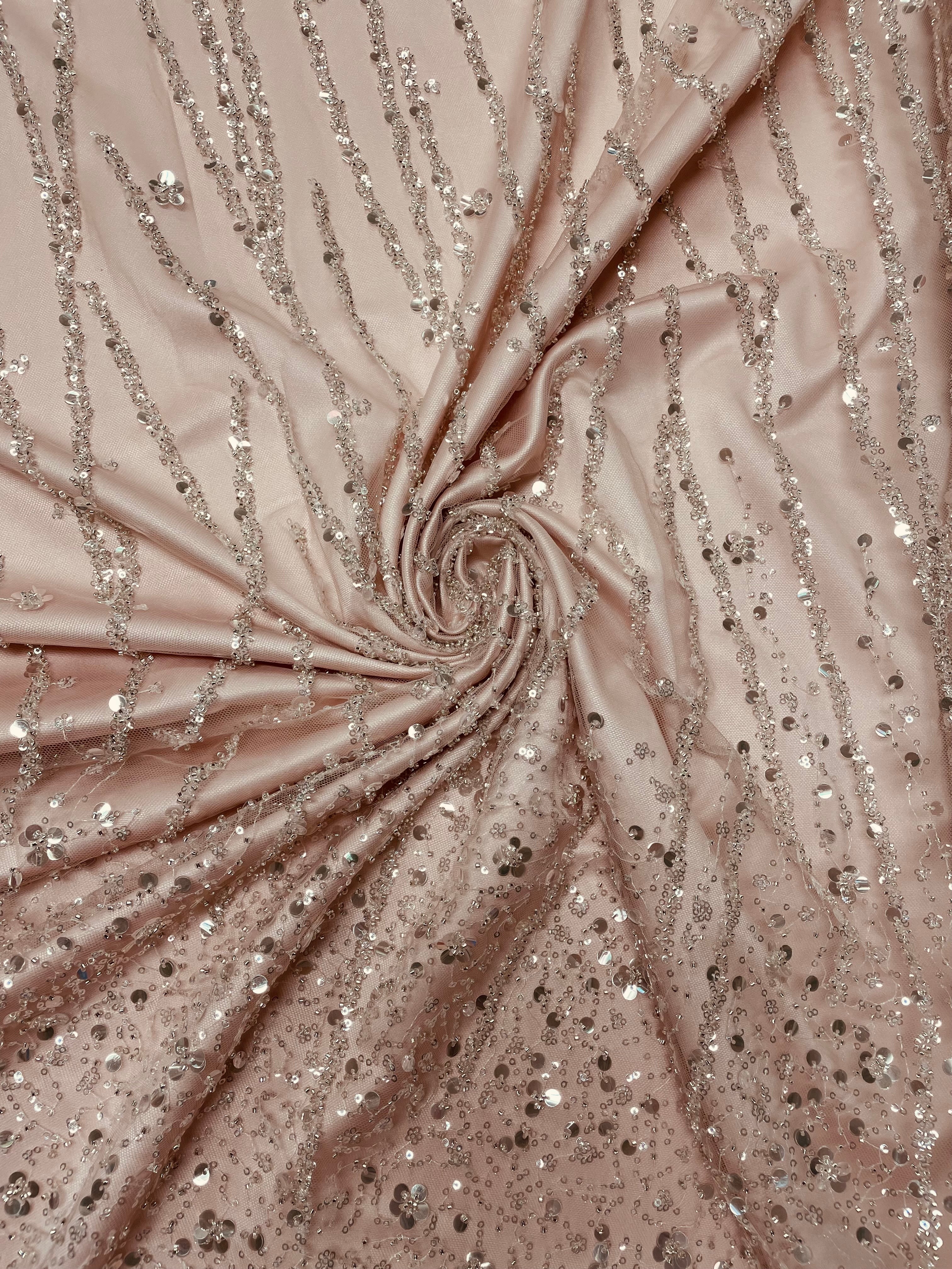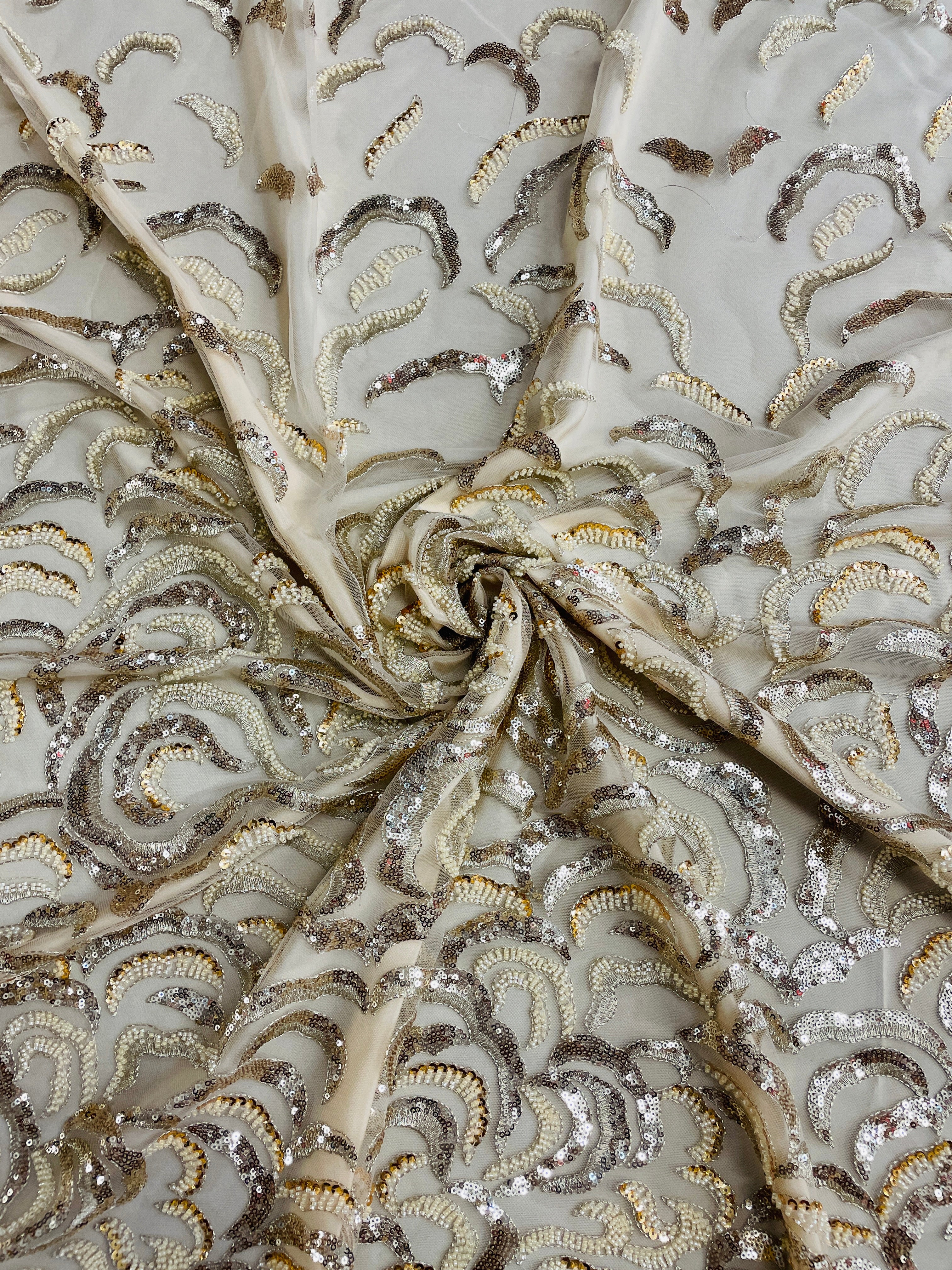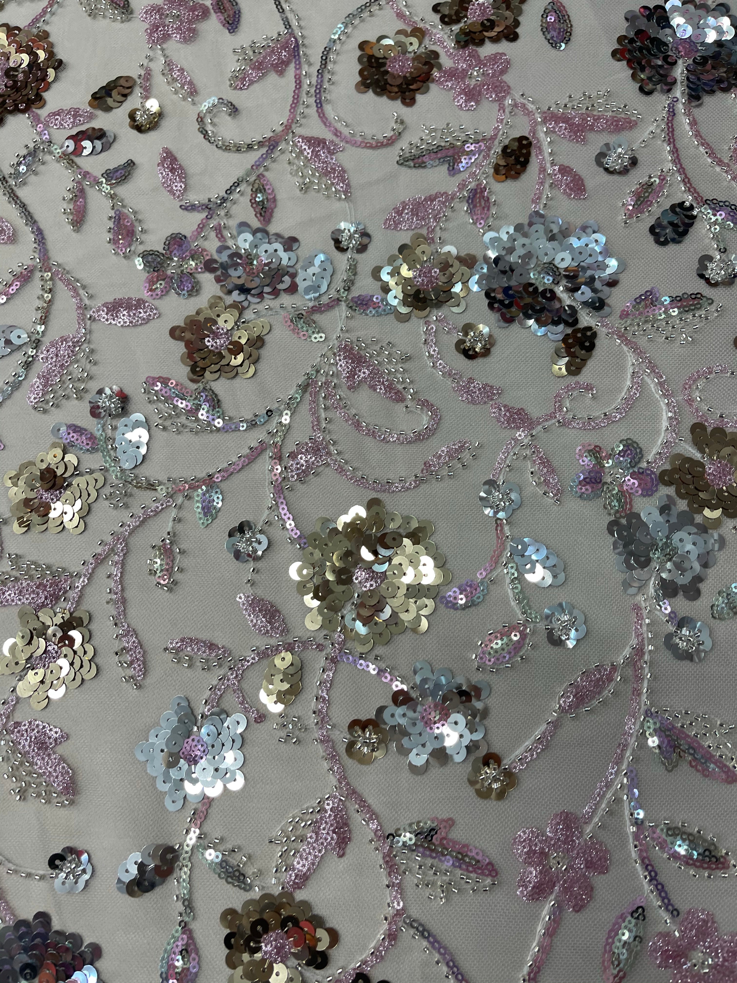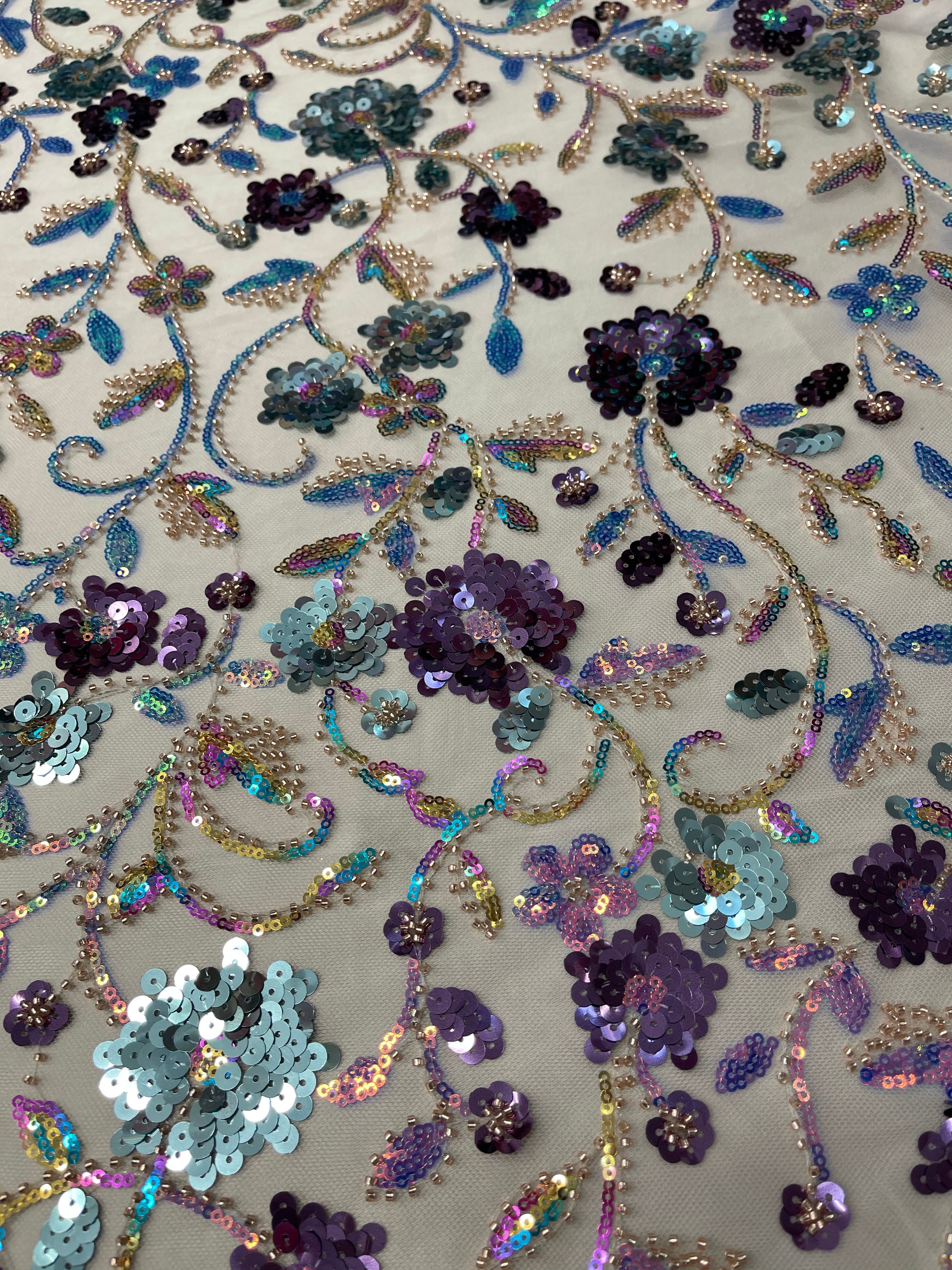 Firecracker Holographic Sequin Appliques on Nude Illusion mesh- 2 way stretch and 60" wide