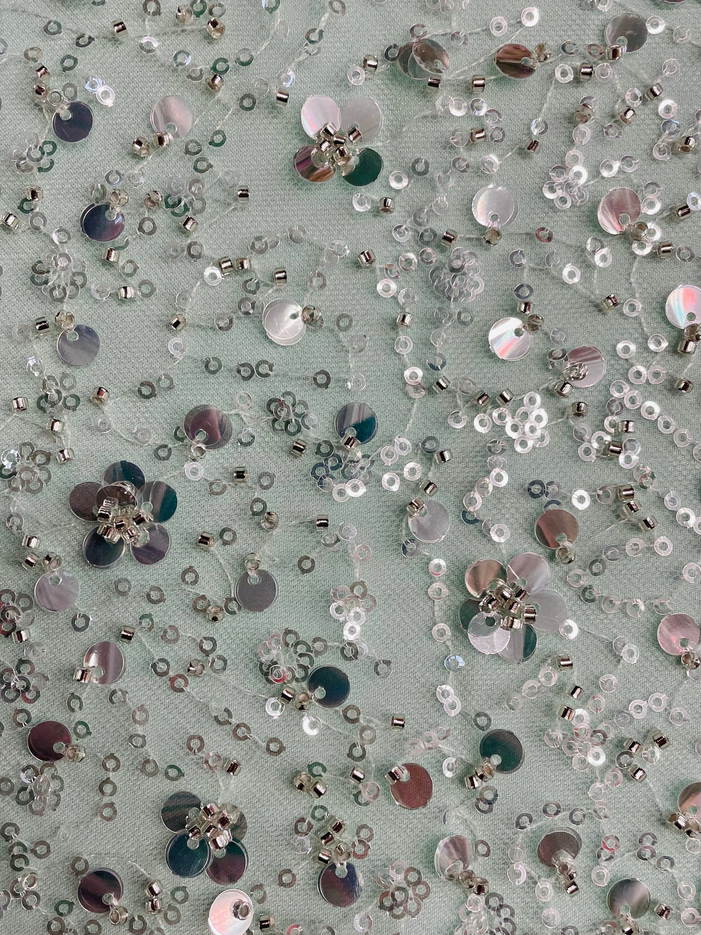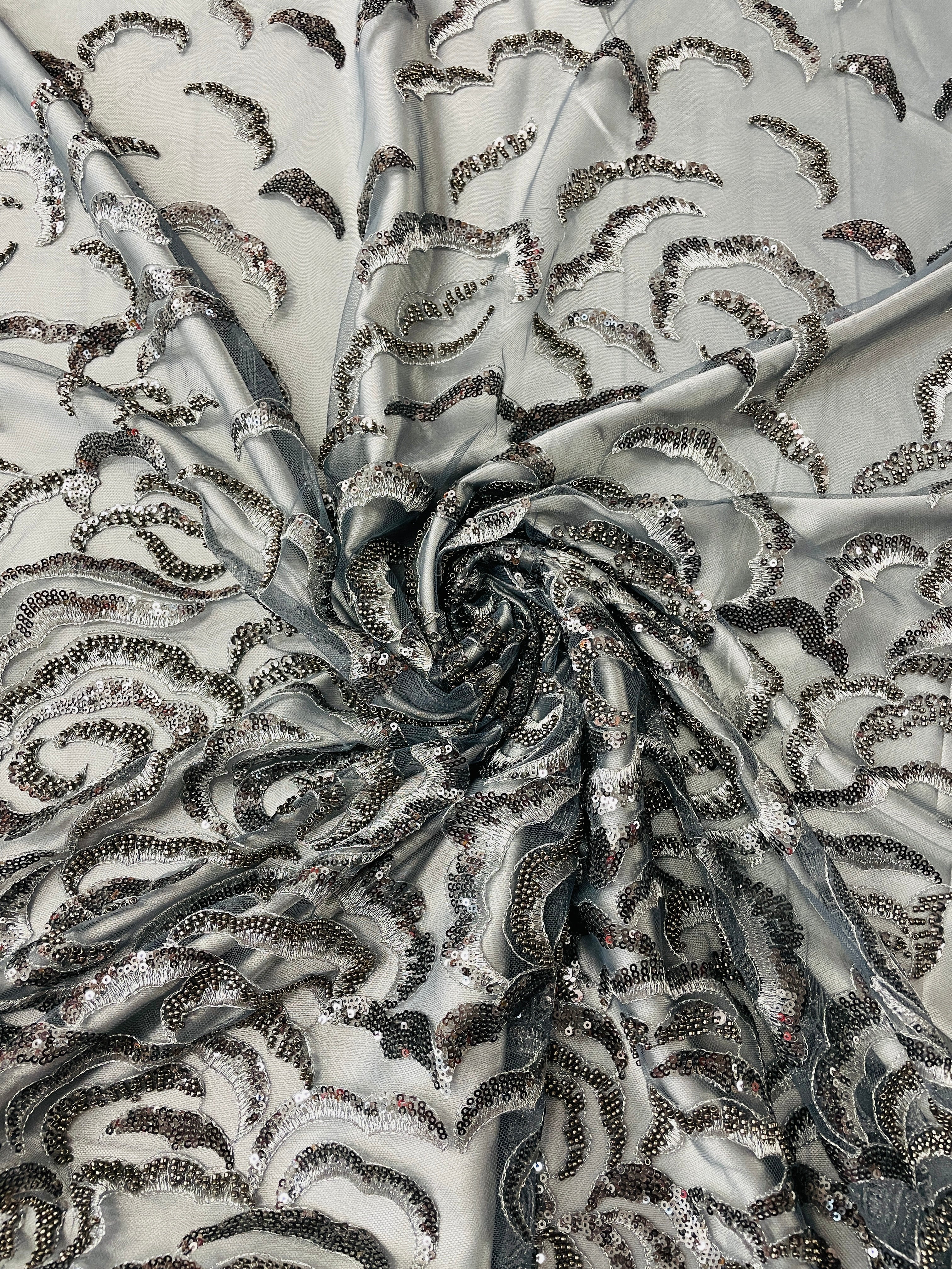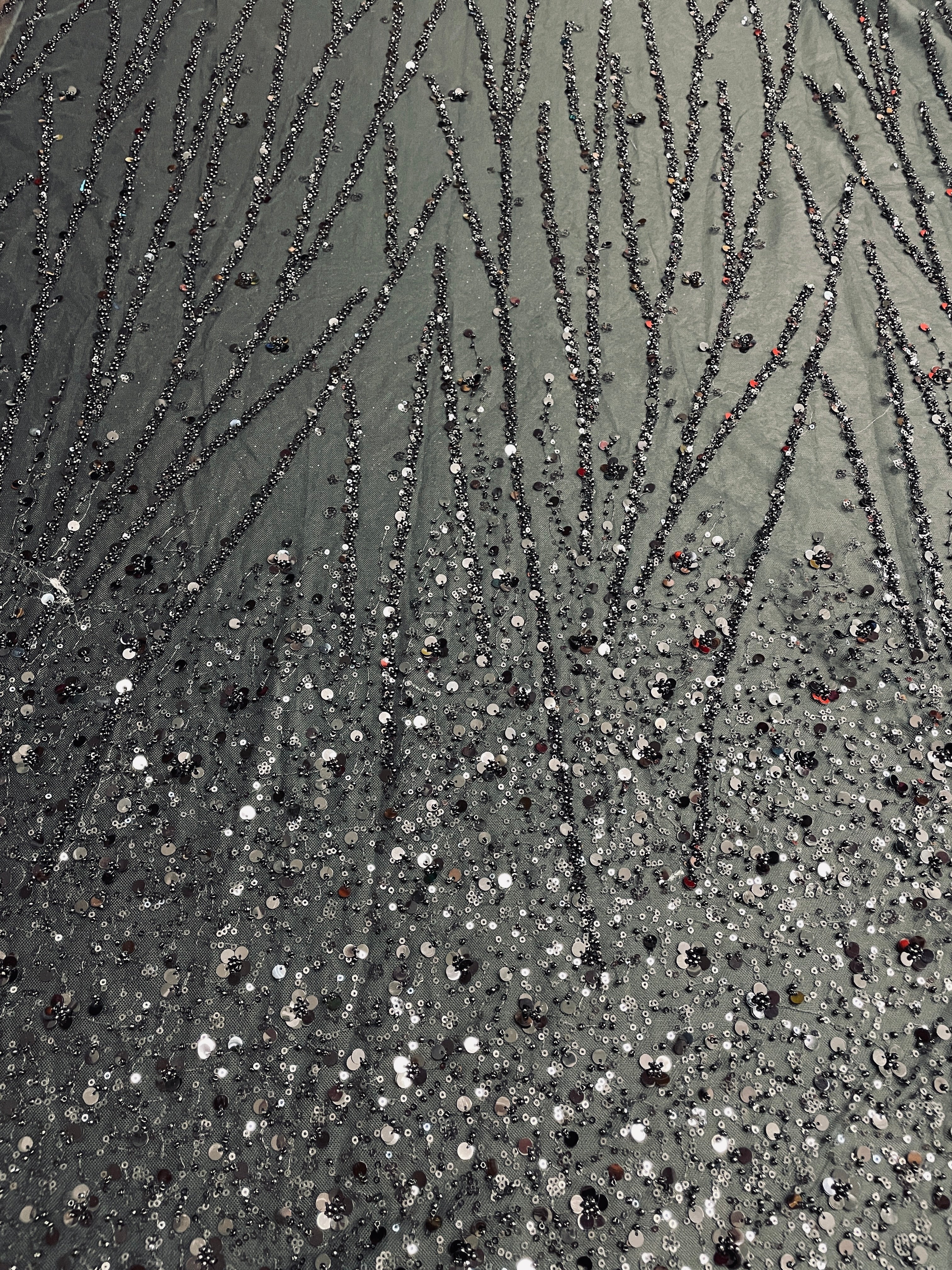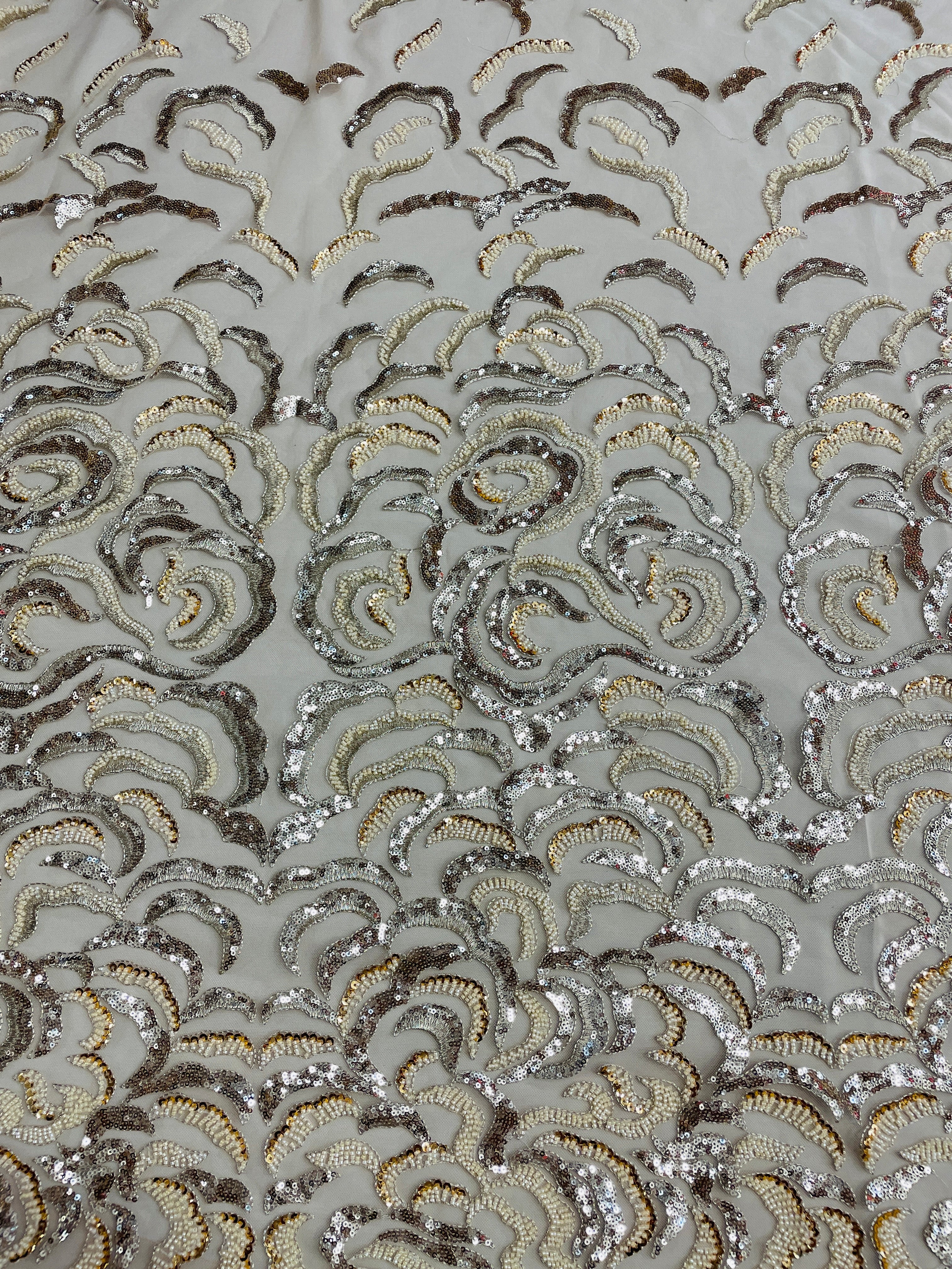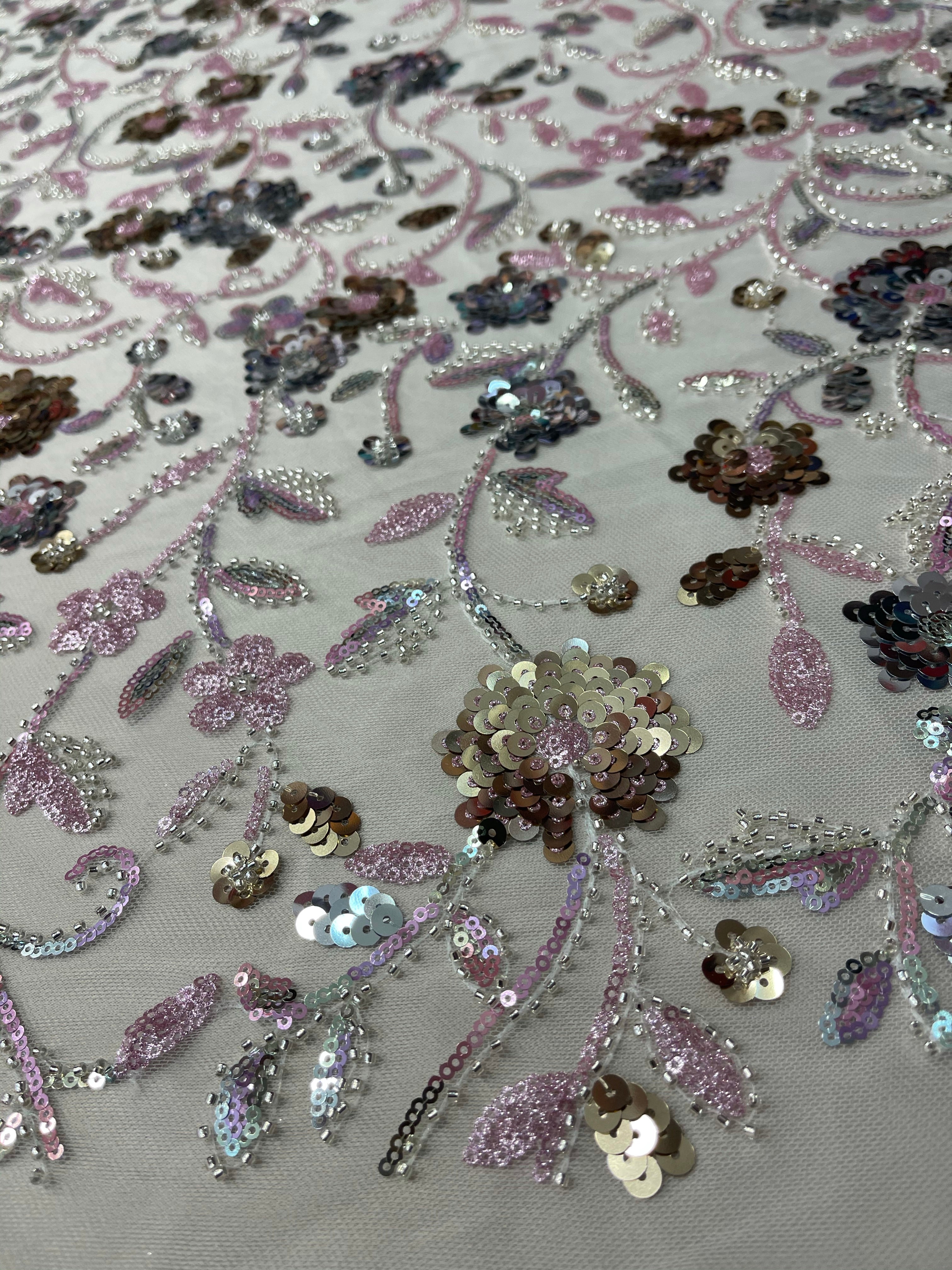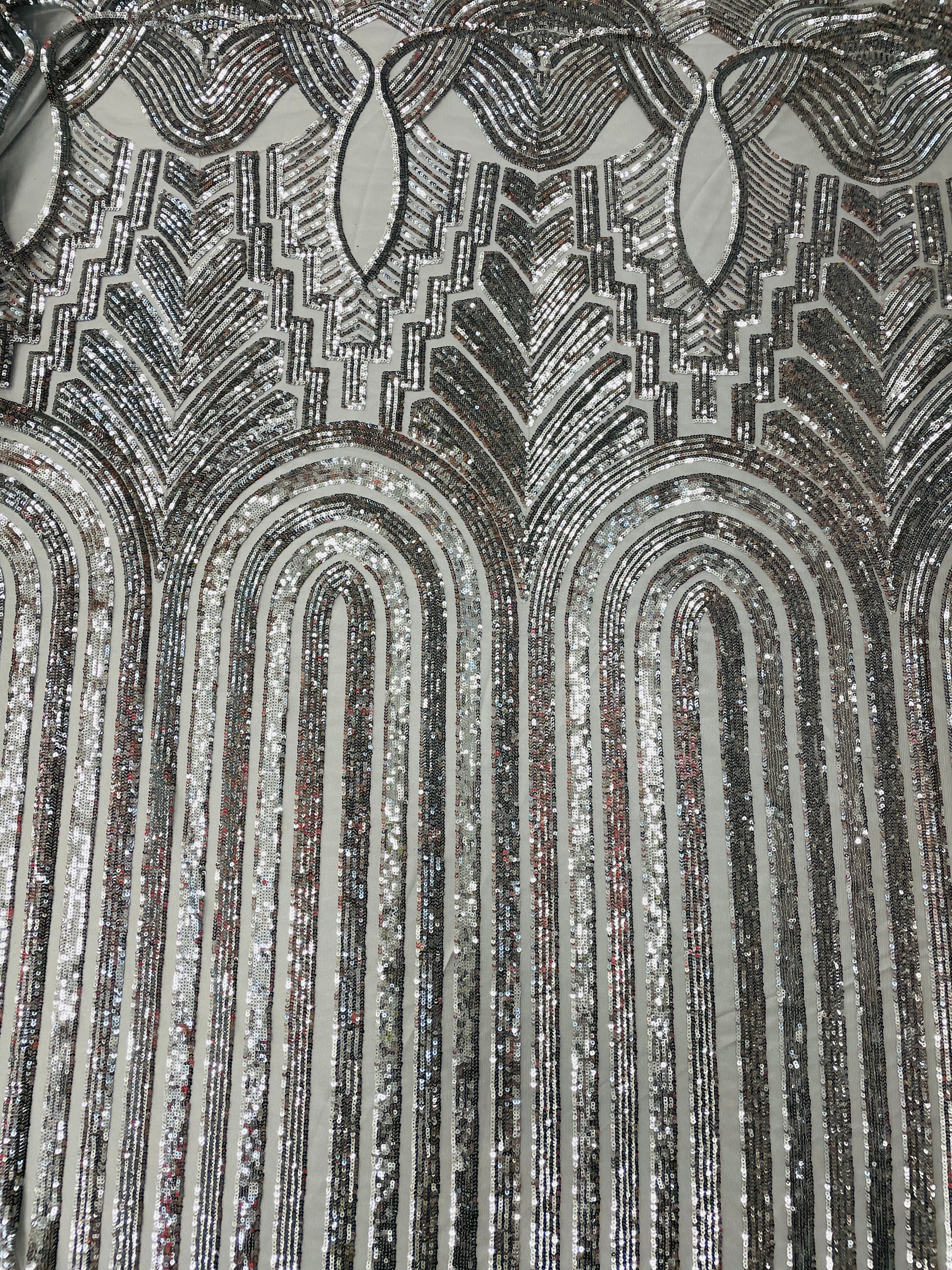 Firecracker Holographic Sequin Appliques on Nude Illusion mesh- 2 way stretch and 60" wide