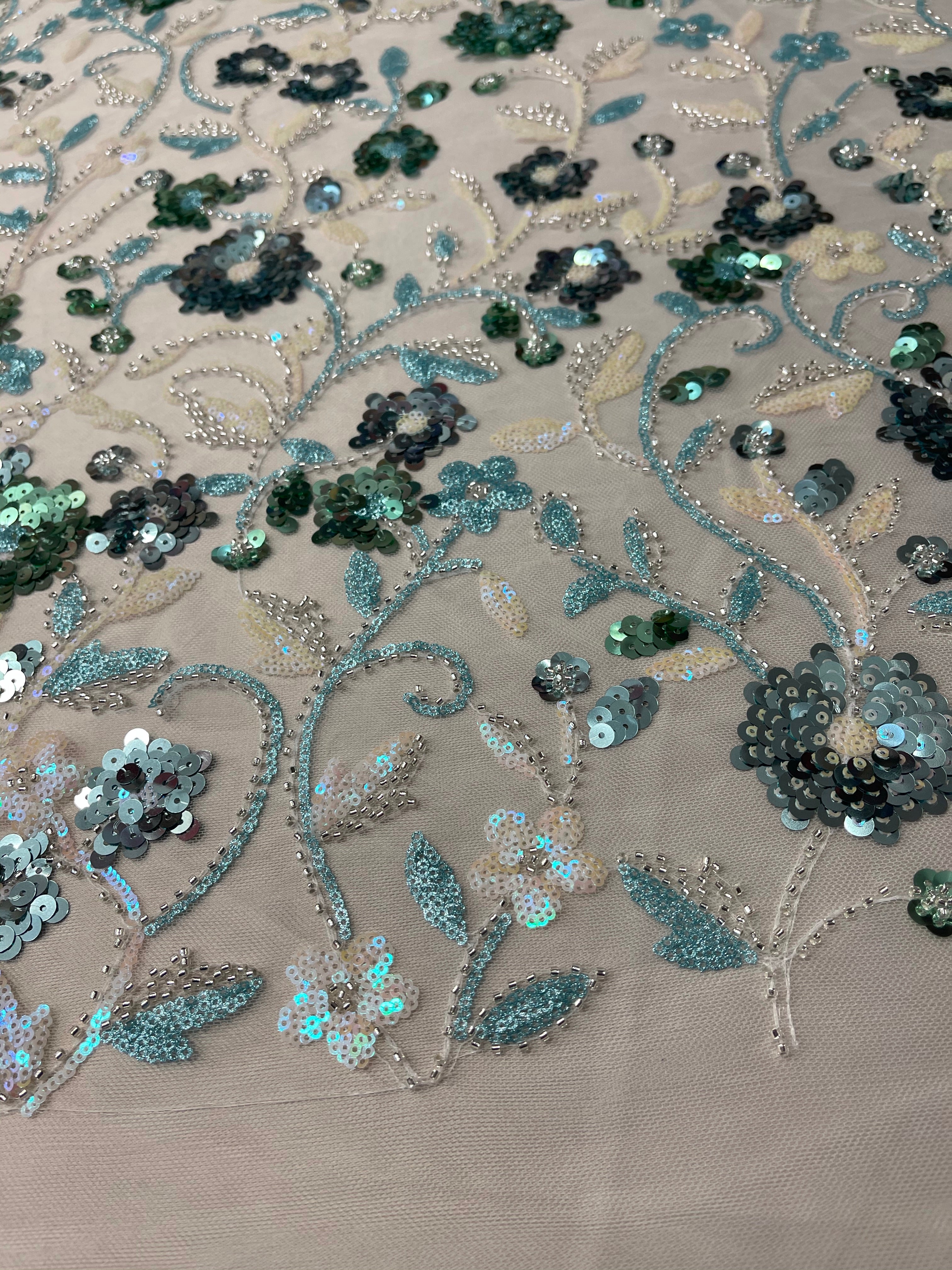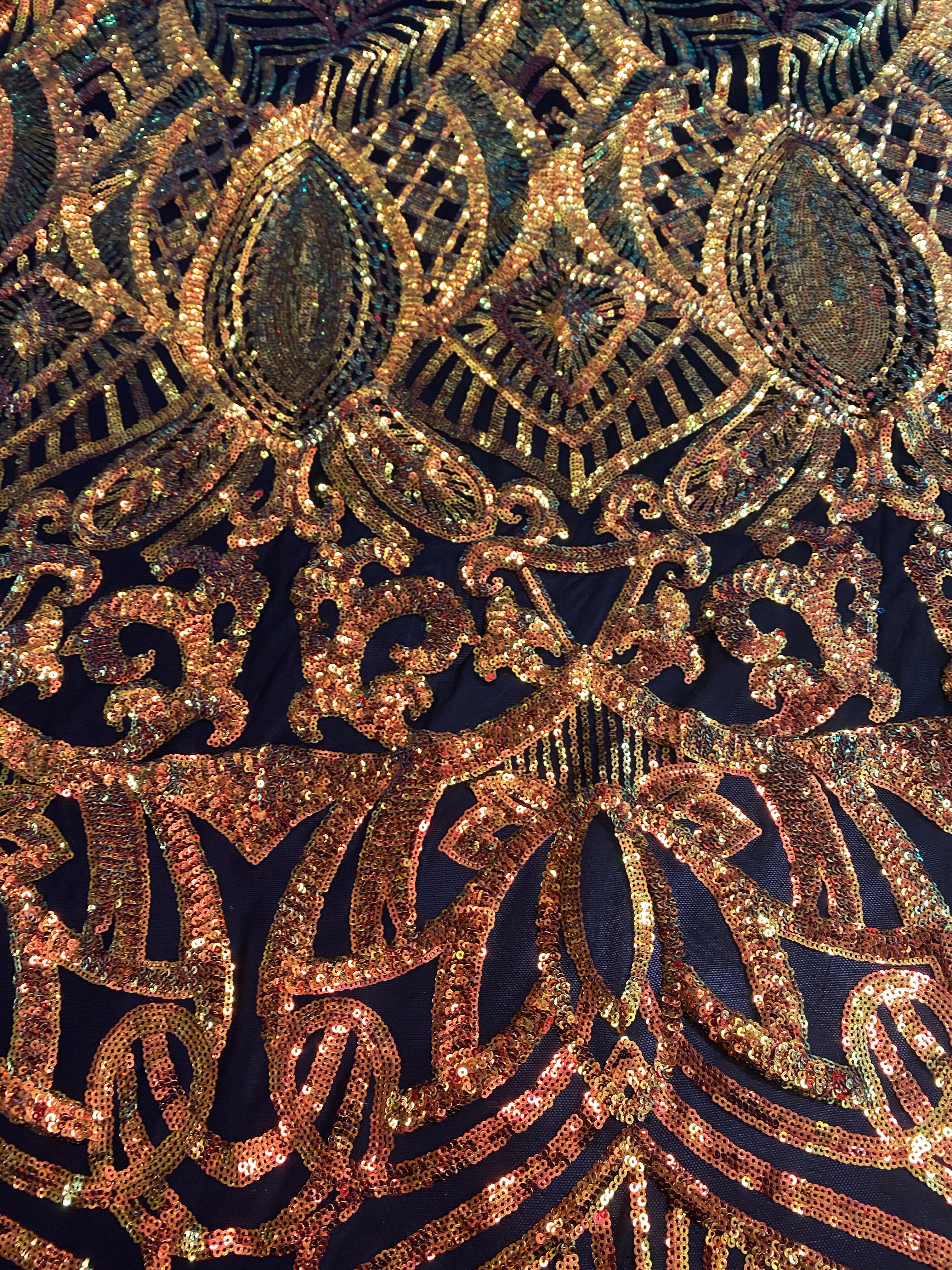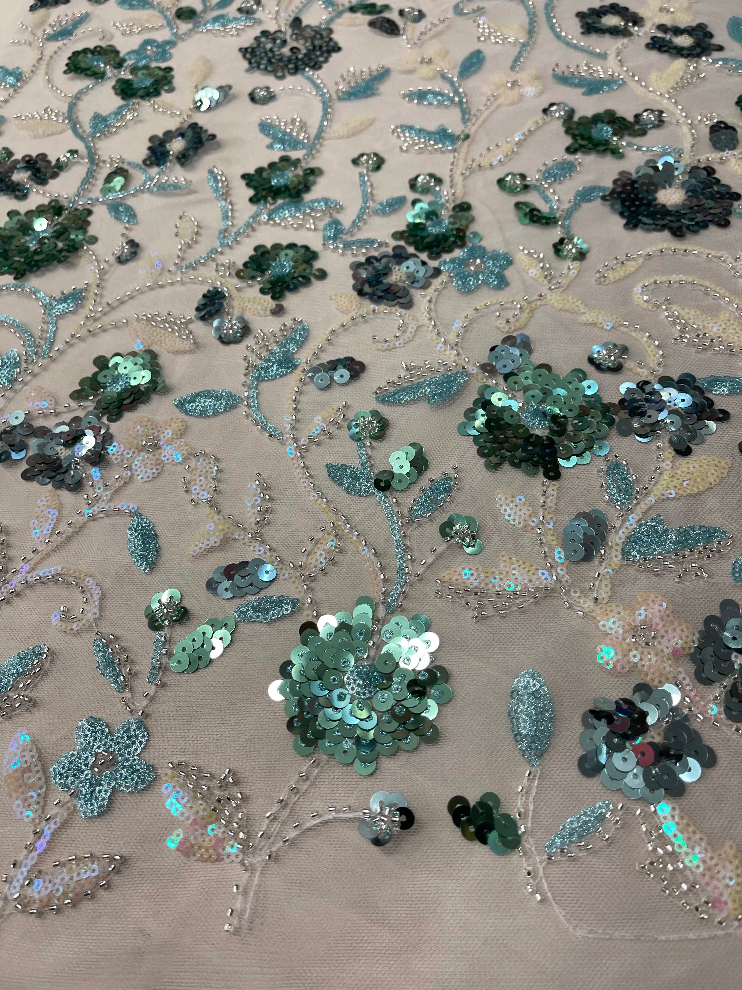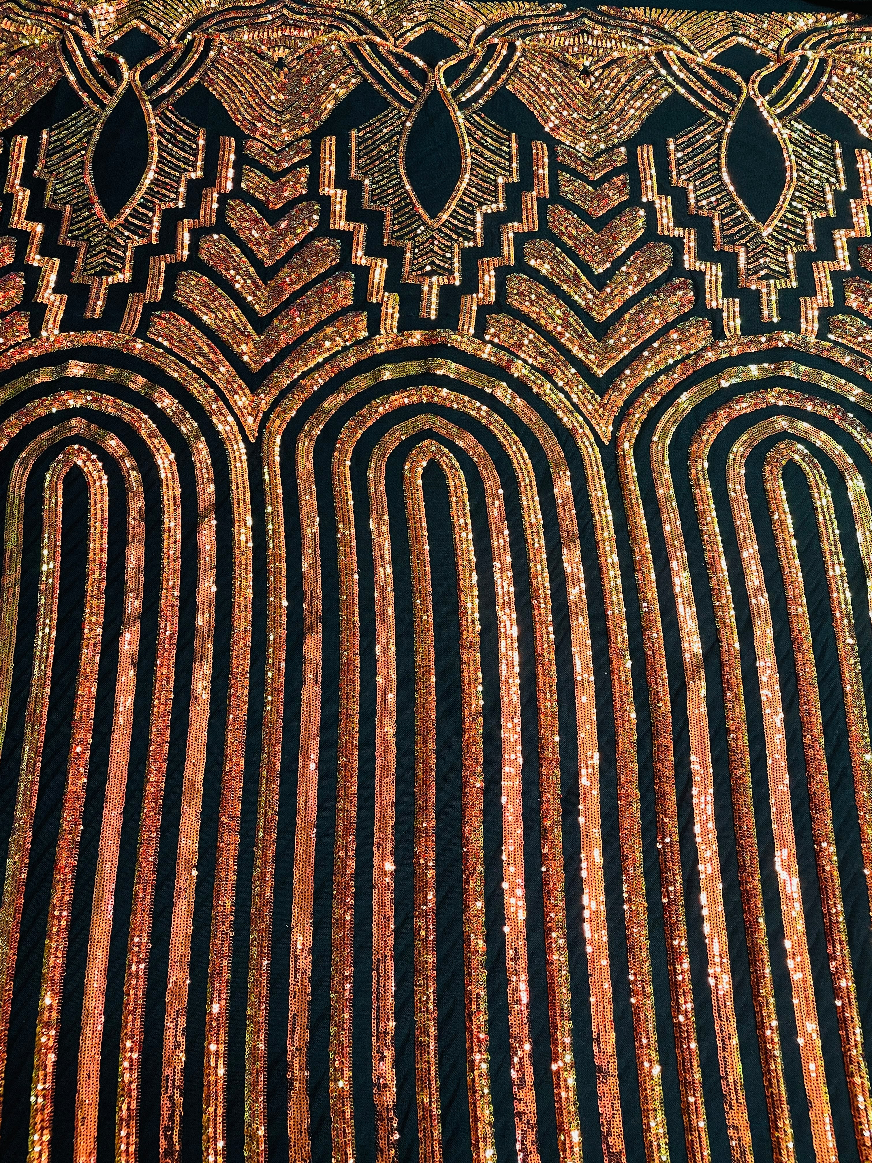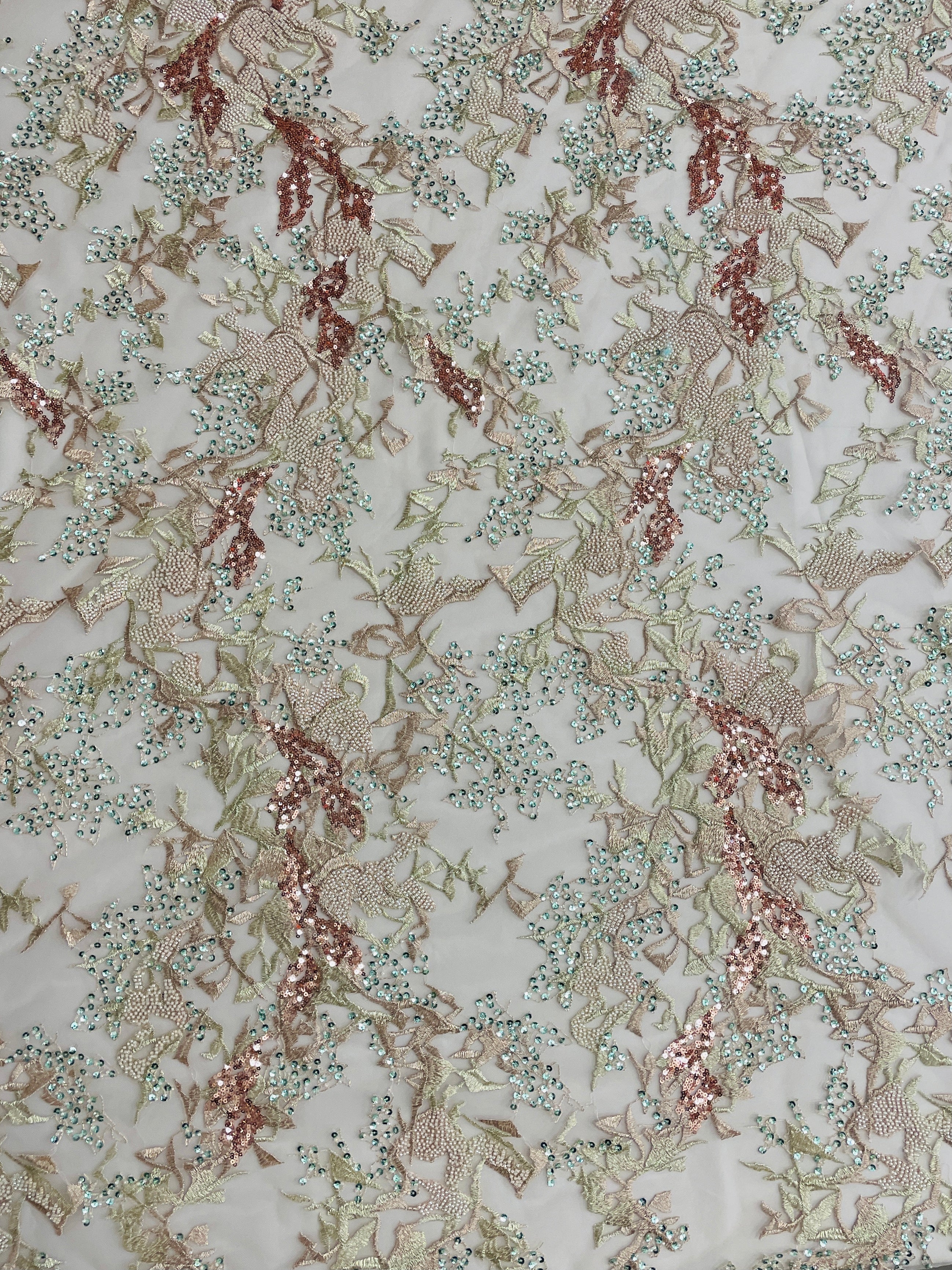 Firecracker Holographic Sequin Appliques on Nude Illusion mesh- 2 way stretch and 60" wide