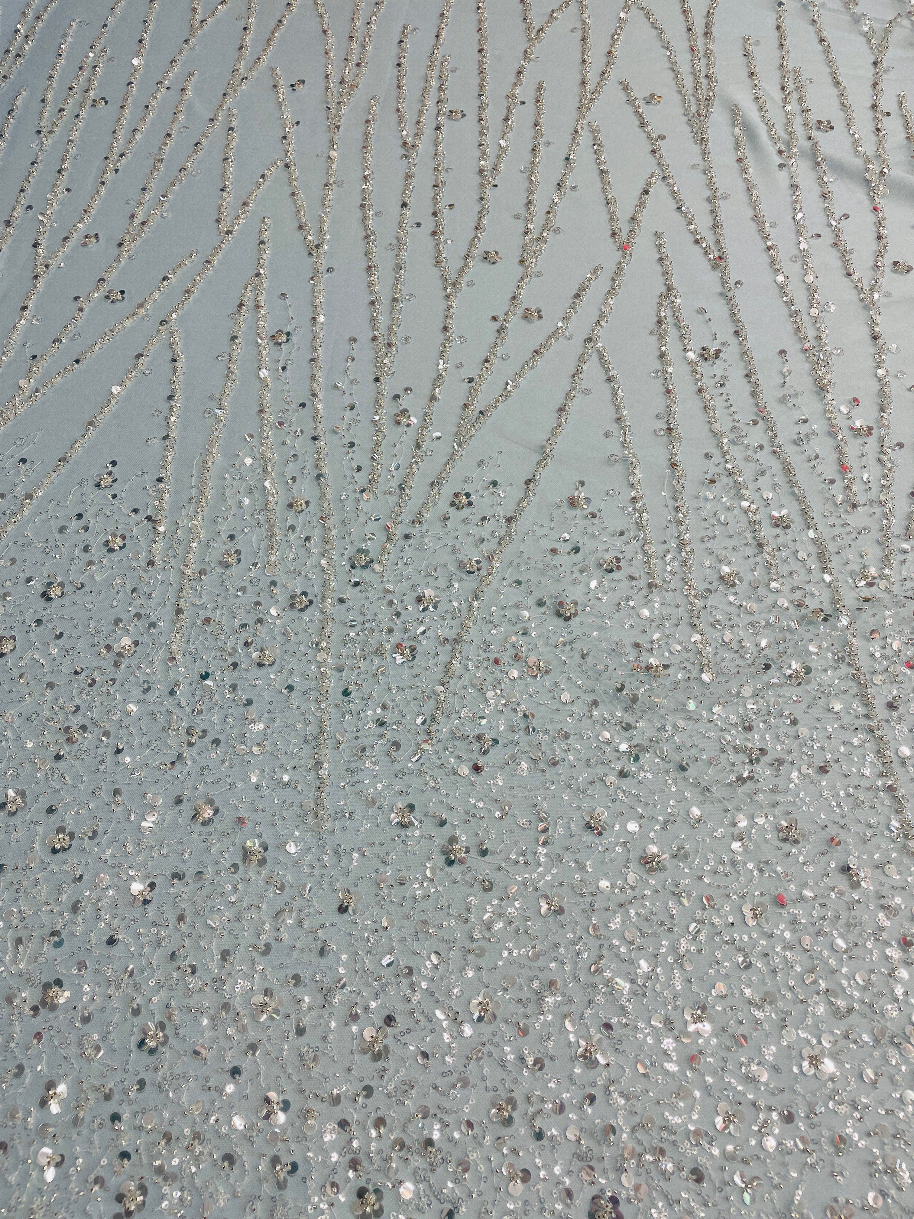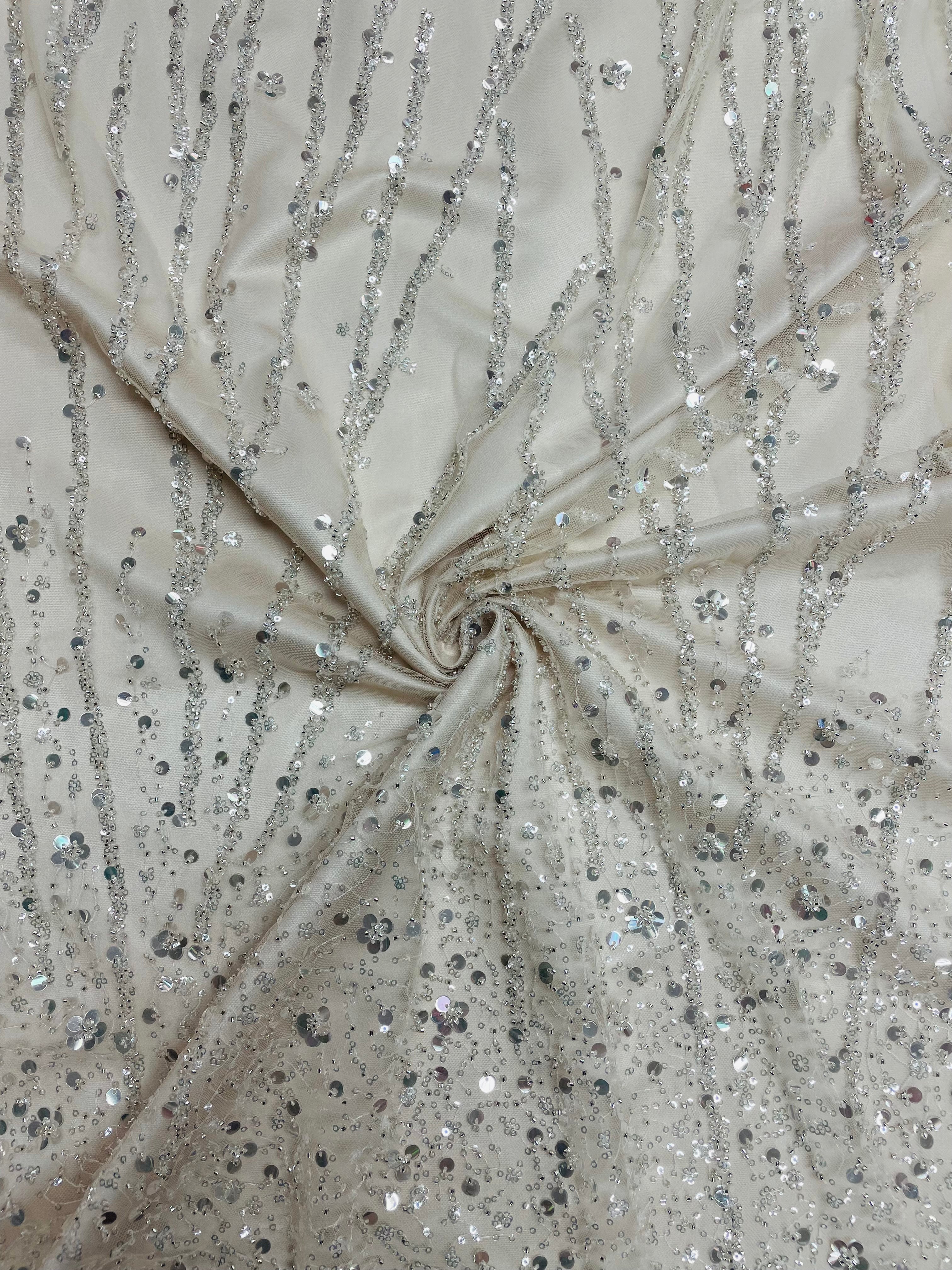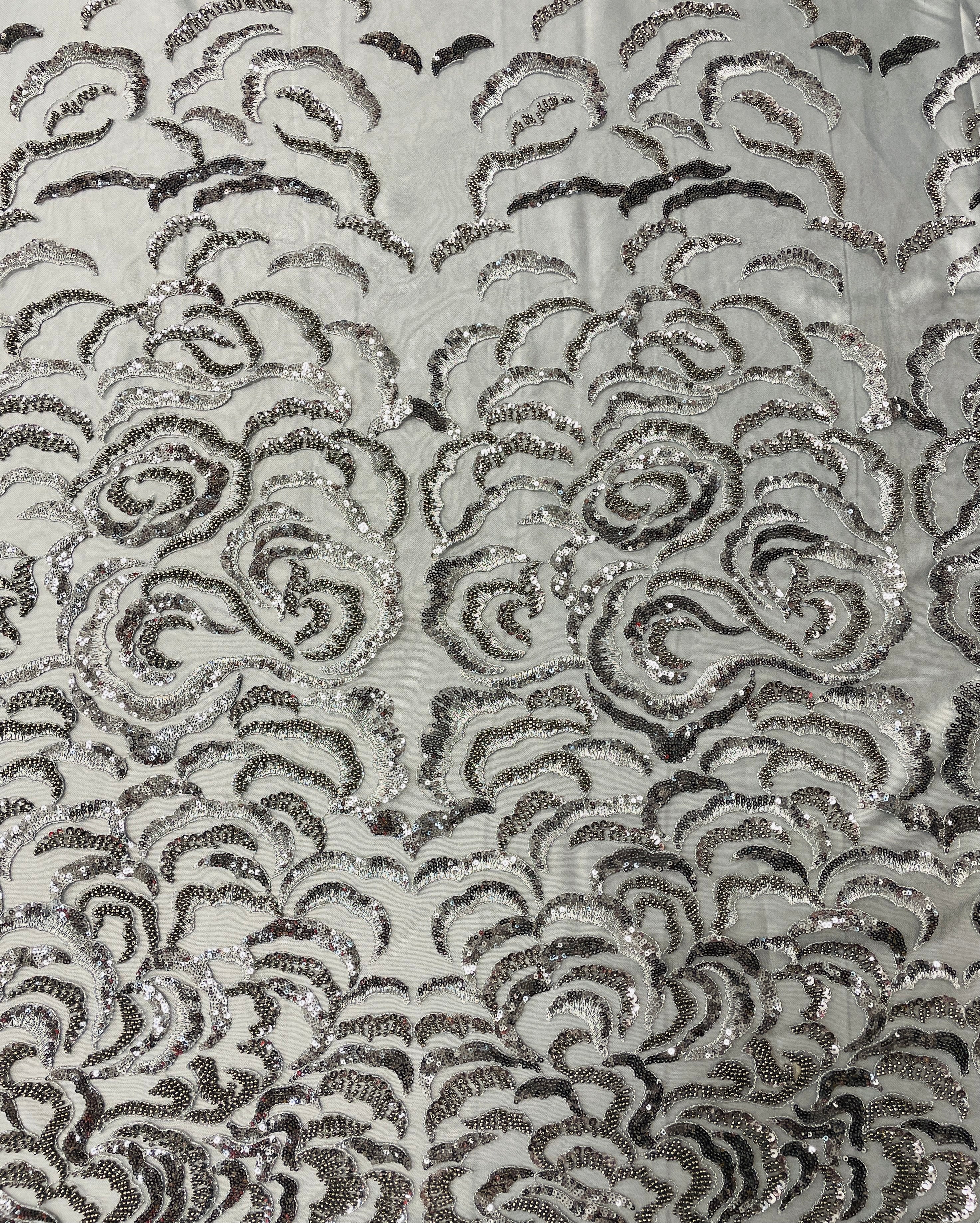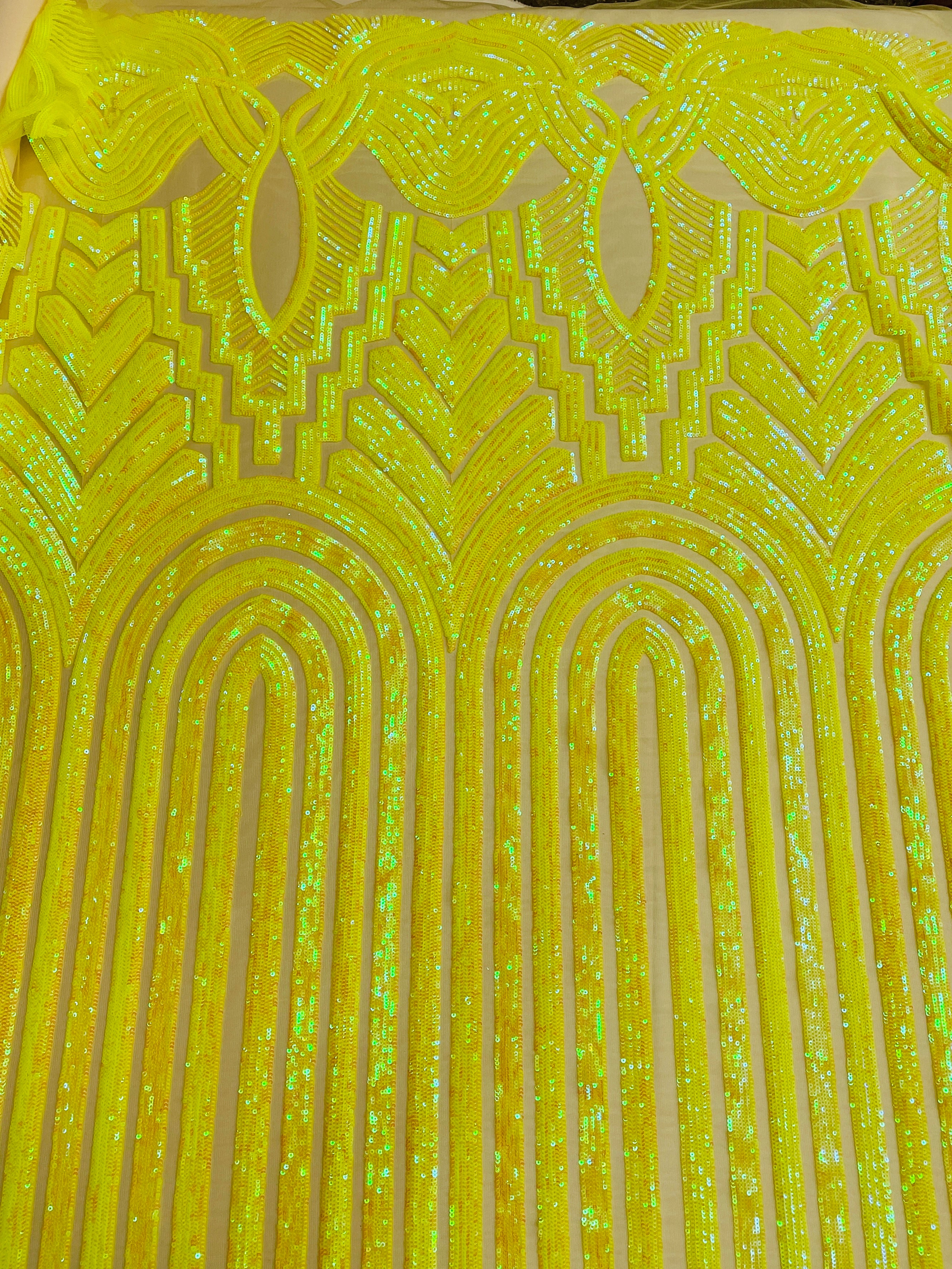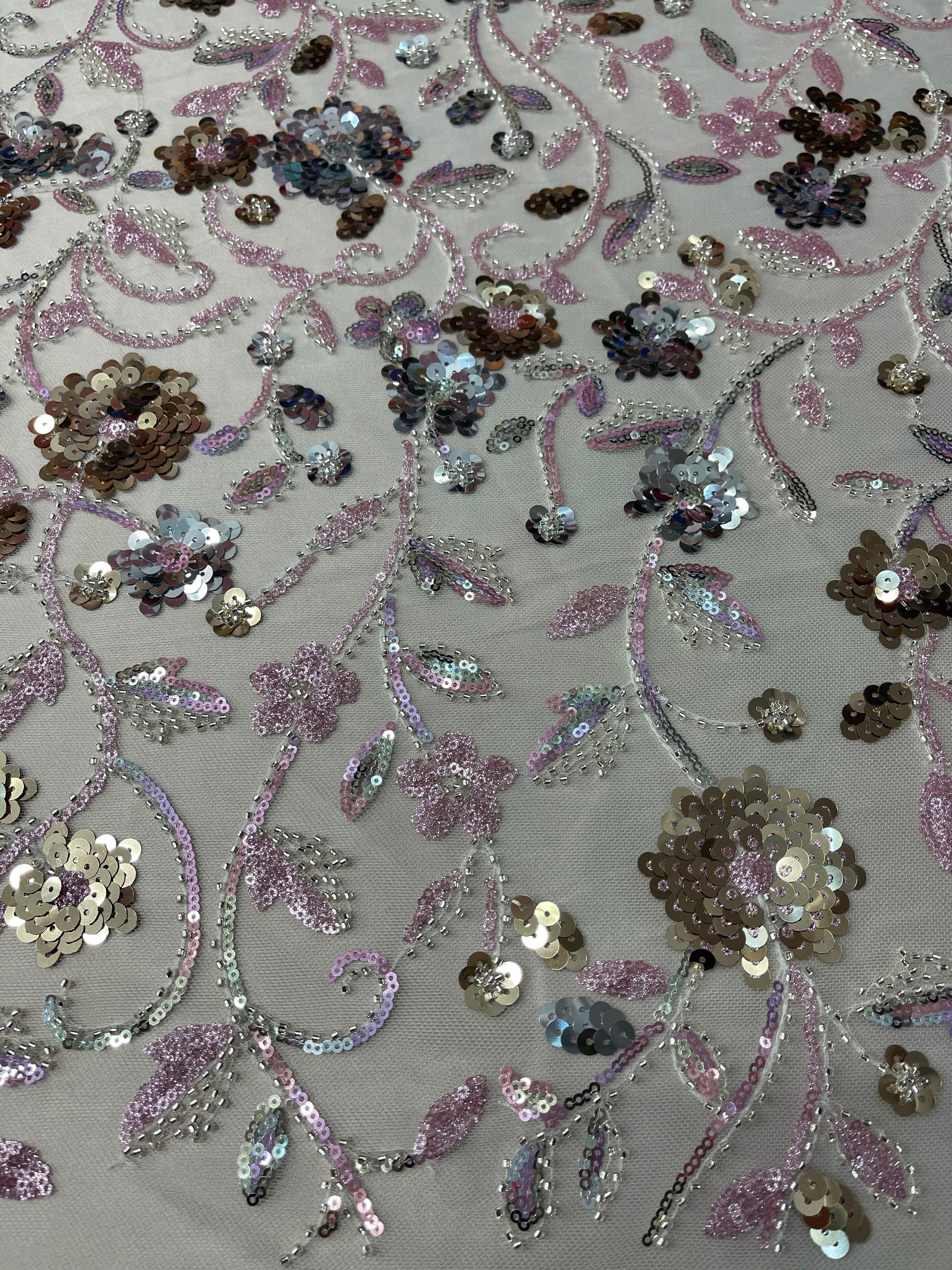 Firecracker Holographic Sequin Appliques on Nude Illusion mesh- 2 way stretch and 60" wide