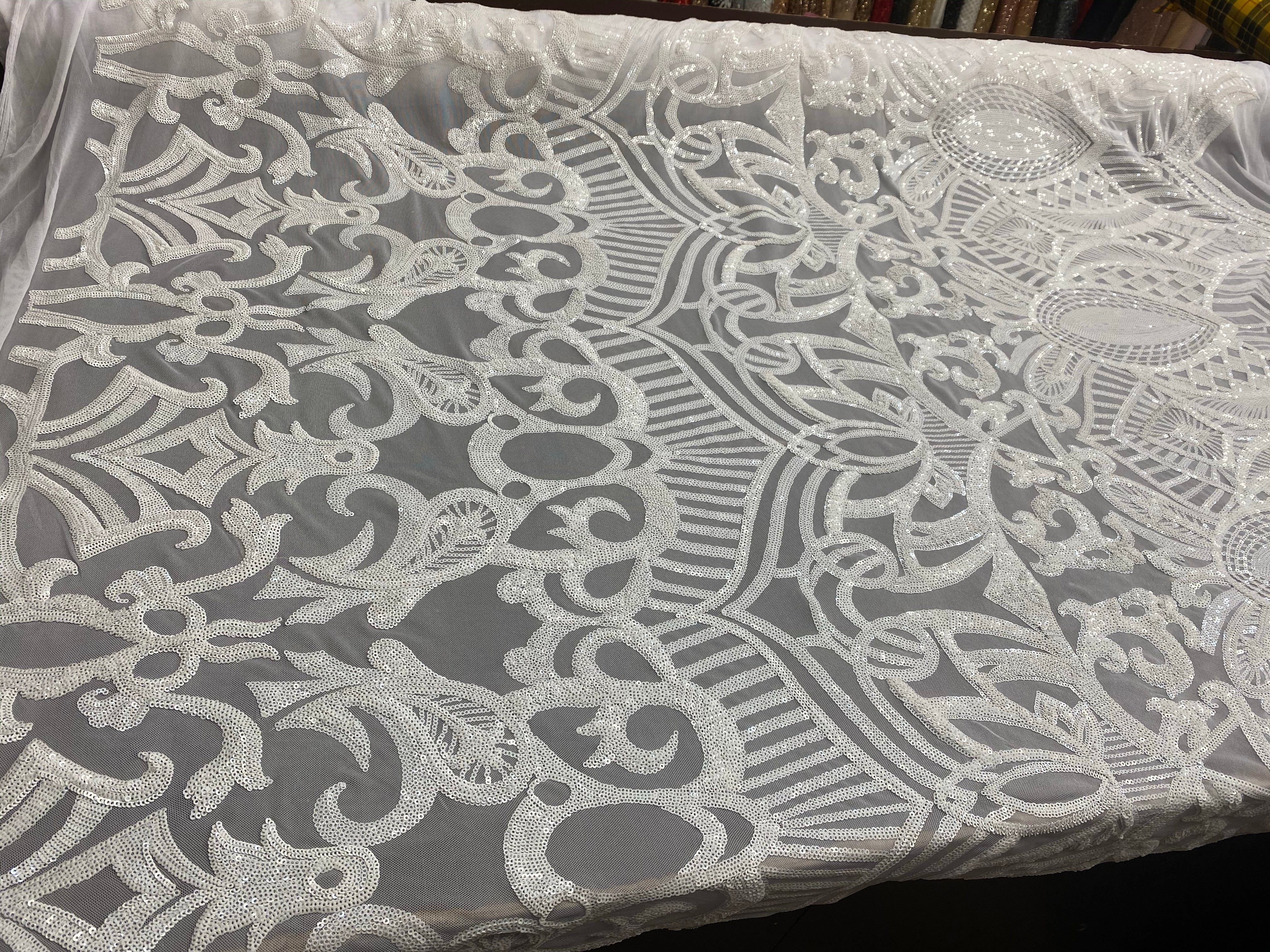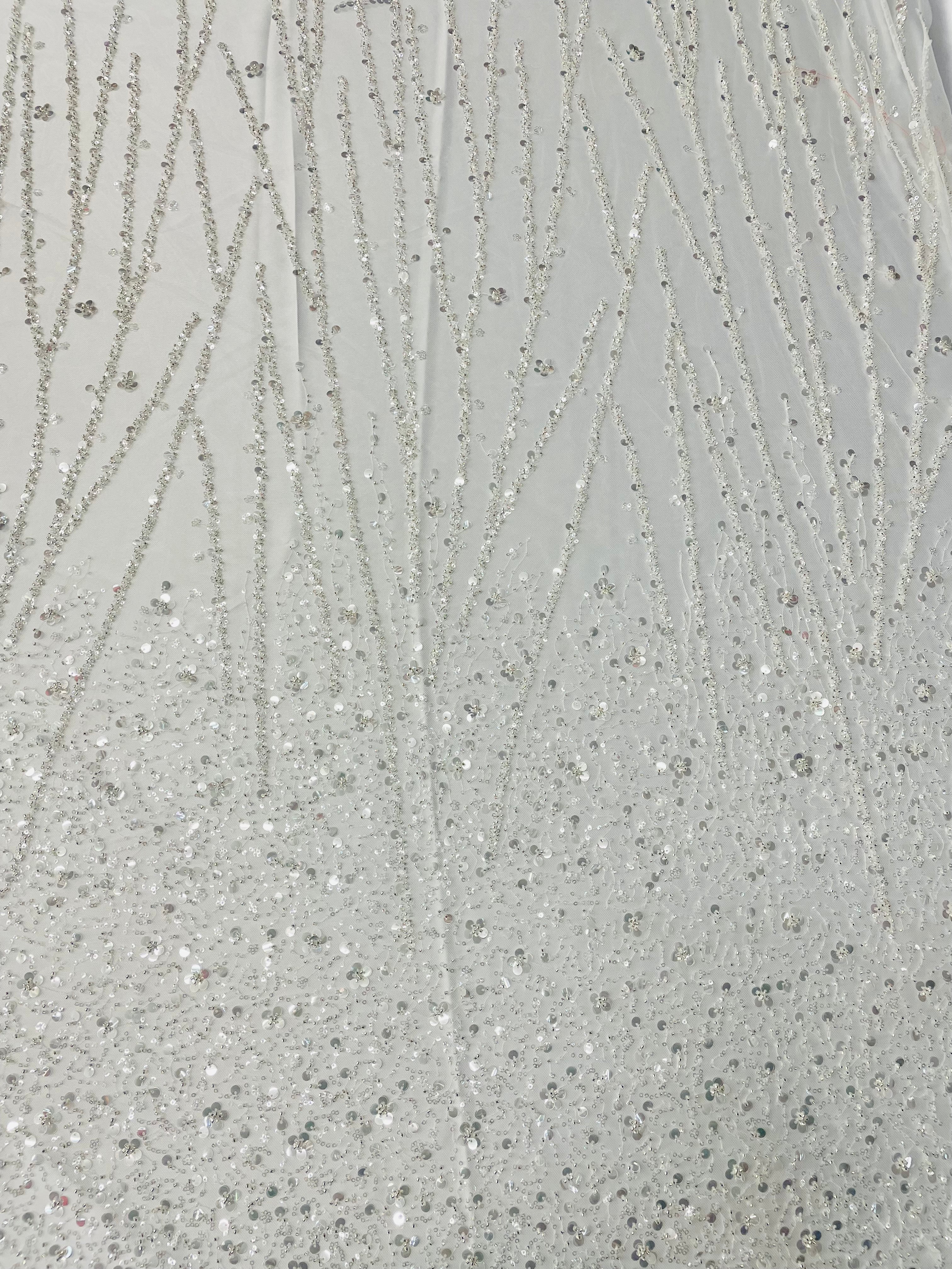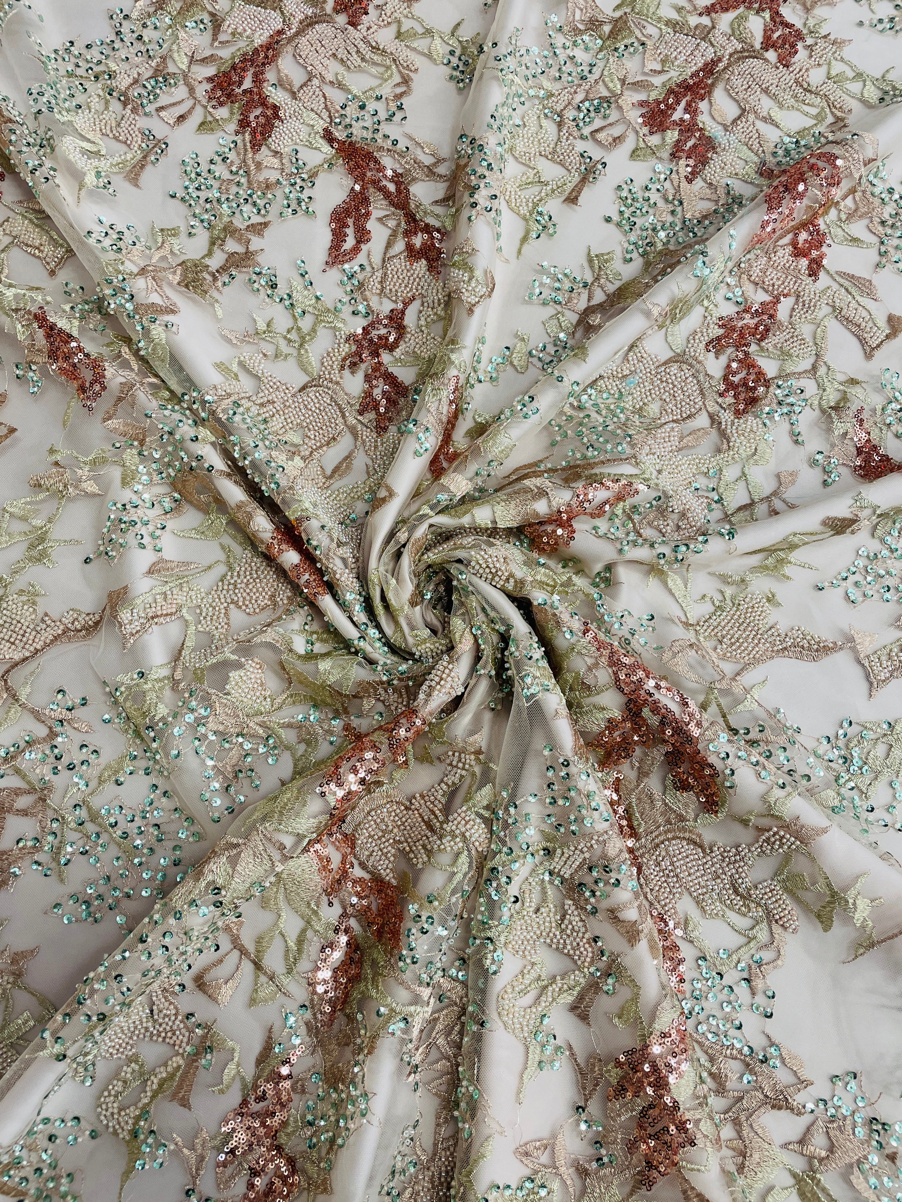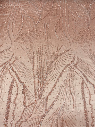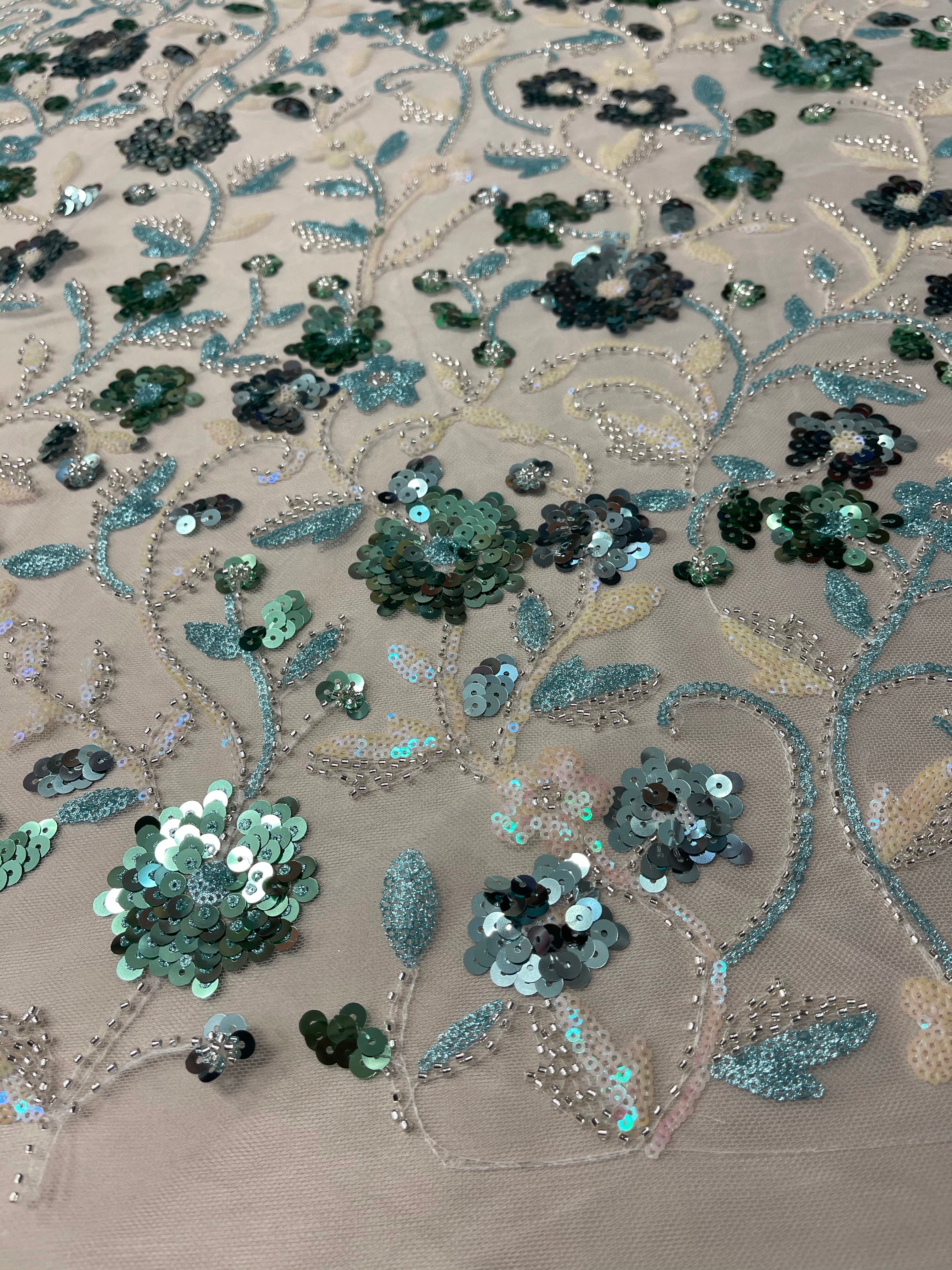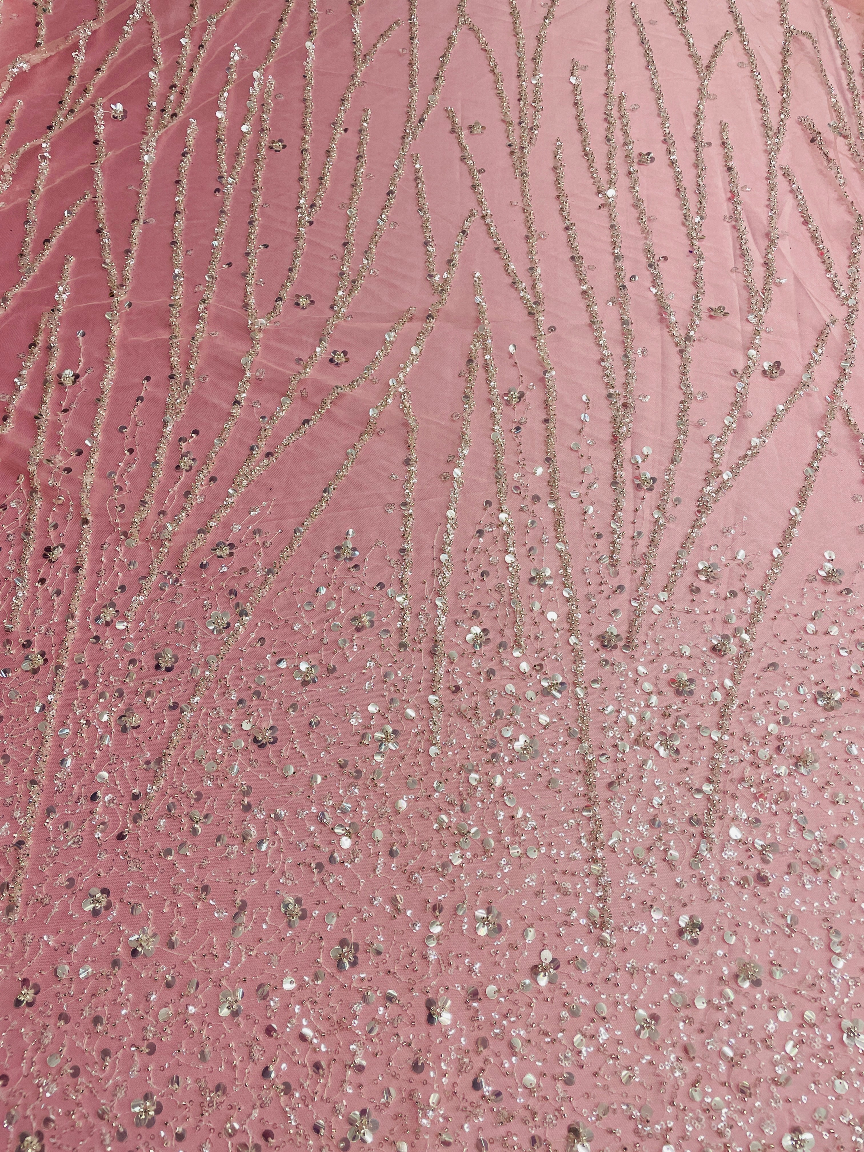 Firecracker Holographic Sequin Appliques on Nude Illusion mesh- 2 way stretch and 60" wide