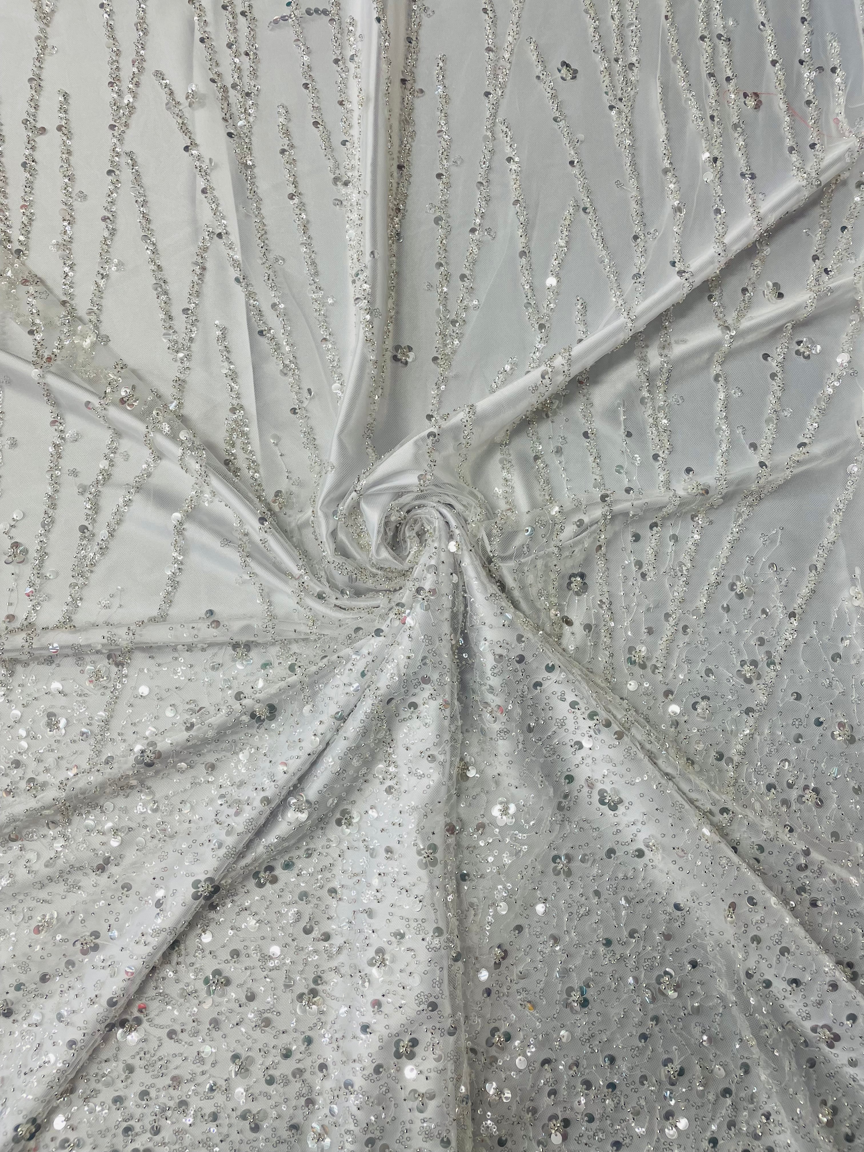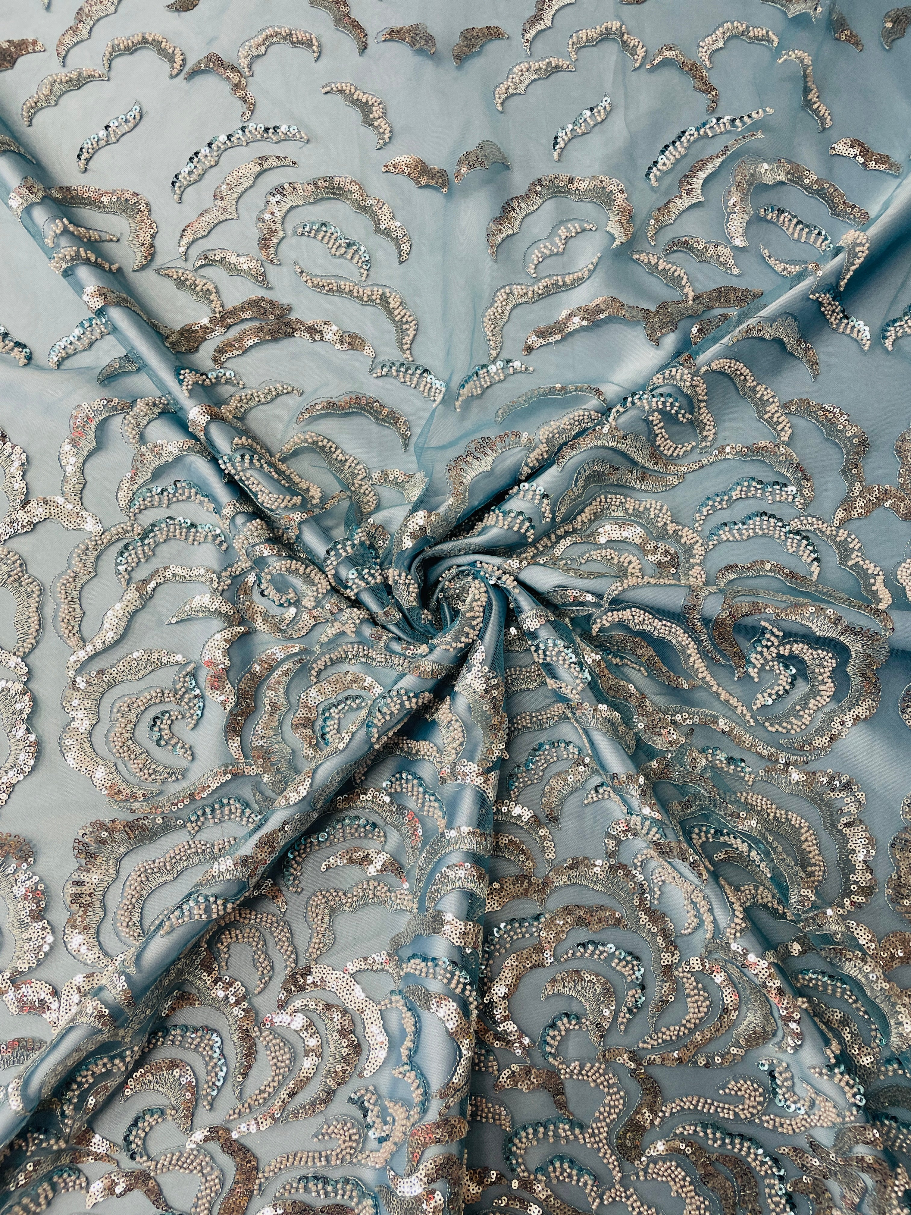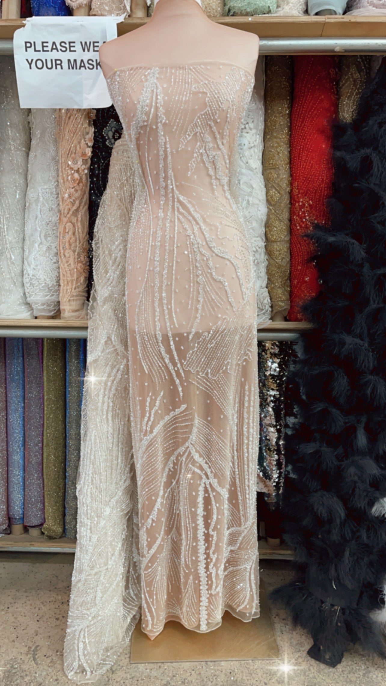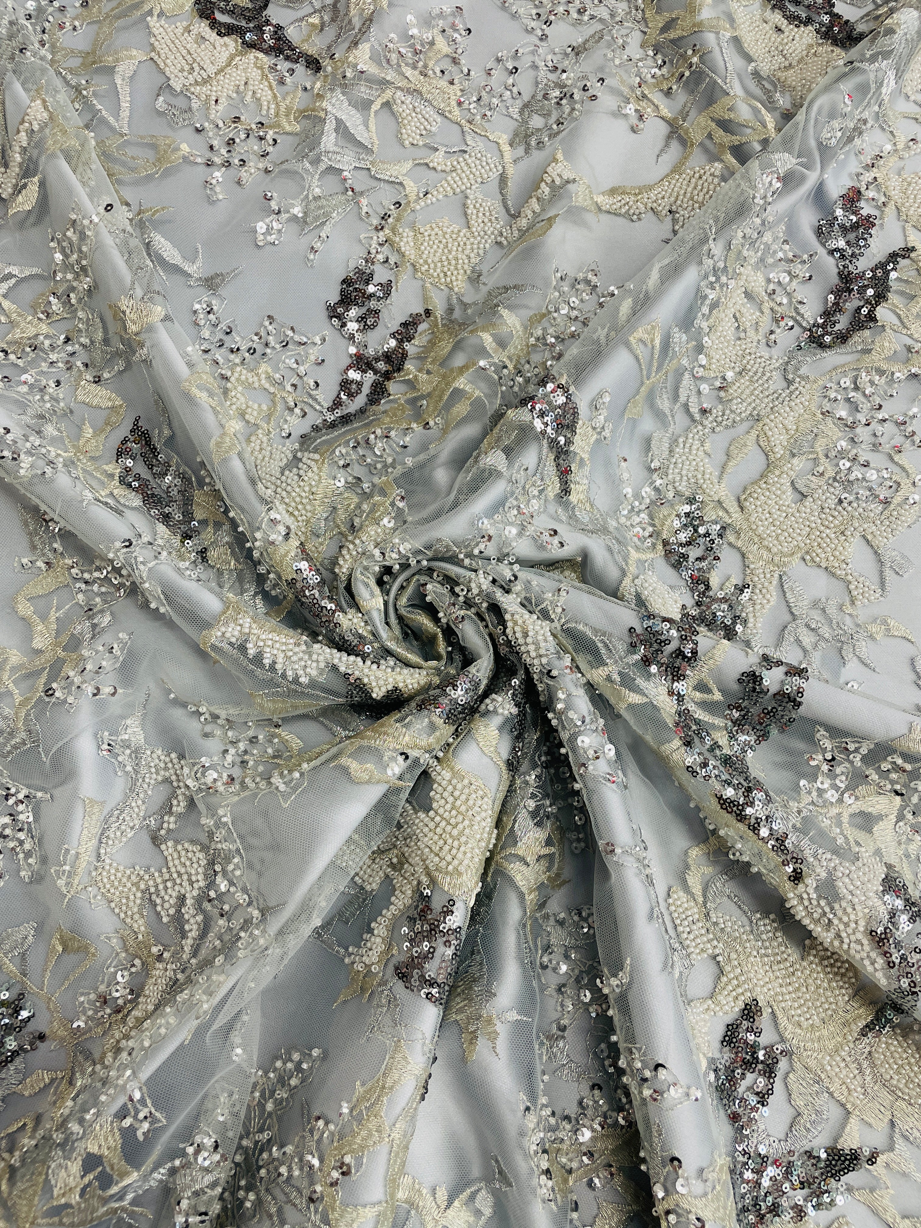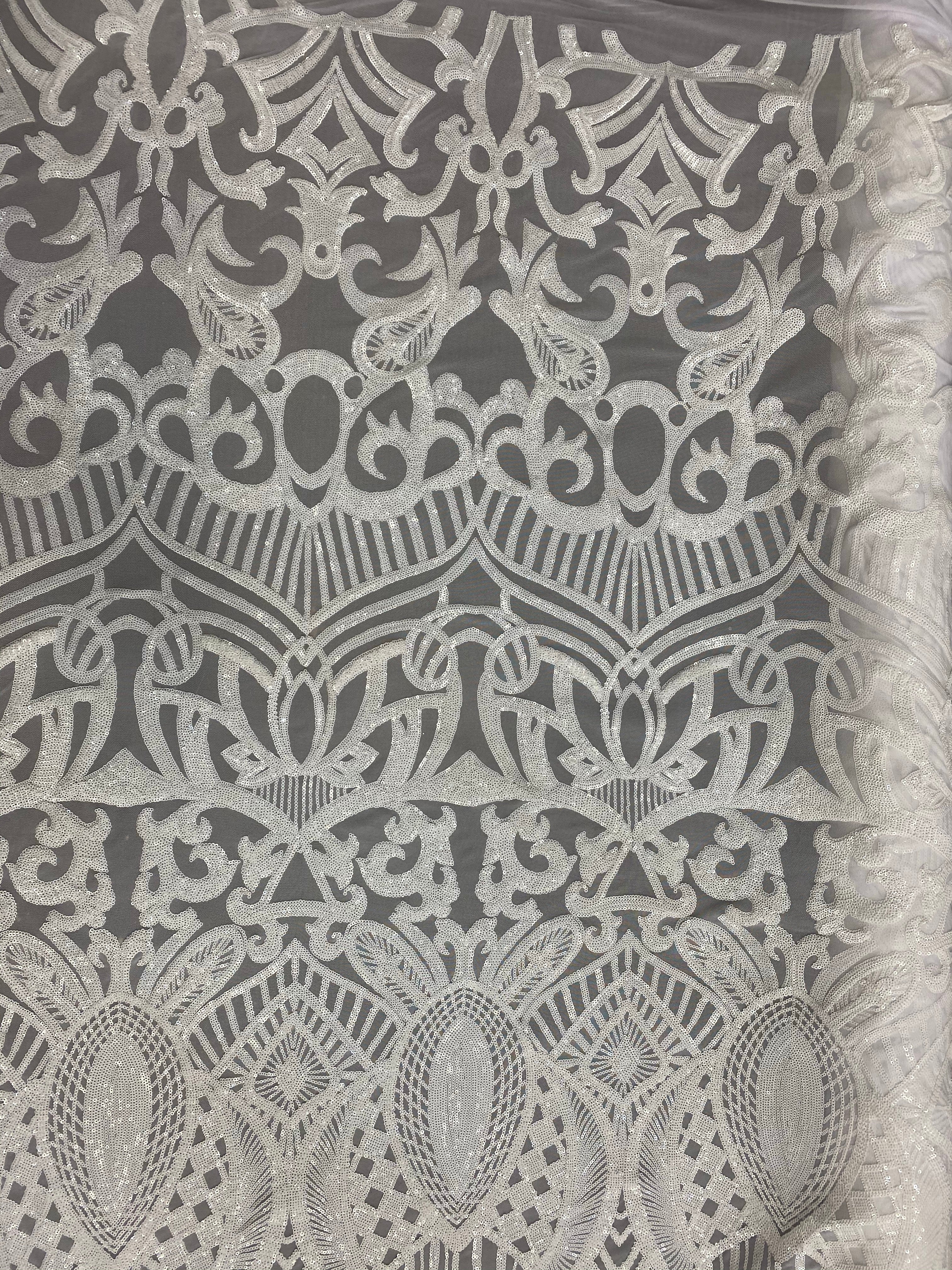 Firecracker Holographic Sequin Appliques on Nude Illusion mesh- 2 way stretch and 60" wide