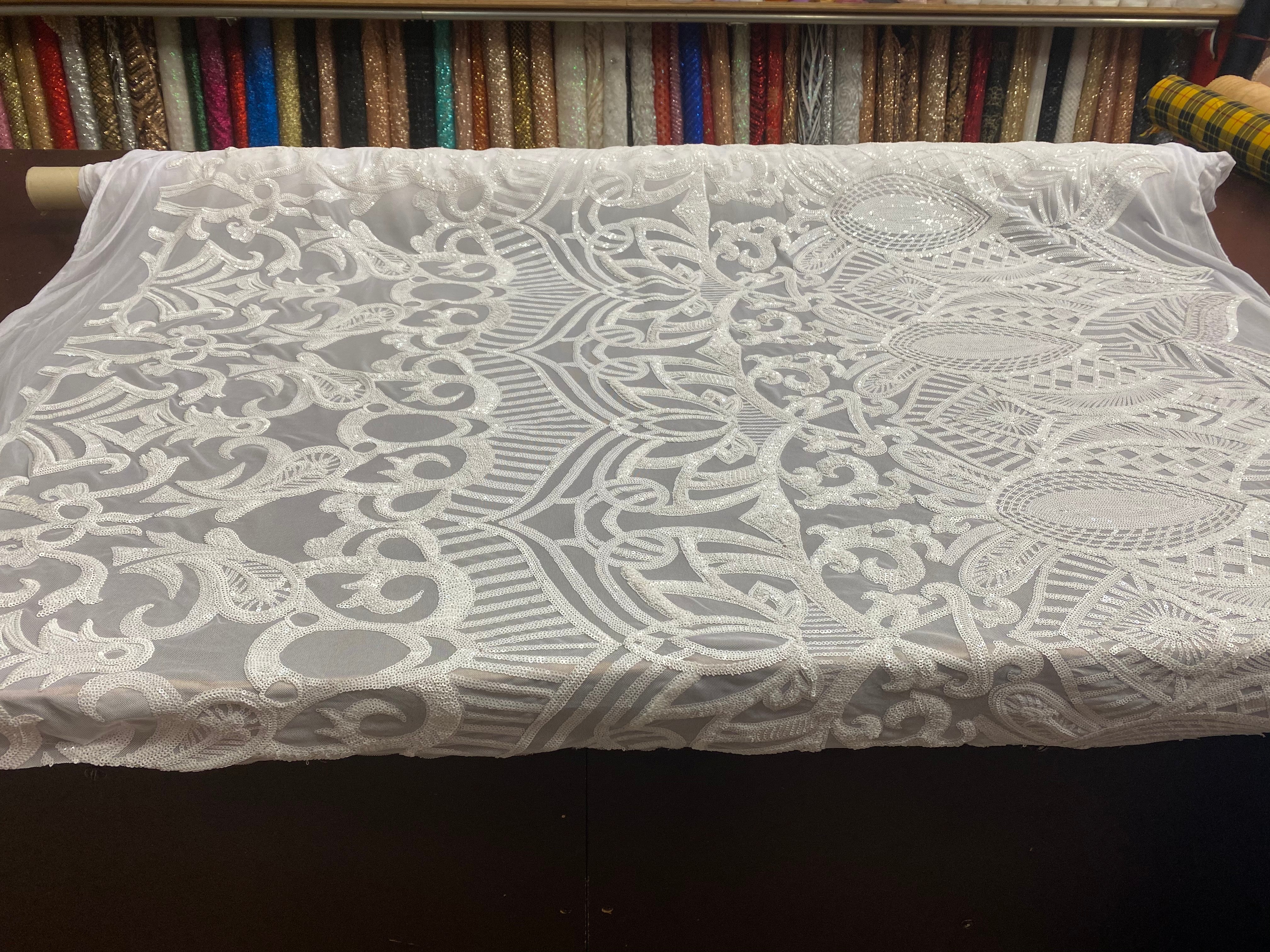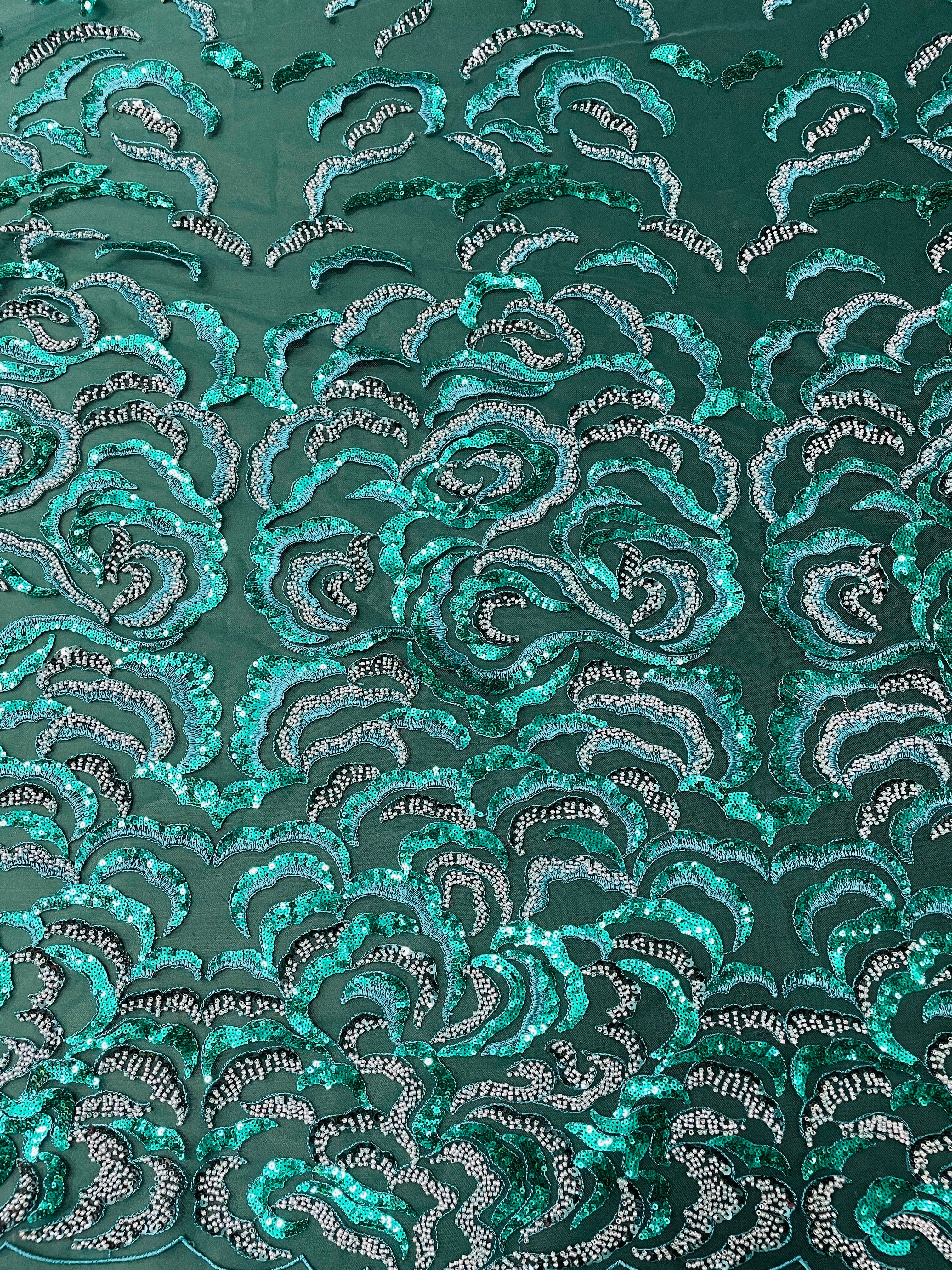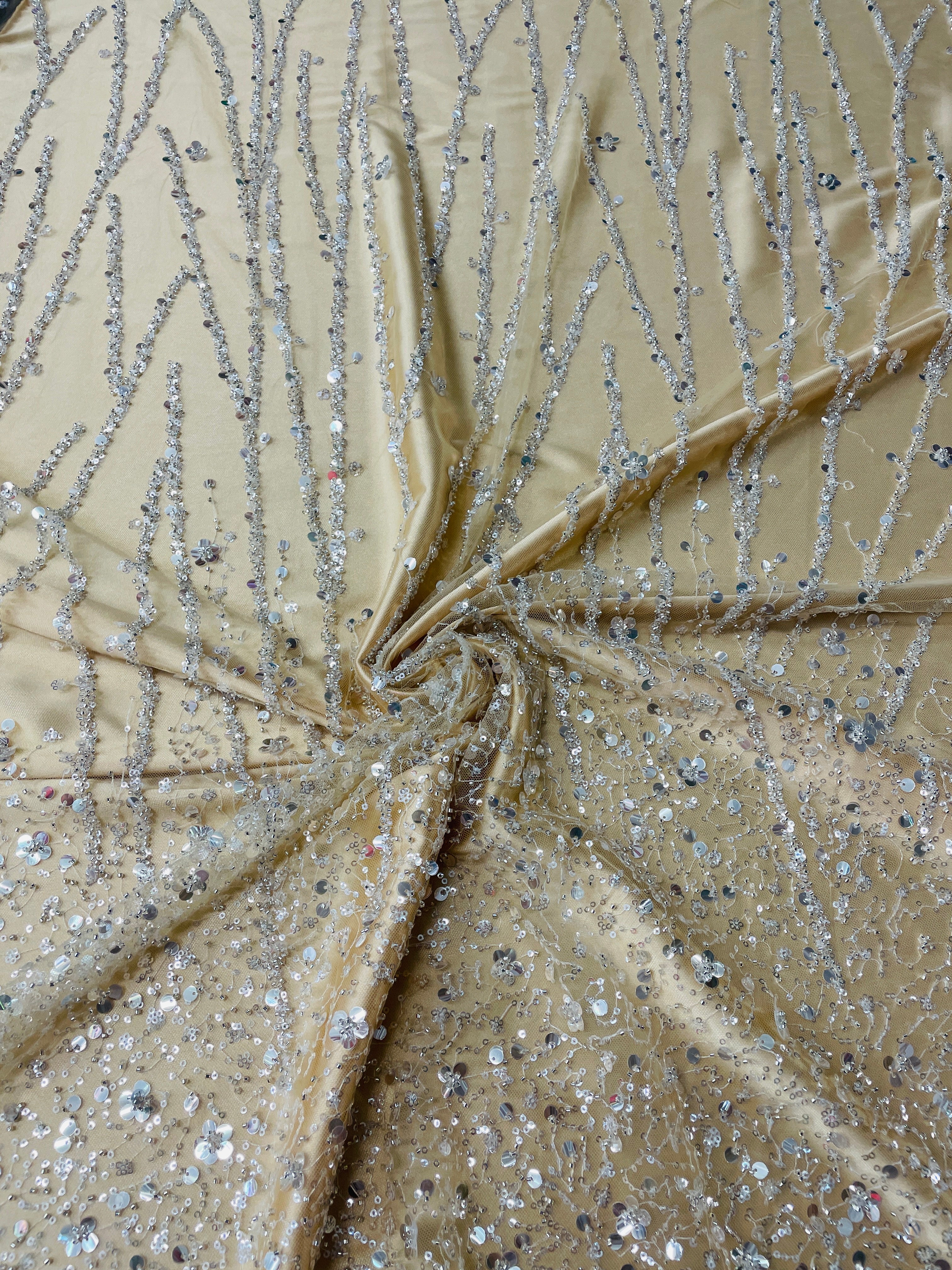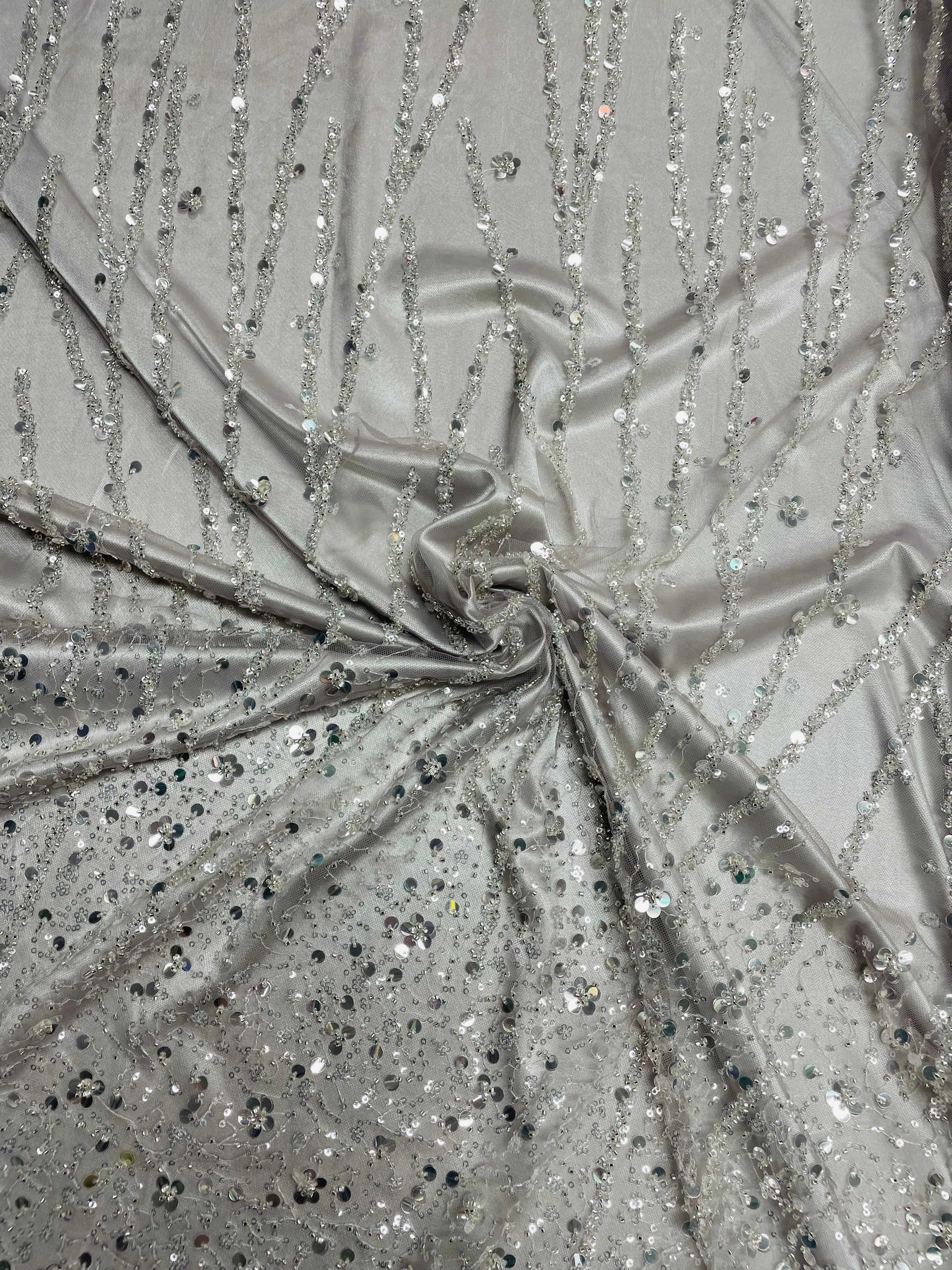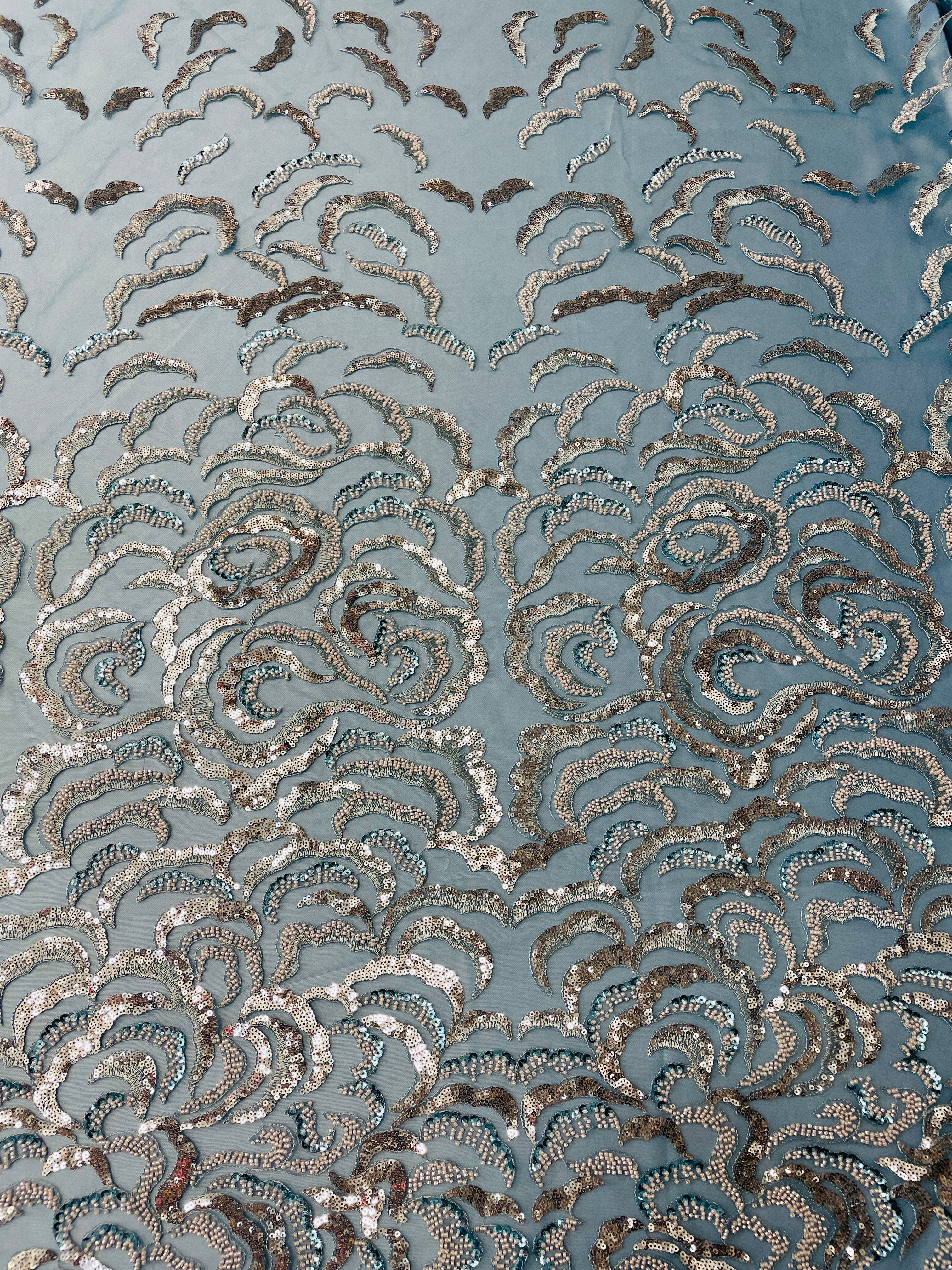 Firecracker Holographic Sequin Appliques on Nude Illusion mesh- 2 way stretch and 60" wide