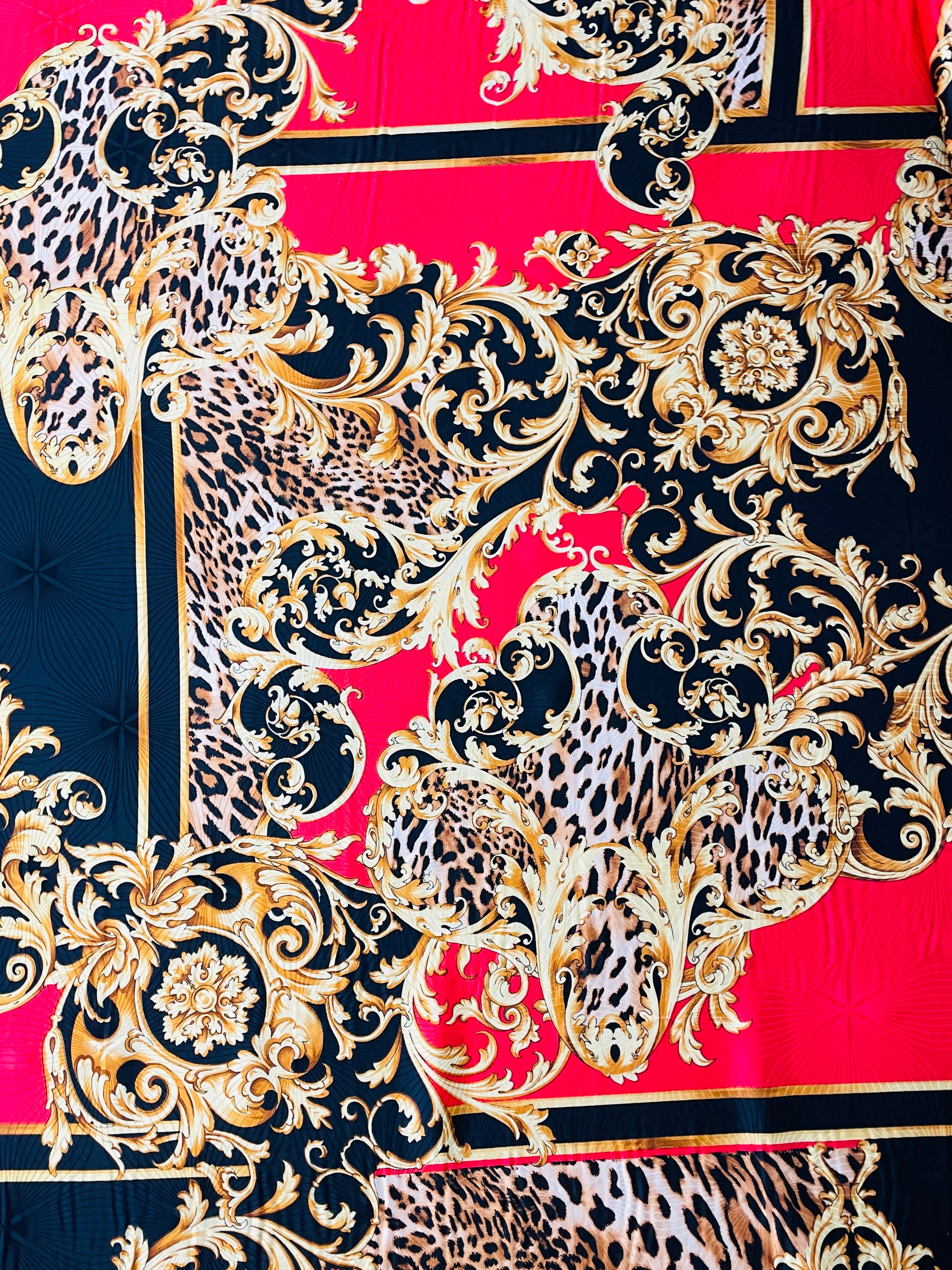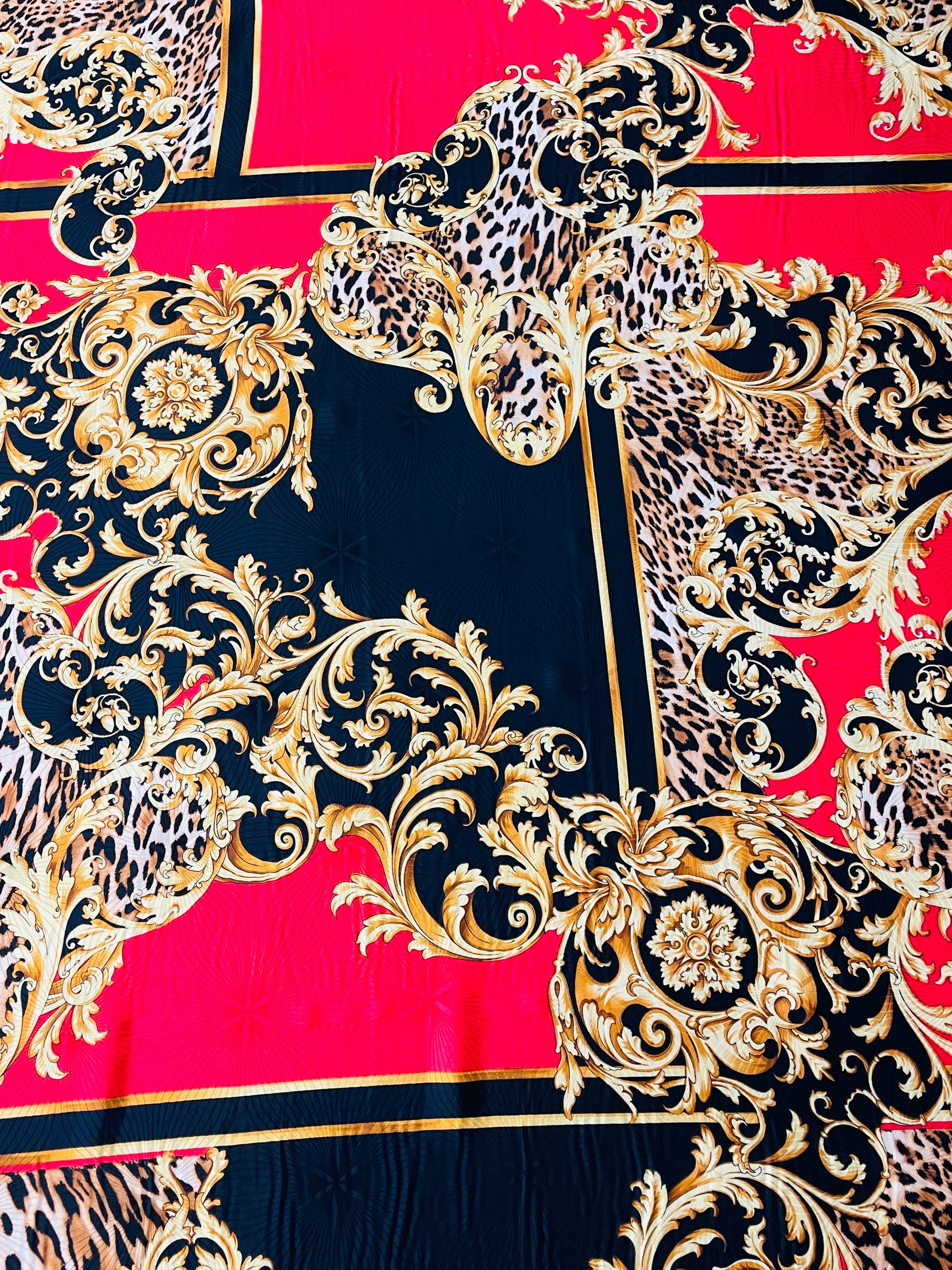 Gold leopard design on black and red square blocked silky print design 54" wide.