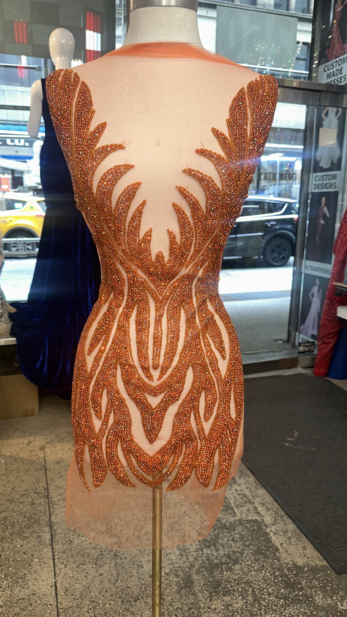 Dress applique panel with handmade beads and rhinestones on transparent mesh.