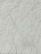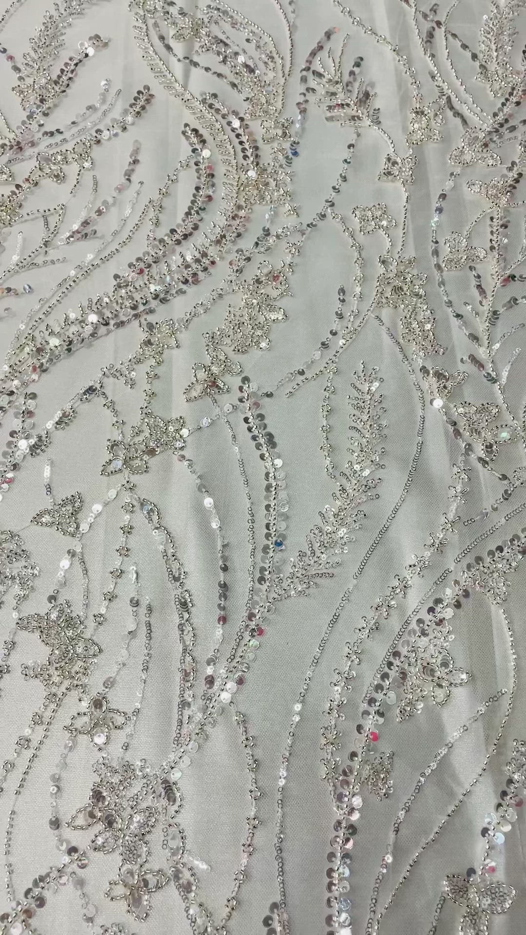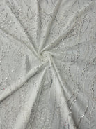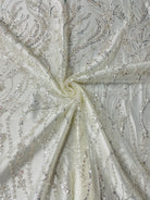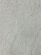 58" wide two way stretch mesh with 52" beaded design in white and ivory.