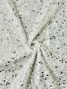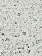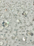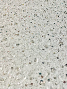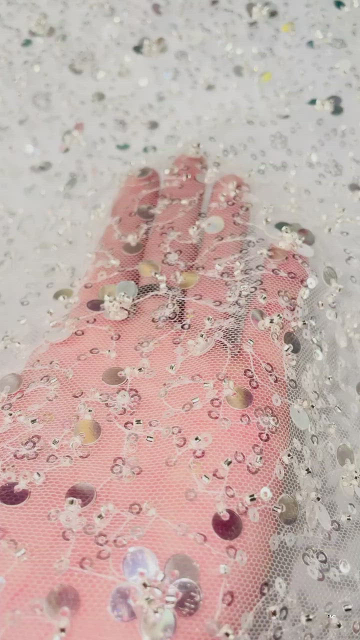 54" wide sequin design on 60" two way vertical stretch transparent mesh.