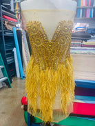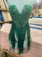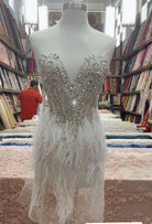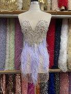 Hand beaded applique dress panel with rhinestones, sequins, beads and feather trim on two way stretch illusion mesh.