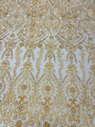 Beaded embroidery fabric on non stretch transparent mesh 52" wide photographed over light gold satin.