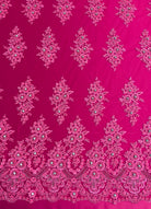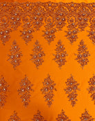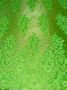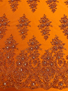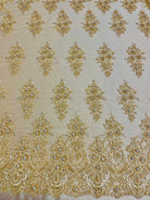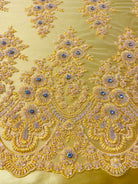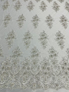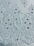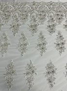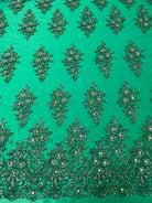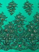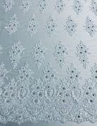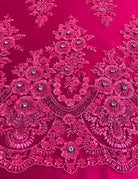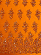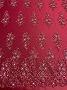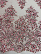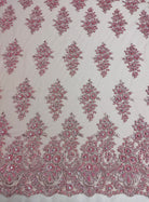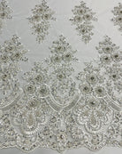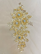 Hand beaded and rhinestoned applique flowers on sheer mesh with symmetrical arch edge trim. 54" wide with a slight vertical two way stretch.
