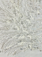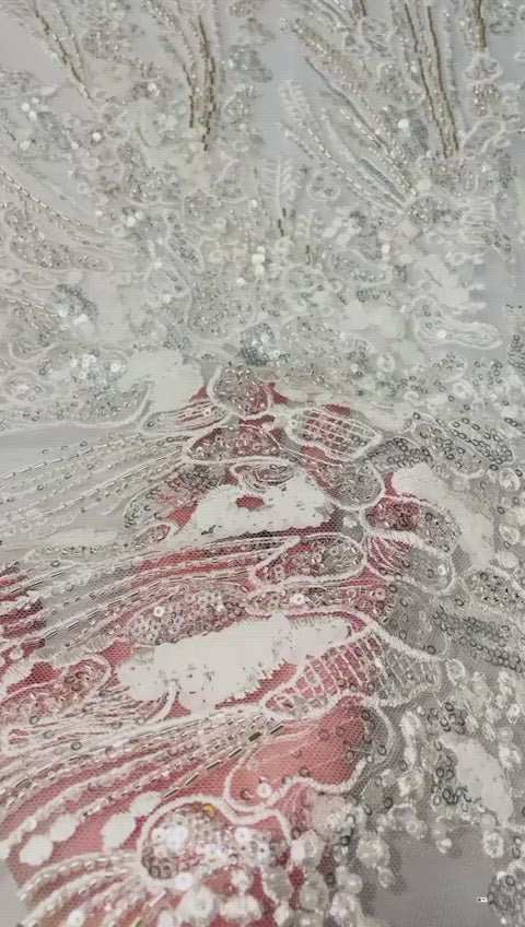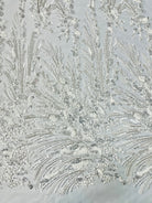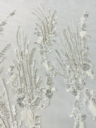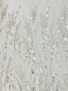 Hand beaded ombre branch design with embroidery and sequins. The beaded design is 50" wide on 60" wide two way vertical stretch transparent mesh.