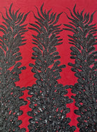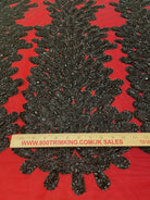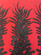Black peacock shape hand beaded applique panel photographed on contrast red satin. The design is on black transparent mesh 54" wide and the design is 48" vertical and 11 inches horizontal at the widest near the bottom. You can buy it by the panel or by the yard. IF you buy by panel it's $40/panel or 3panels for one yard $100
