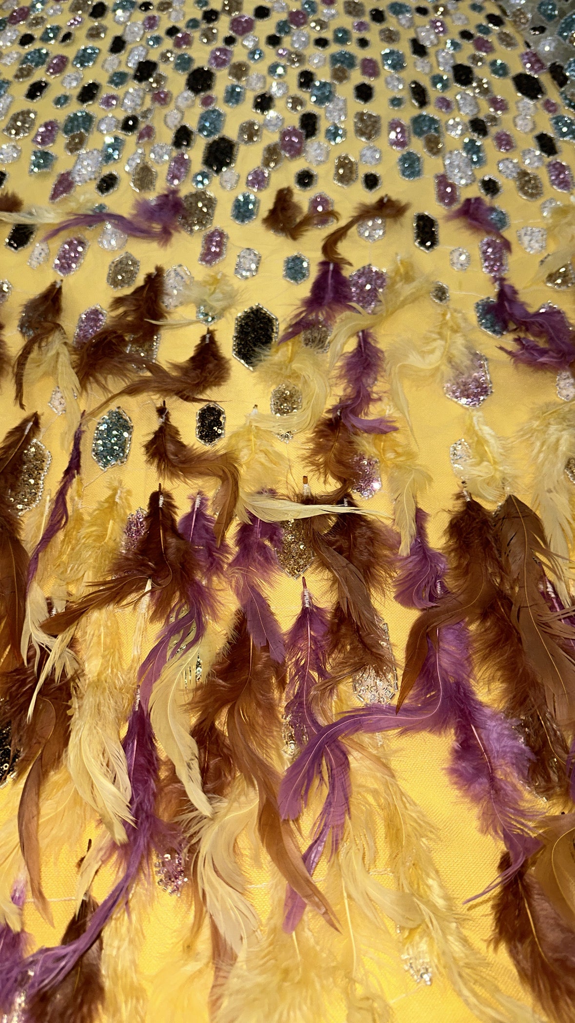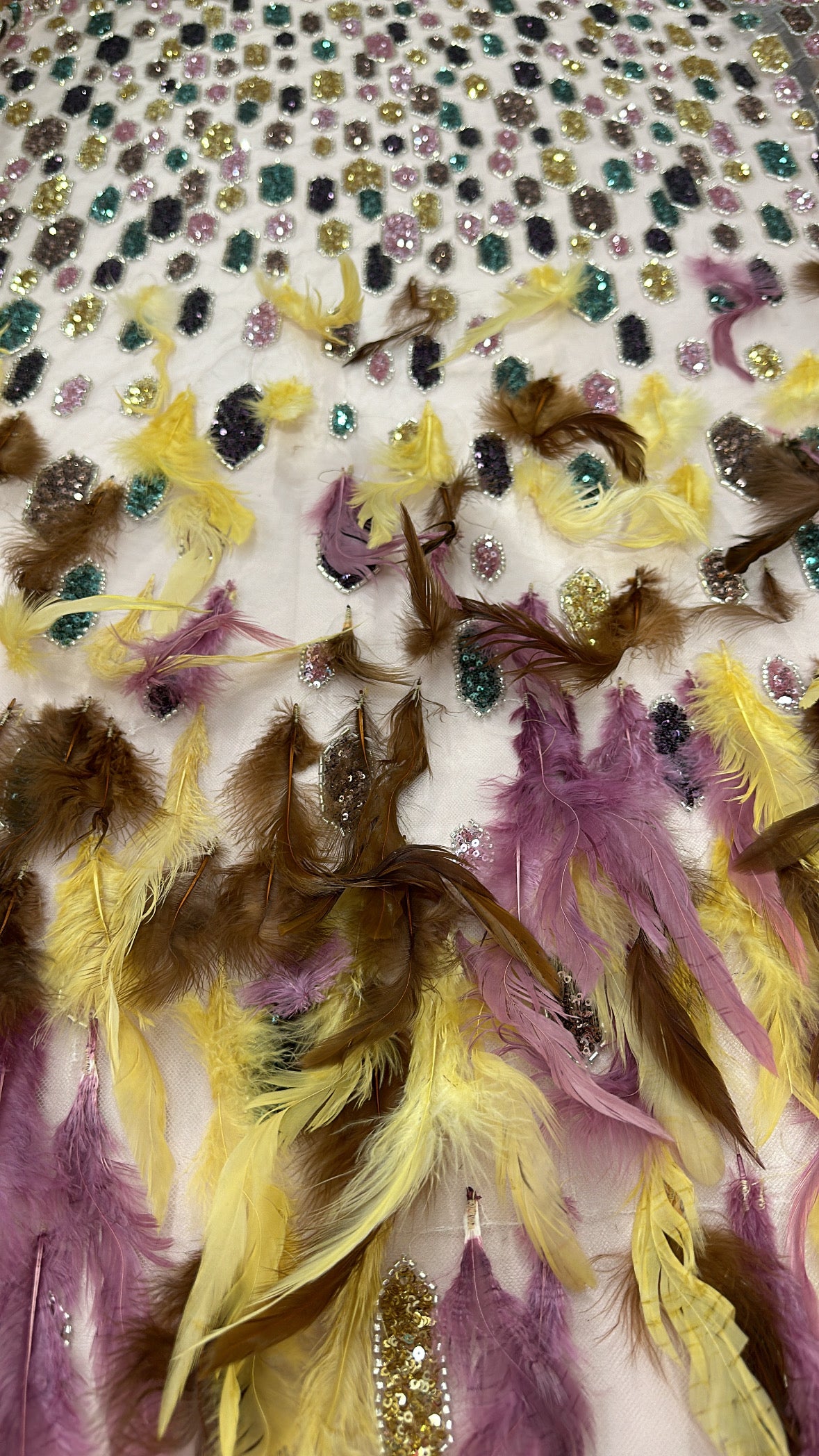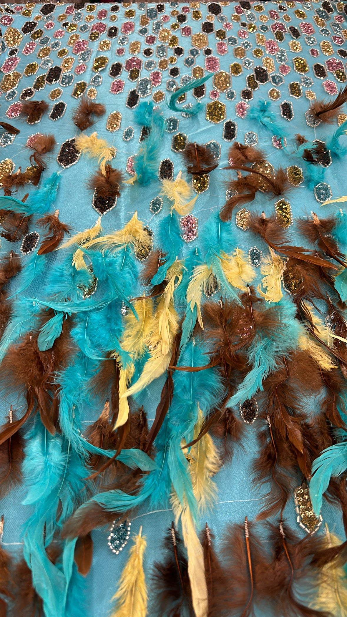 This combination creates an intricate and elegant design, blending the airy, intricate patterns of lace with the soft, ethereal qualities of feathers.